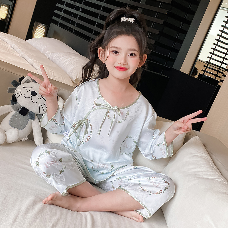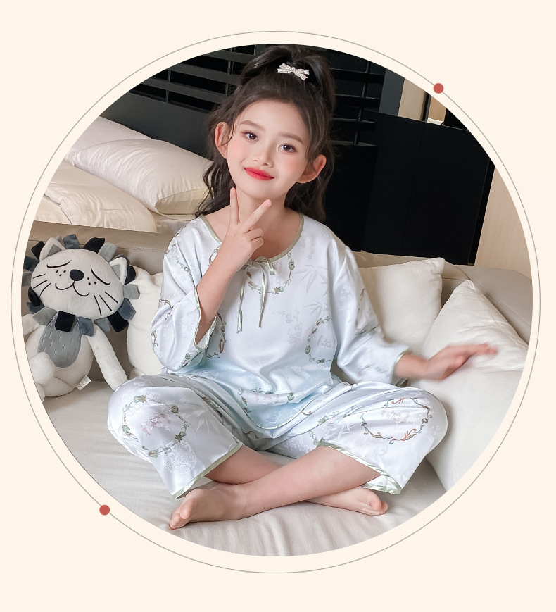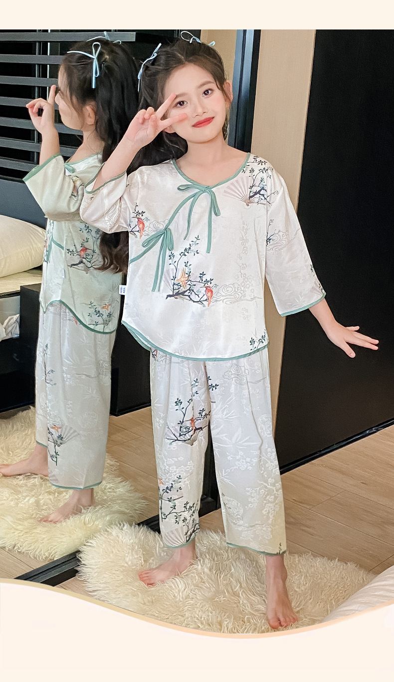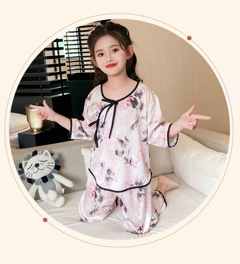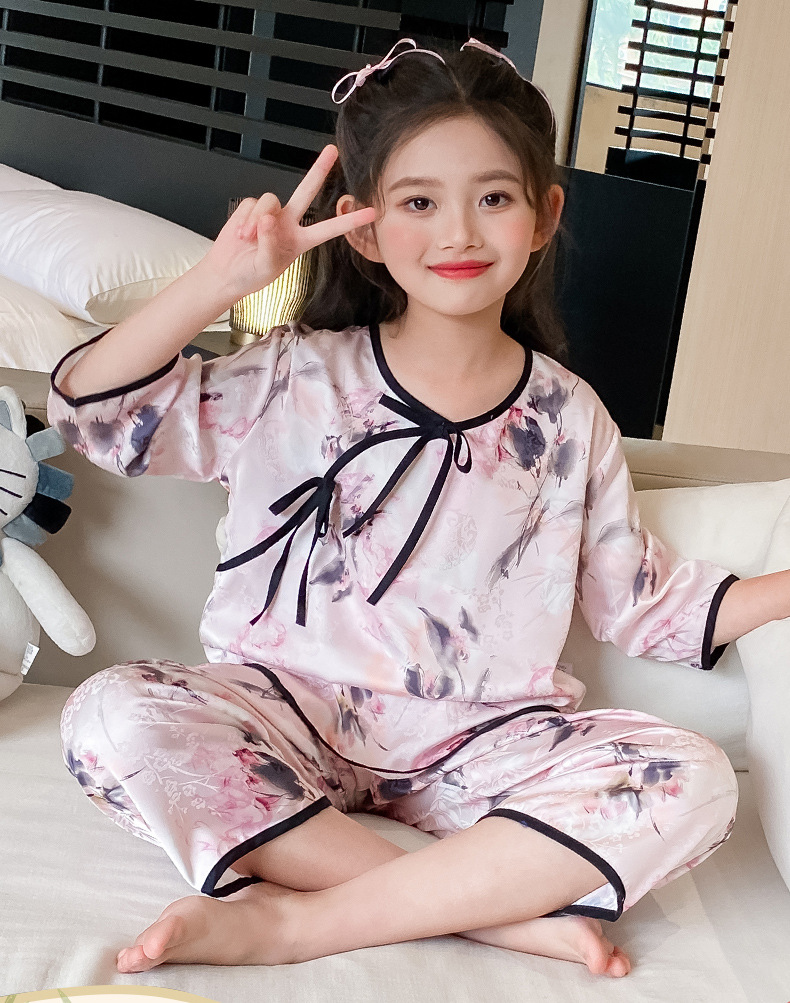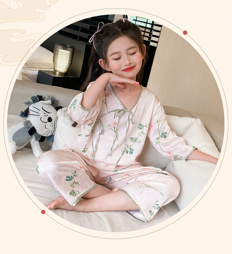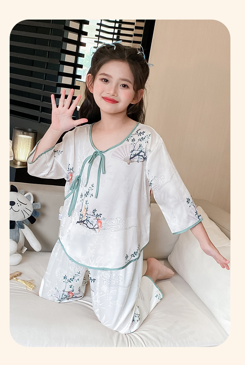 소녀의 여름 얇은 중국 스타일 잠옷 어린이 아이스 실크 반소매 홈 착용 세트 여름 에어컨 옷 투피스 세트