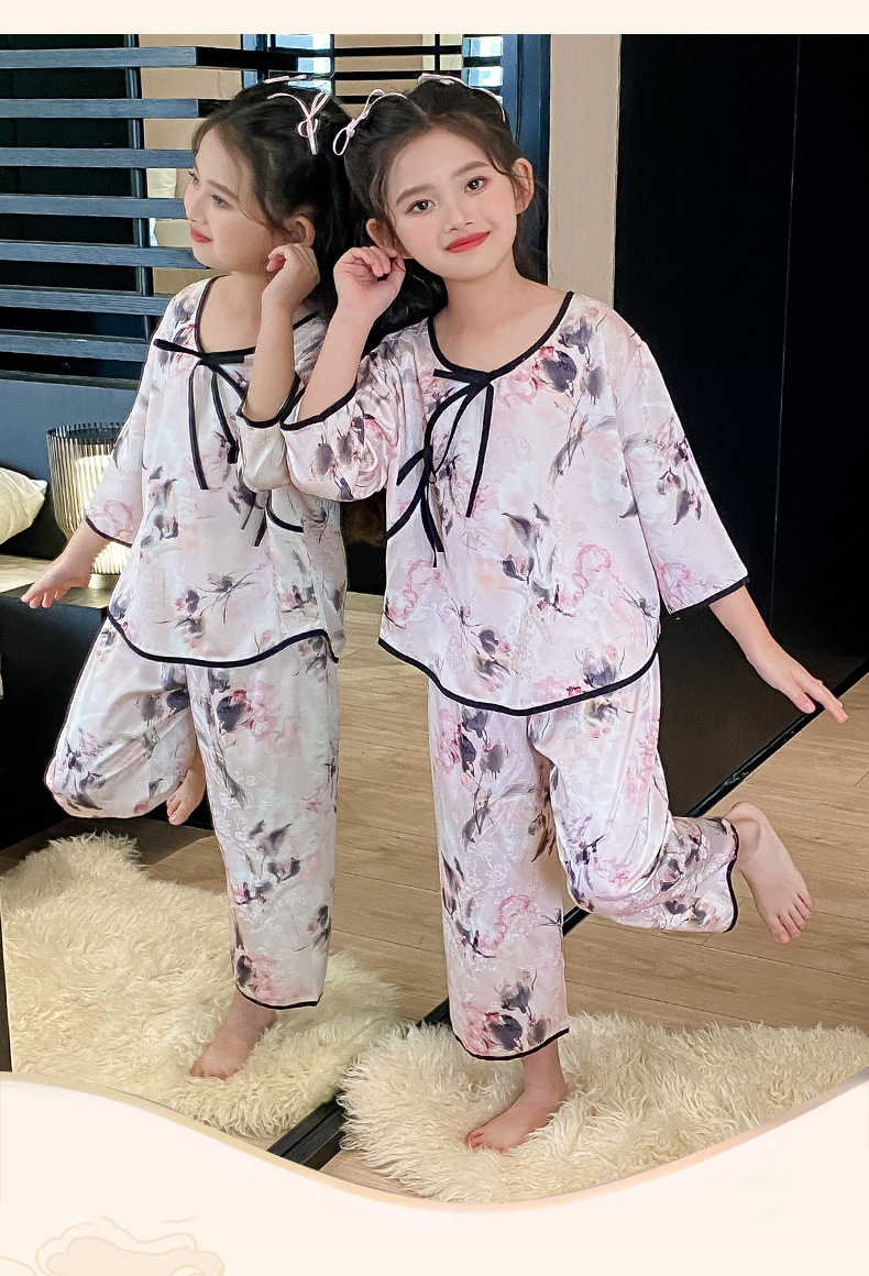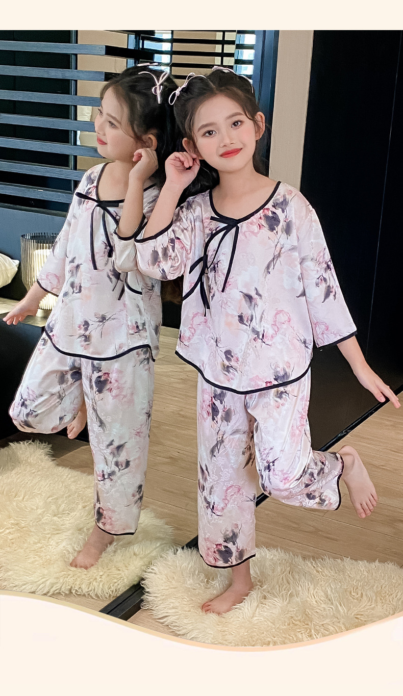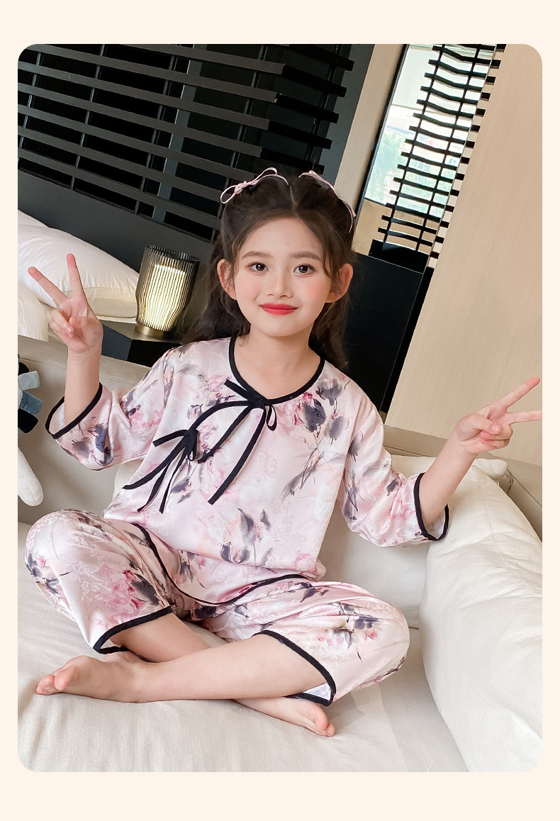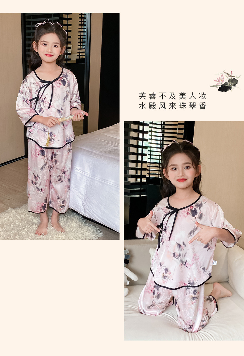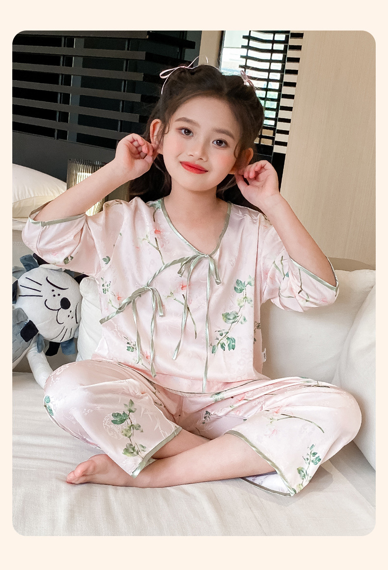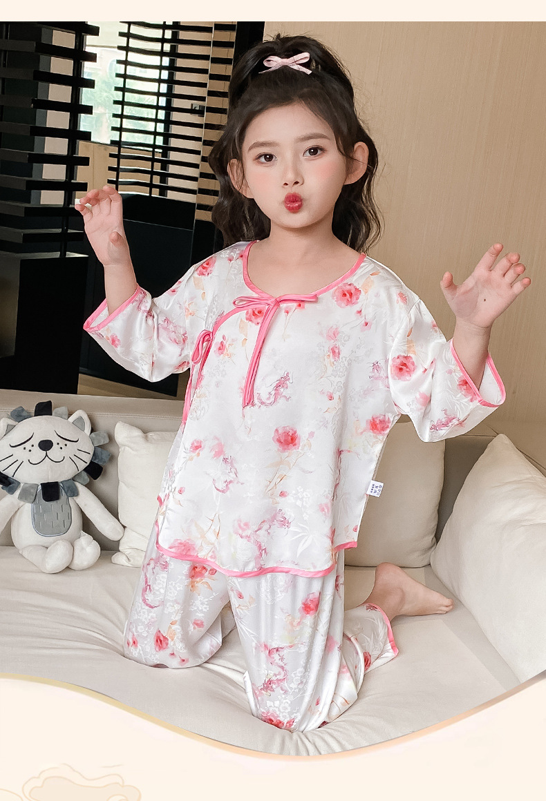 소녀의 여름 얇은 중국 스타일 잠옷 어린이 아이스 실크 반소매 홈 착용 세트 여름 에어컨 옷 투피스 세트