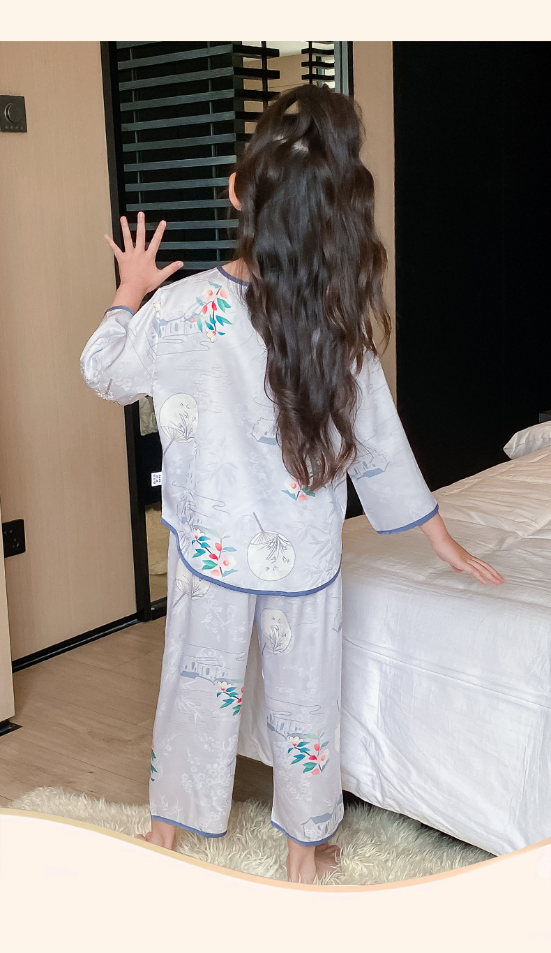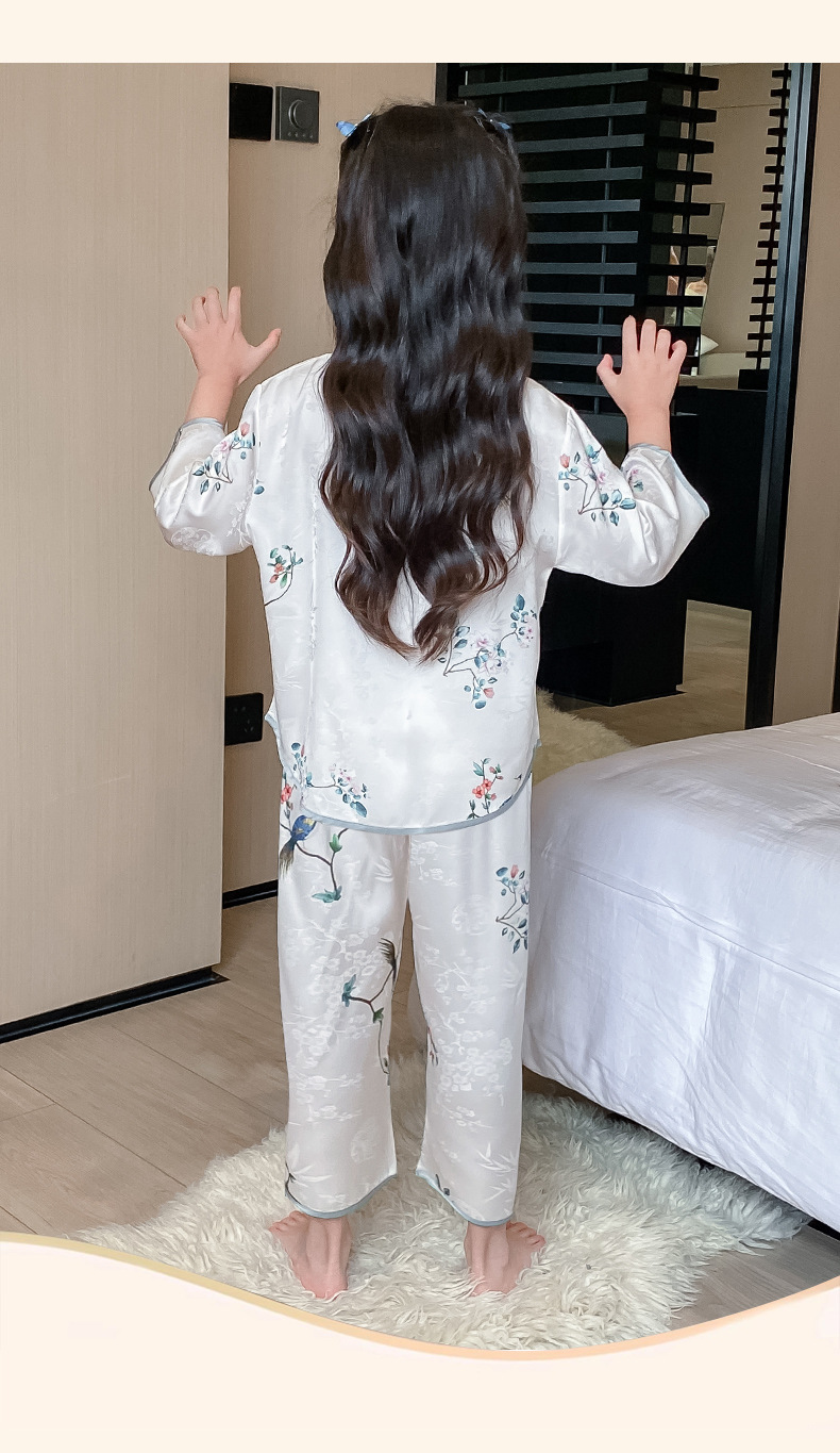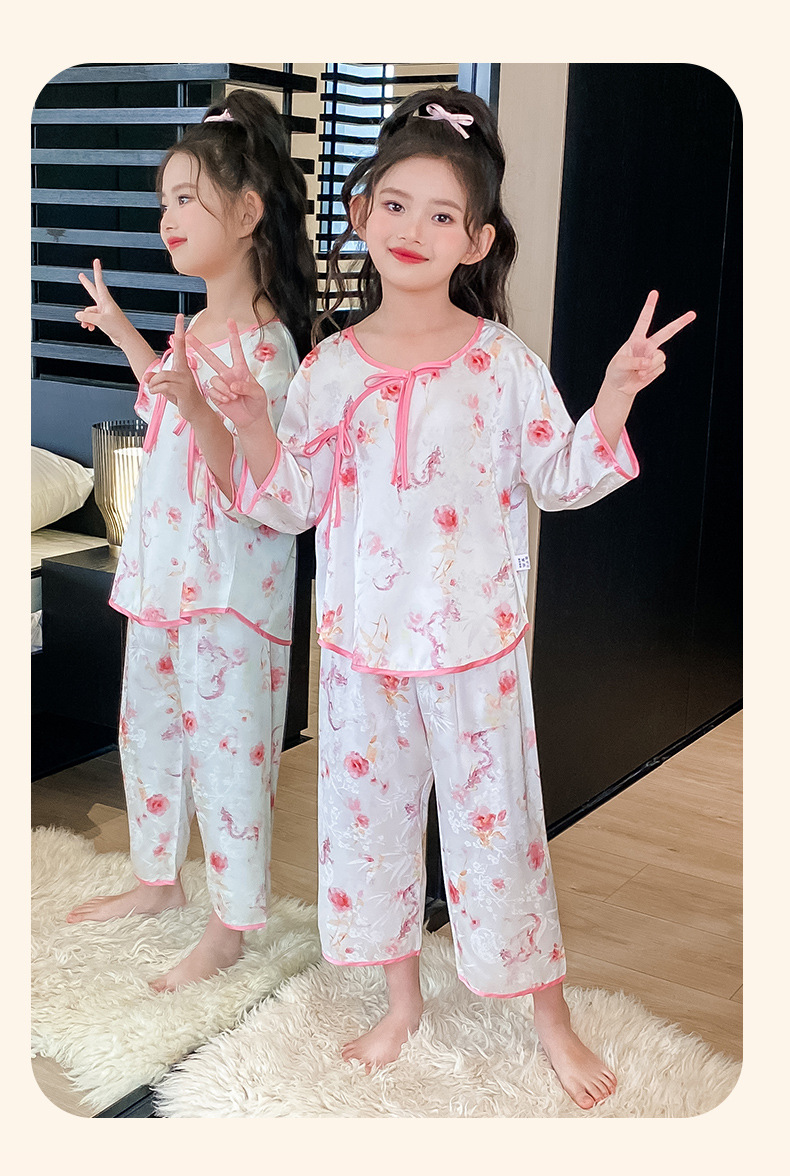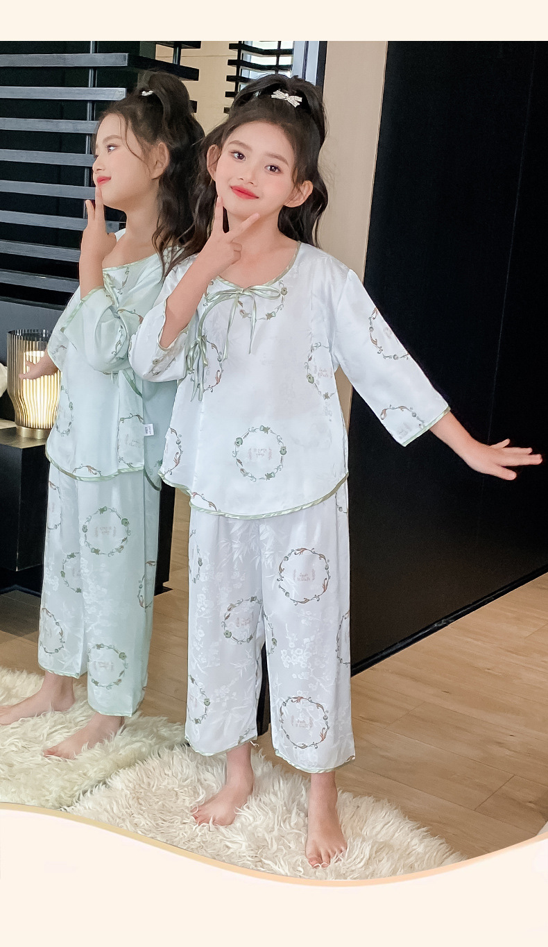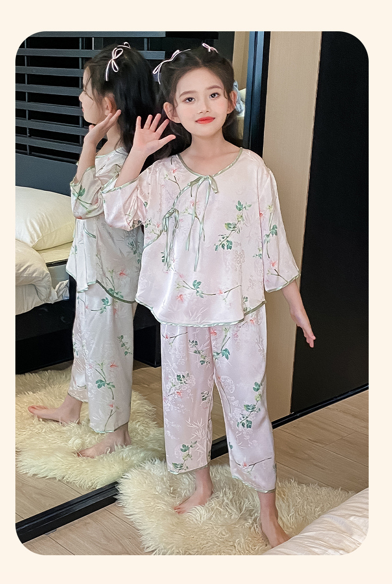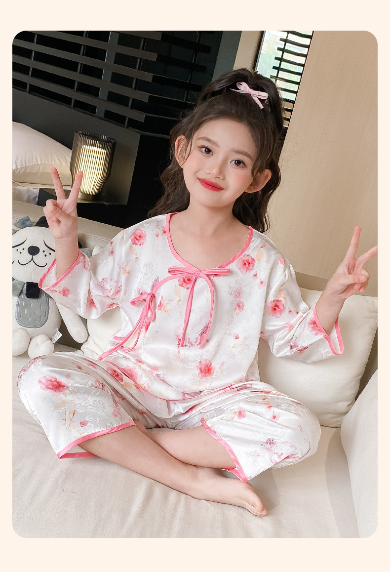 소녀의 여름 얇은 중국 스타일 잠옷 어린이 아이스 실크 반소매 홈 착용 세트 여름 에어컨 옷 투피스 세트