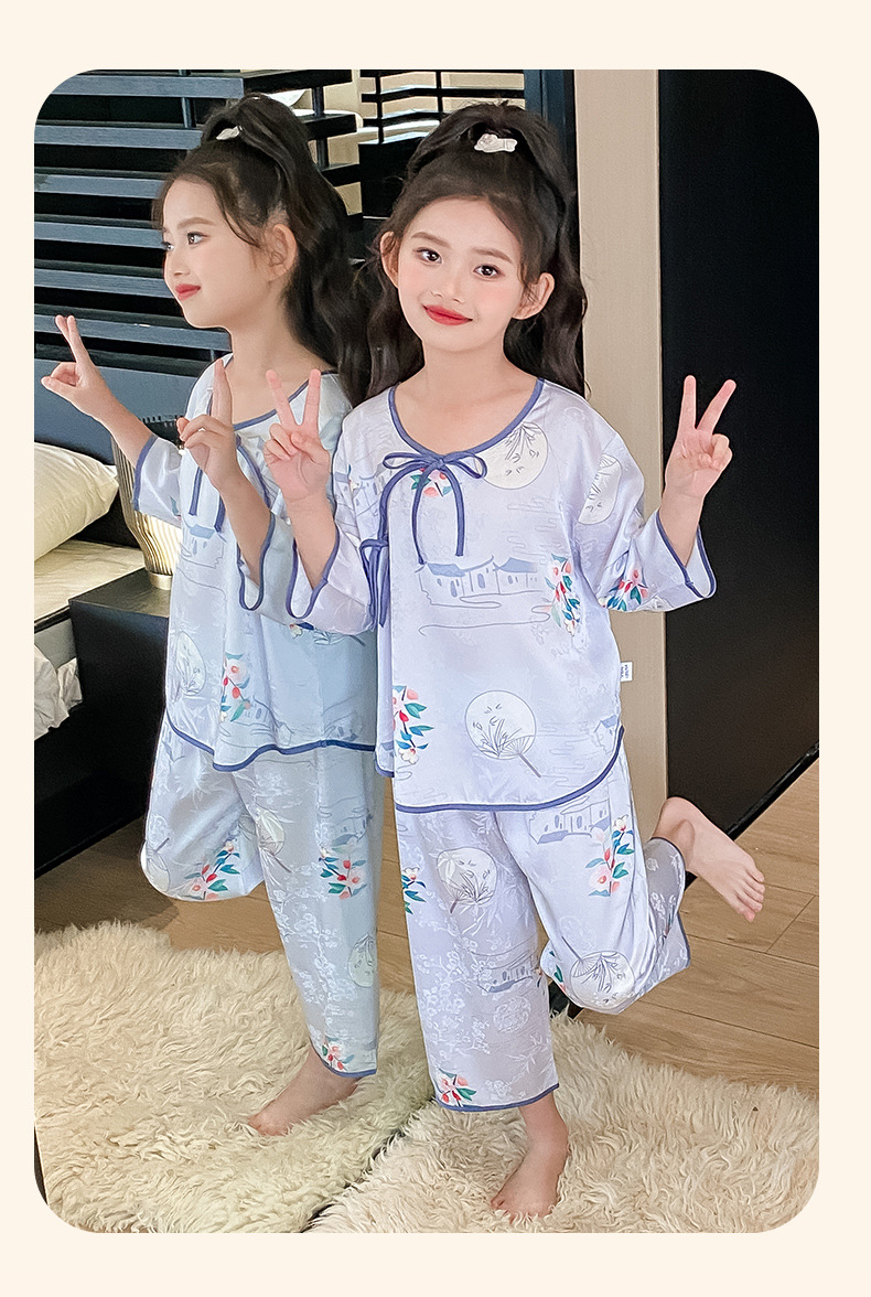 소녀의 여름 얇은 중국 스타일 잠옷 어린이 아이스 실크 반소매 홈 착용 세트 여름 에어컨 옷 투피스 세트스토어 가기