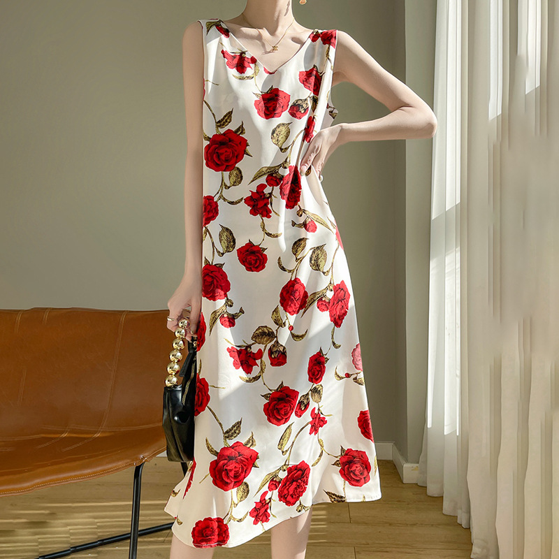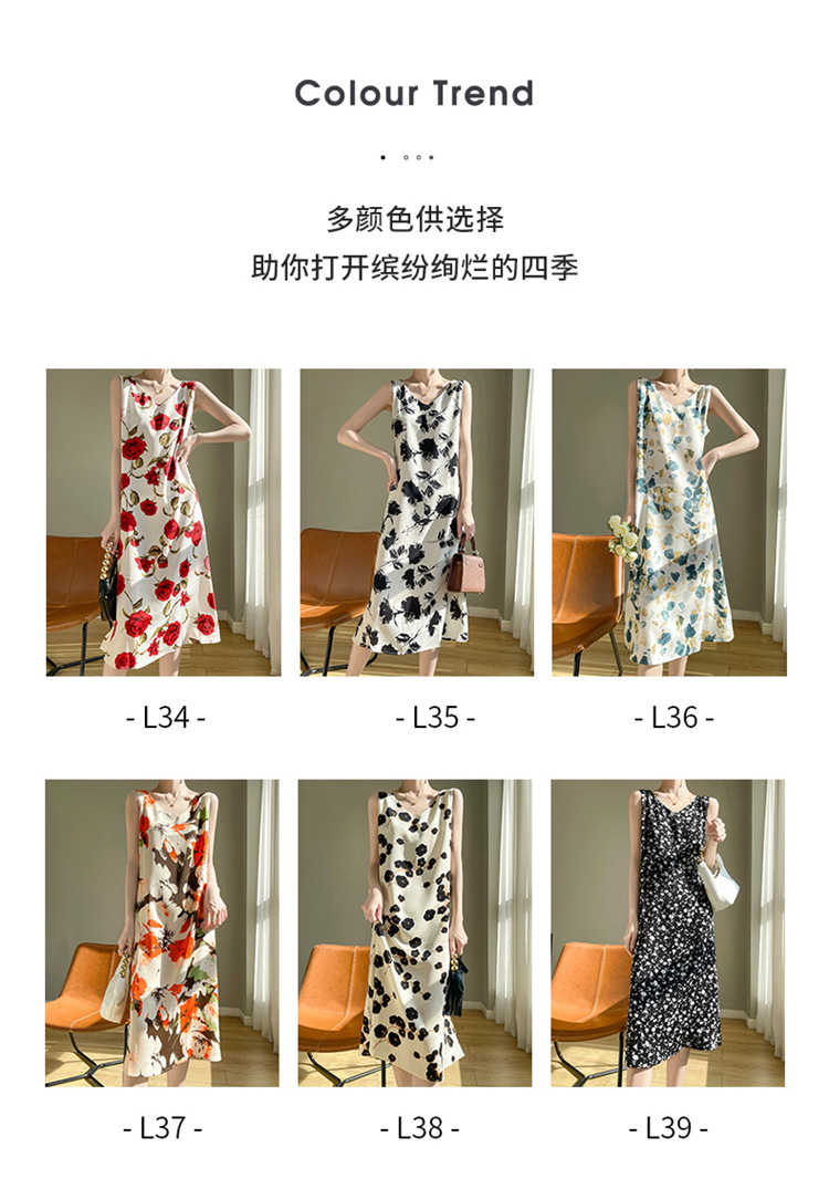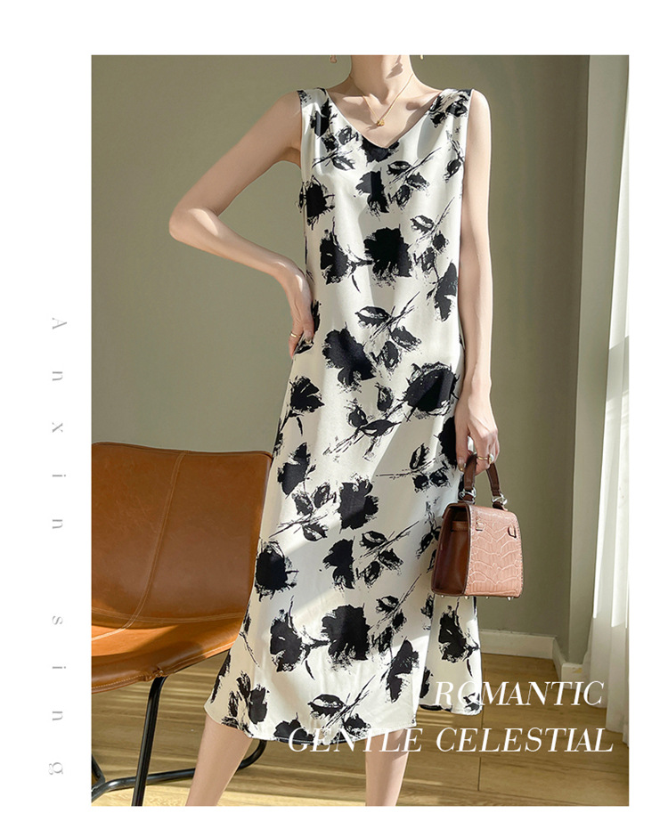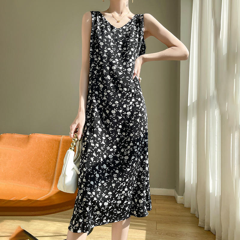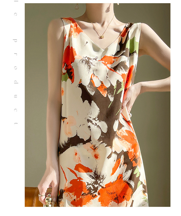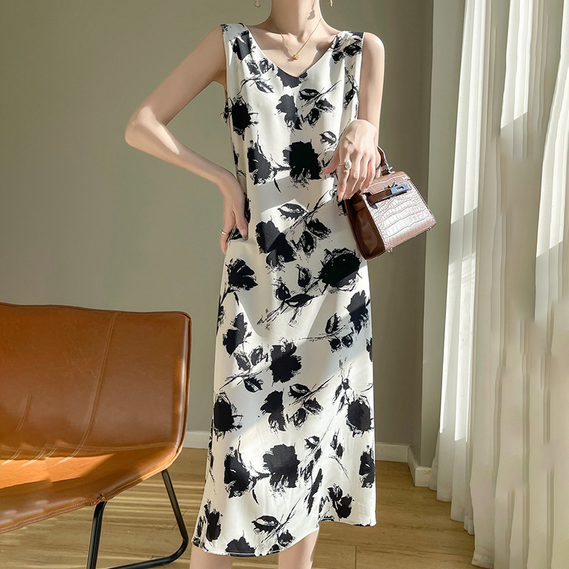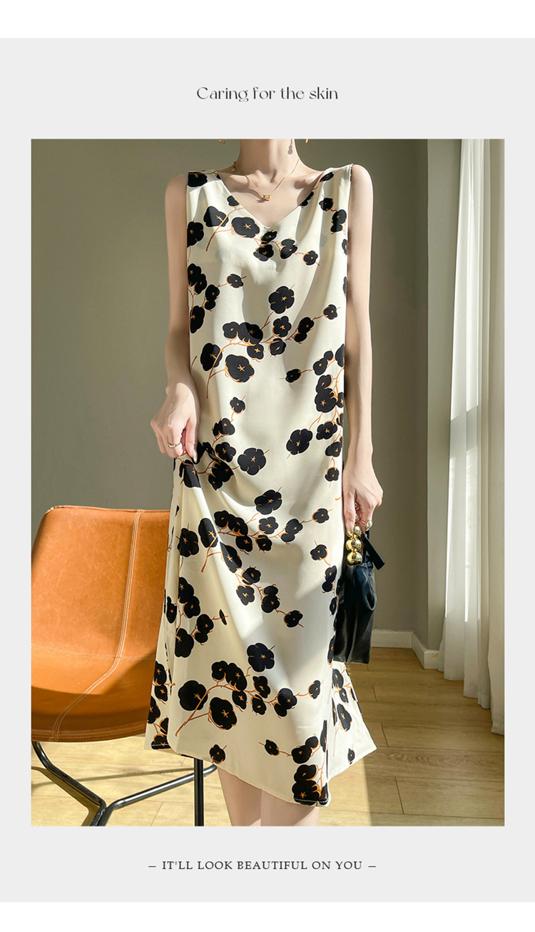 2024 여름 새로운 실키 새틴 프랑스 캐주얼 중간 길이 민소매 넓은 어깨 끈 플러스 사이즈 꽃 무늬 원피스스토어 가기