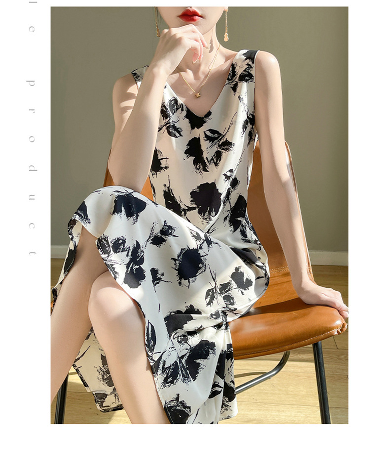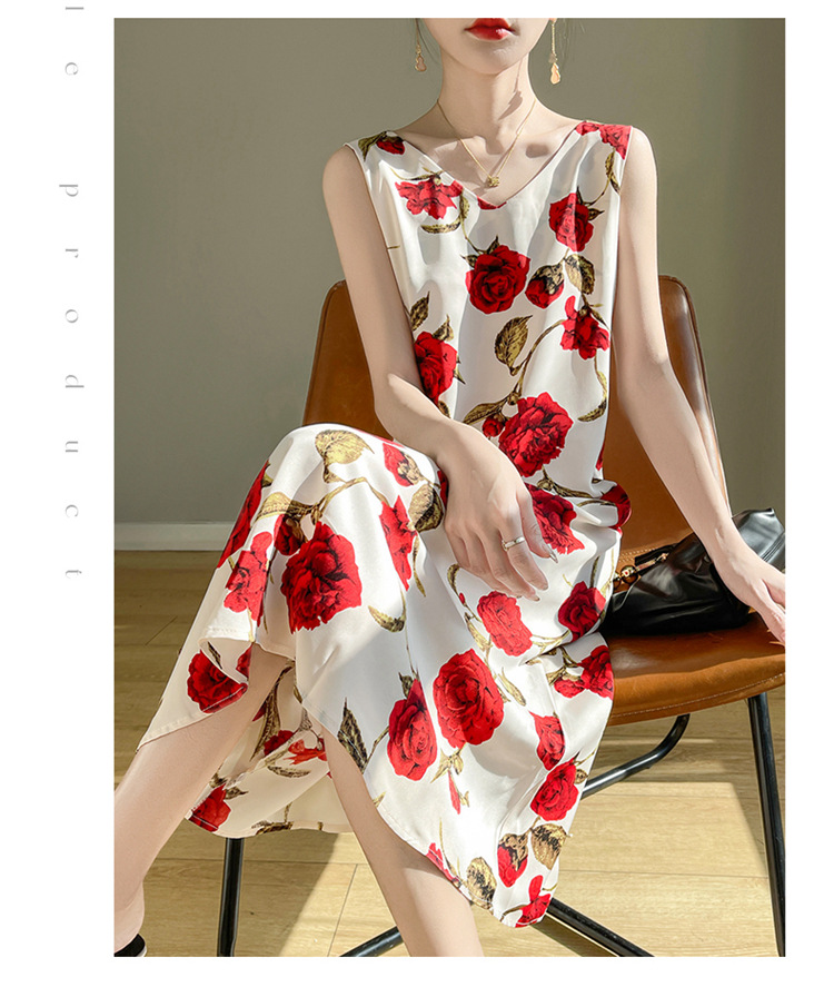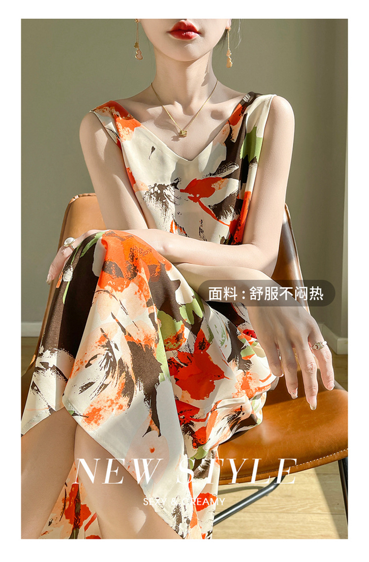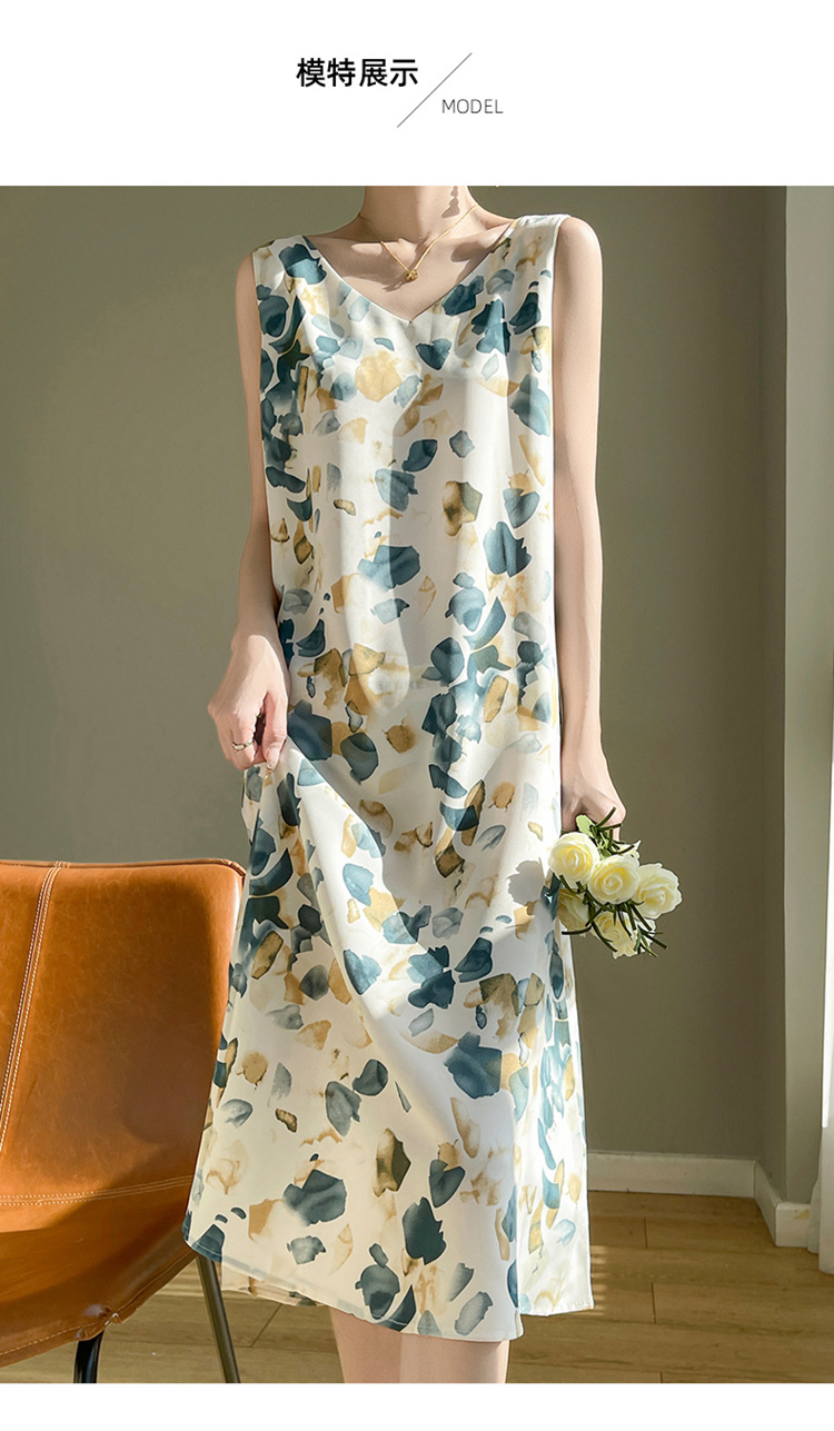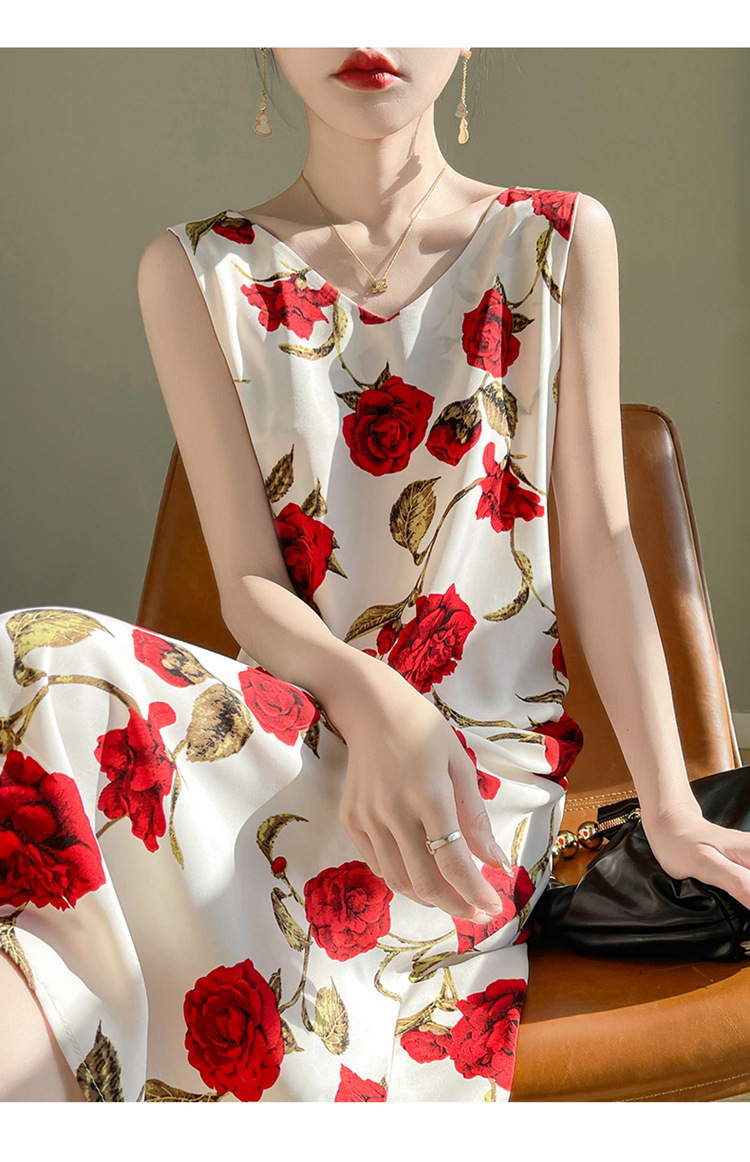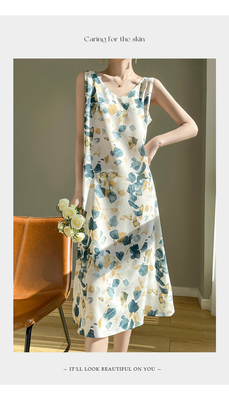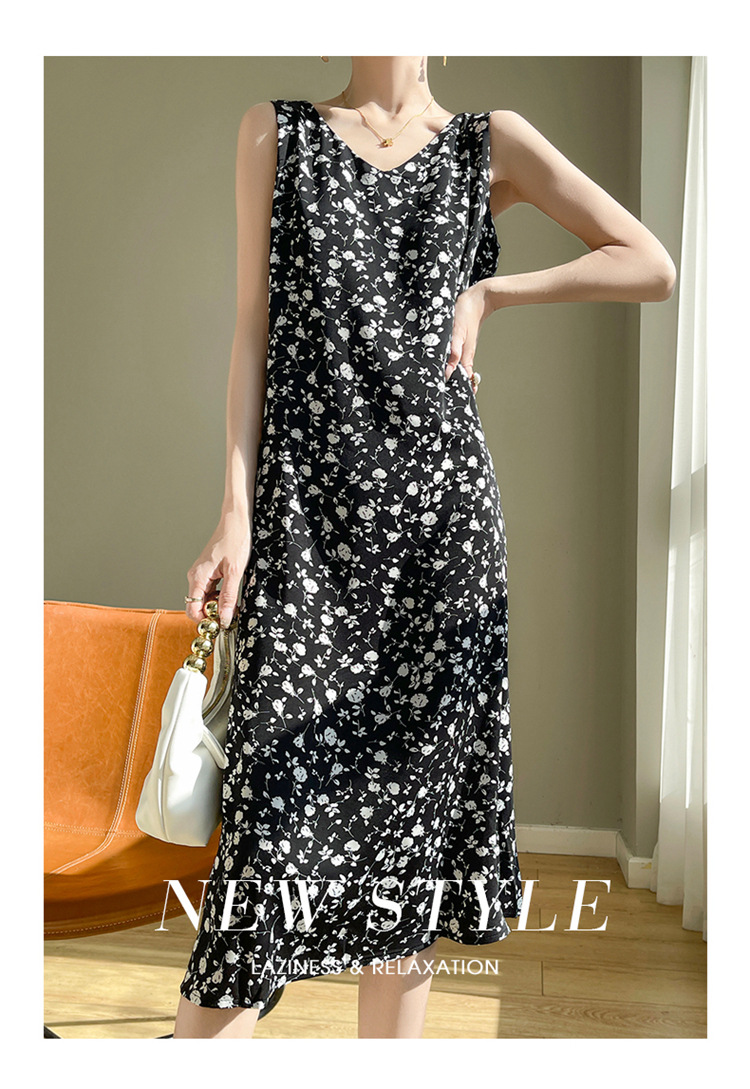 2024 여름 새로운 실키 새틴 프랑스 캐주얼 중간 길이 민소매 넓은 어깨 끈 플러스 사이즈 꽃 무늬 원피스스토어 가기