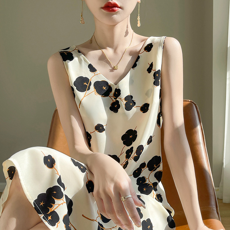 2024 여름 새로운 실키 새틴 프랑스 캐주얼 중간 길이 민소매 넓은 어깨 끈 플러스 사이즈 꽃 무늬 원피스