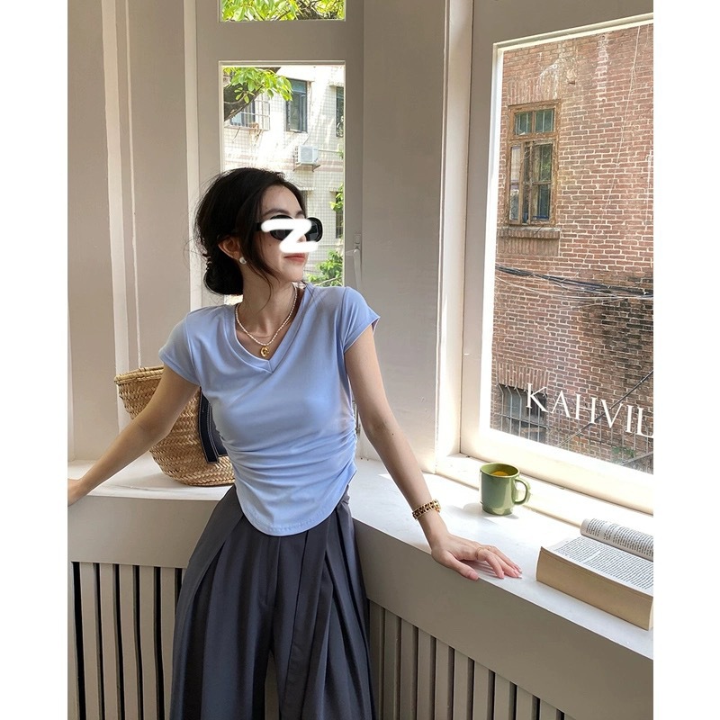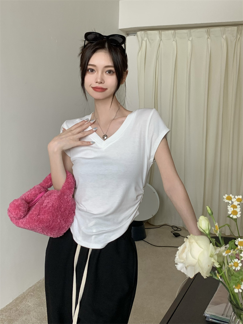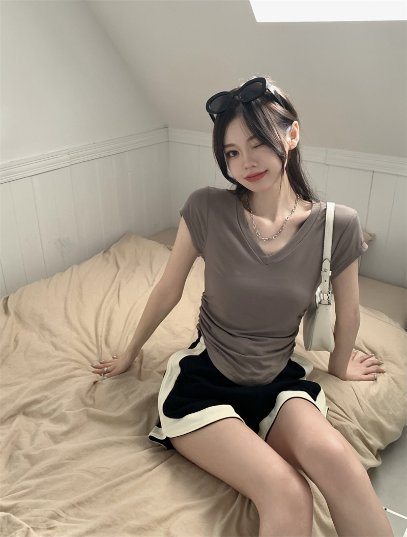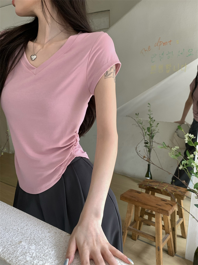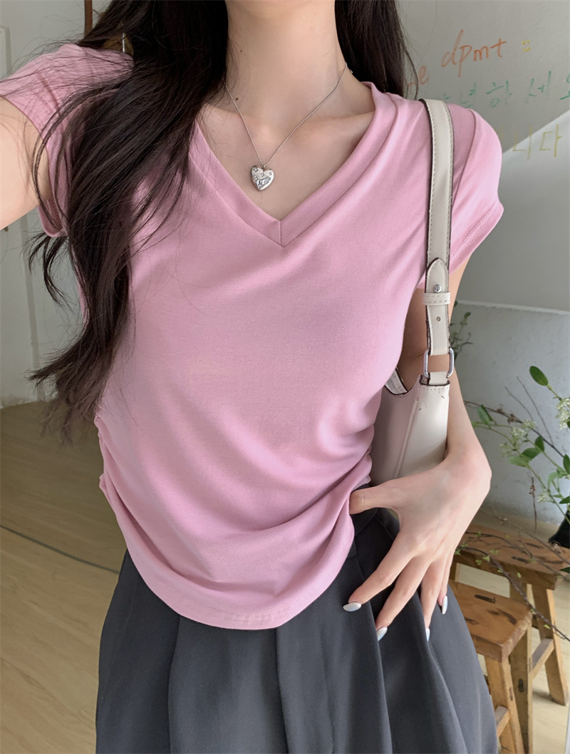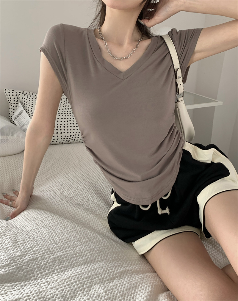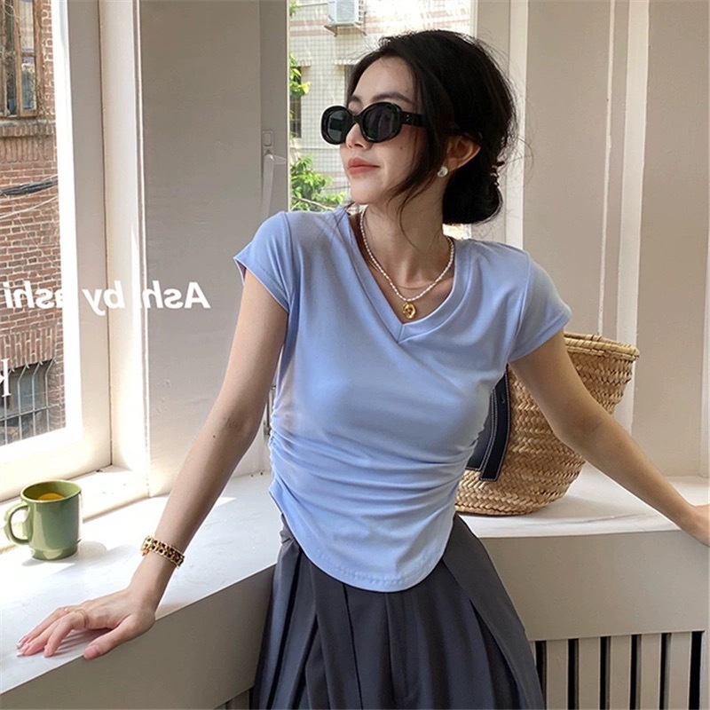 듀오 미올라 단색 슬리밍 V 넥 어깨 짧은 소매 여성의 여름 틈새 디자인 주름 슬림 한 짧은 최고 여성스토어 가기