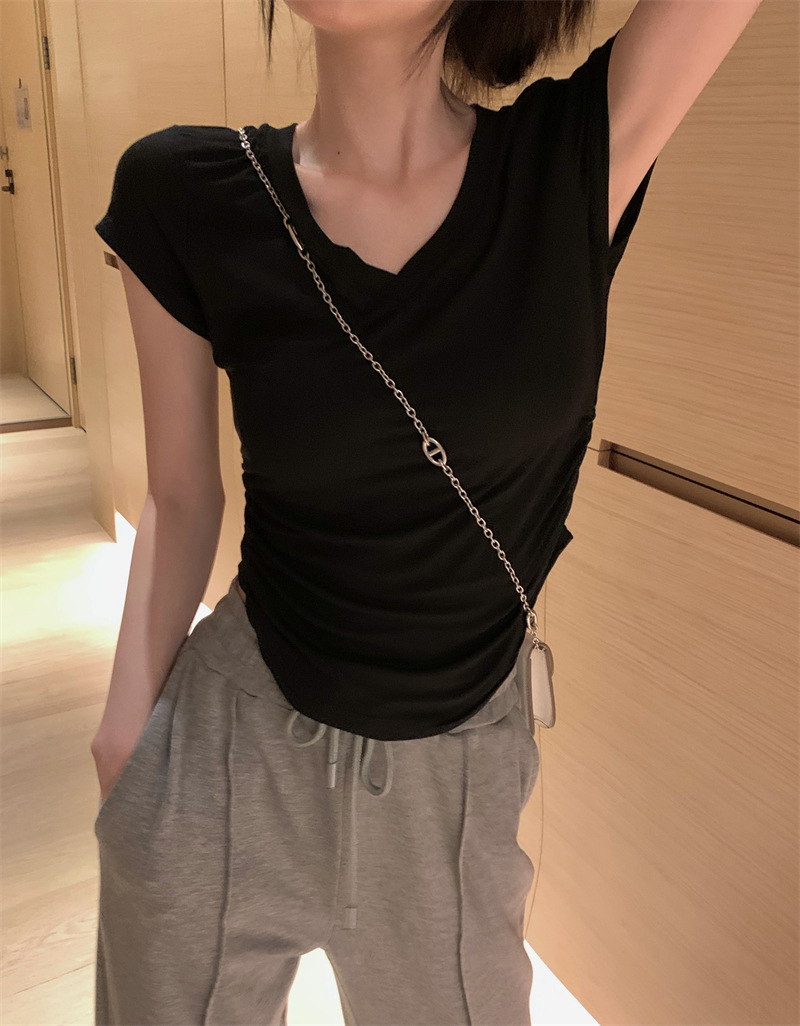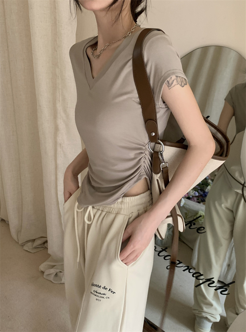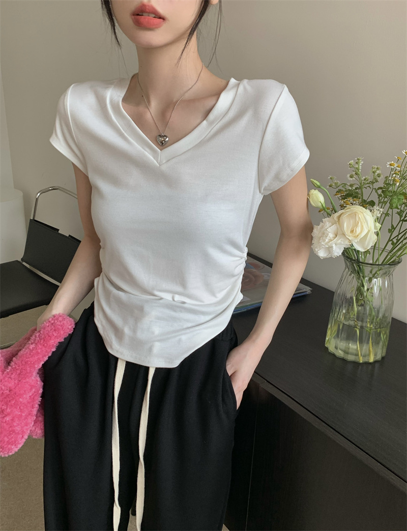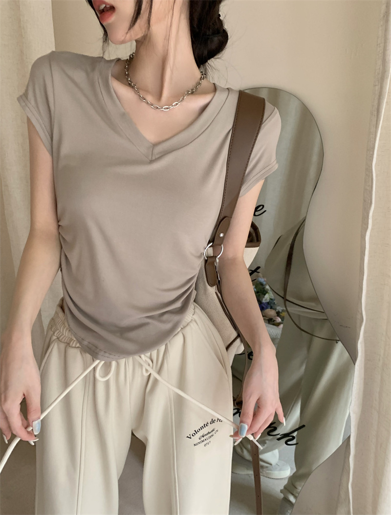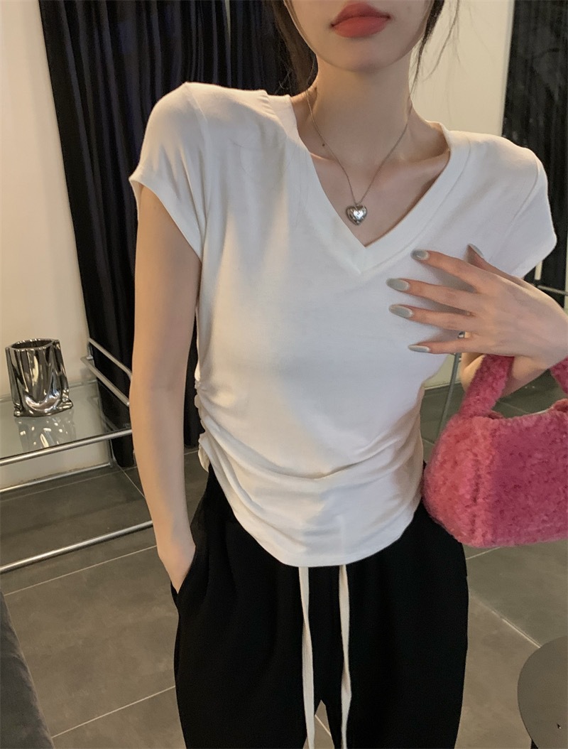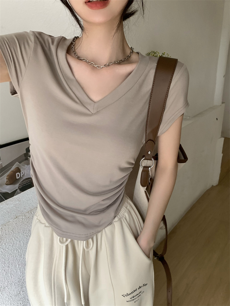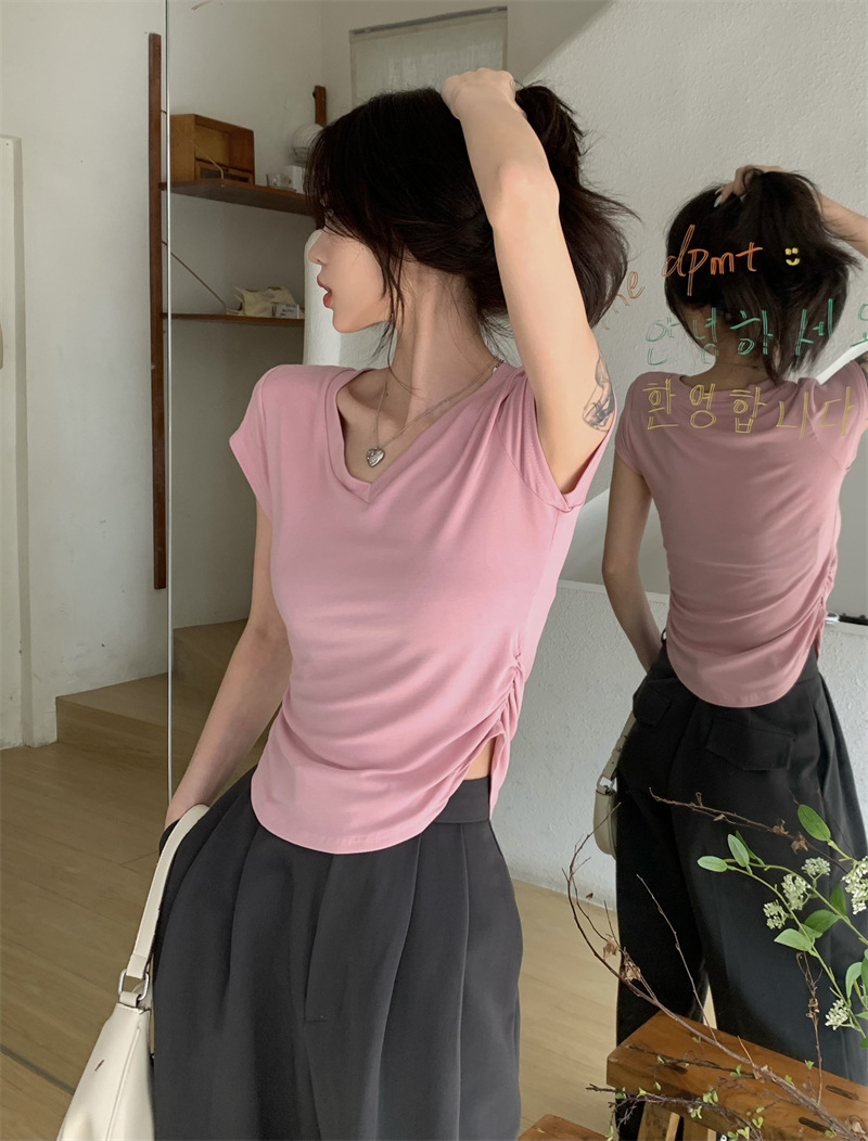 듀오 미올라 단색 슬리밍 V 넥 어깨 짧은 소매 여성의 여름 틈새 디자인 주름 슬림 한 짧은 최고 여성스토어 가기
