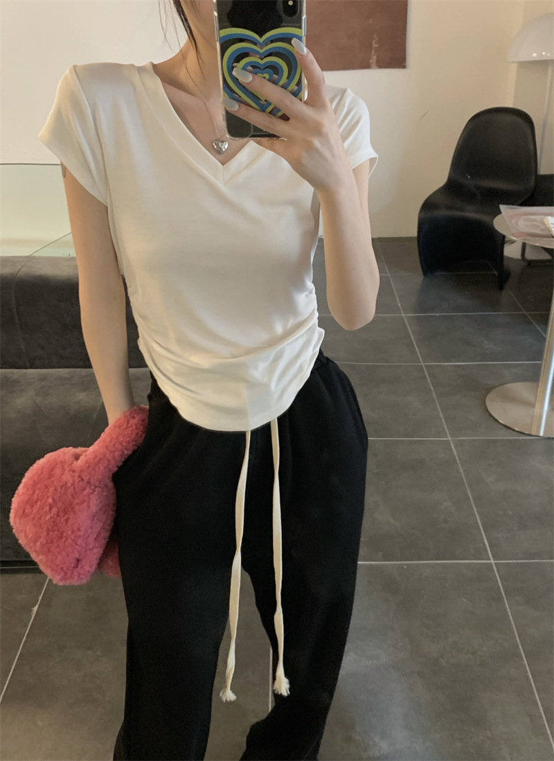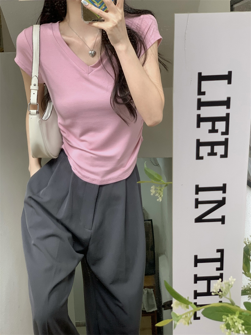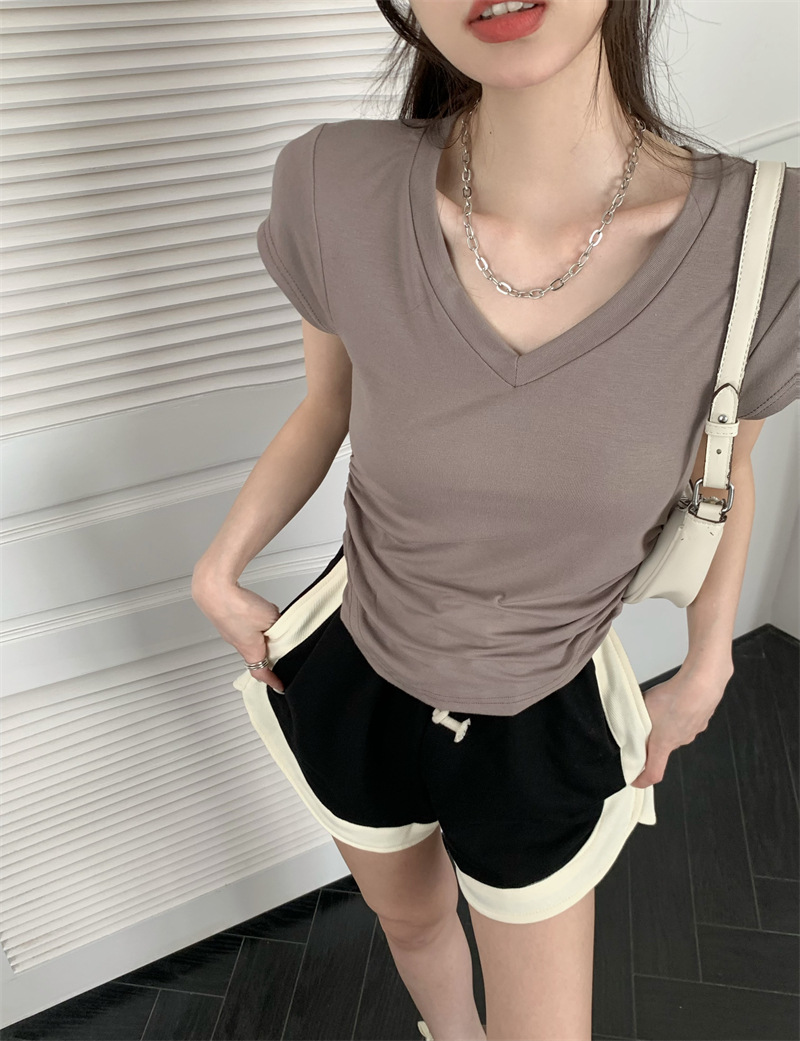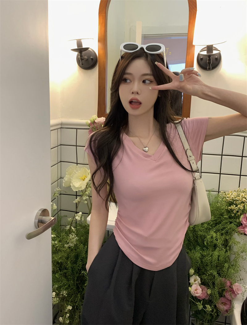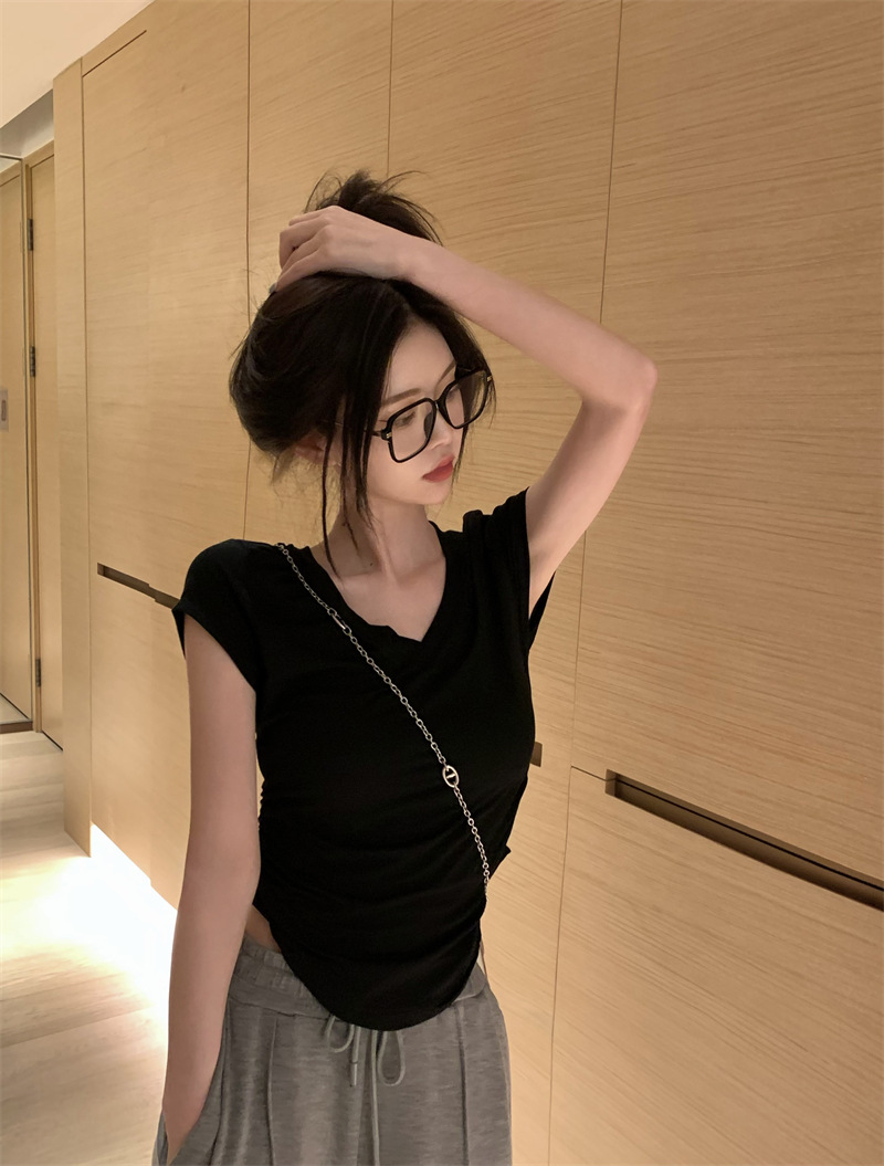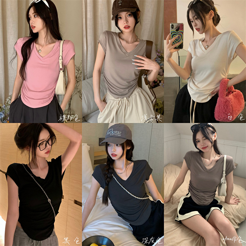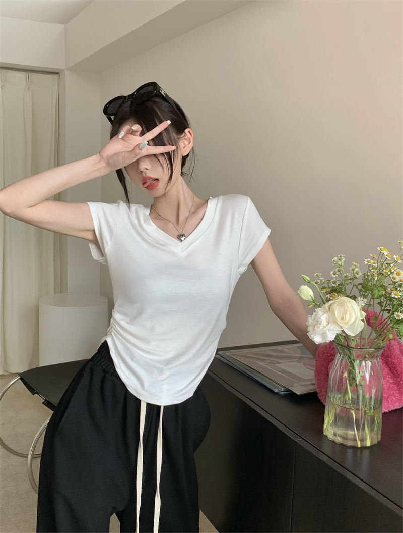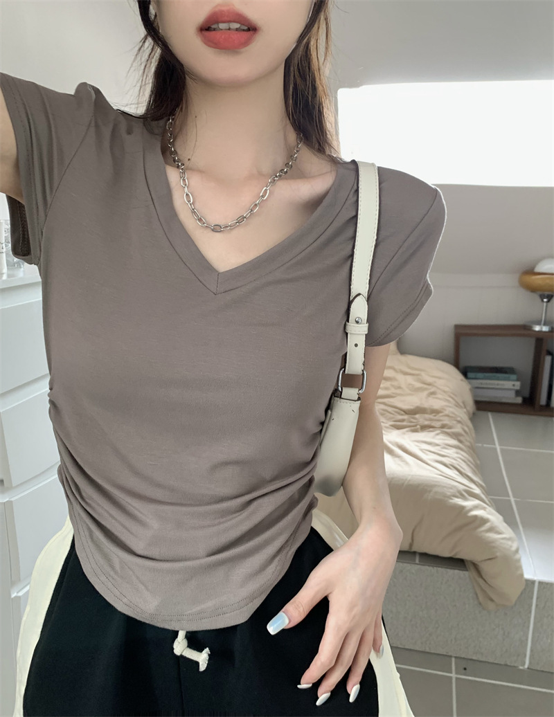 듀오 미올라 단색 슬리밍 V 넥 어깨 짧은 소매 여성의 여름 틈새 디자인 주름 슬림 한 짧은 최고 여성스토어 가기