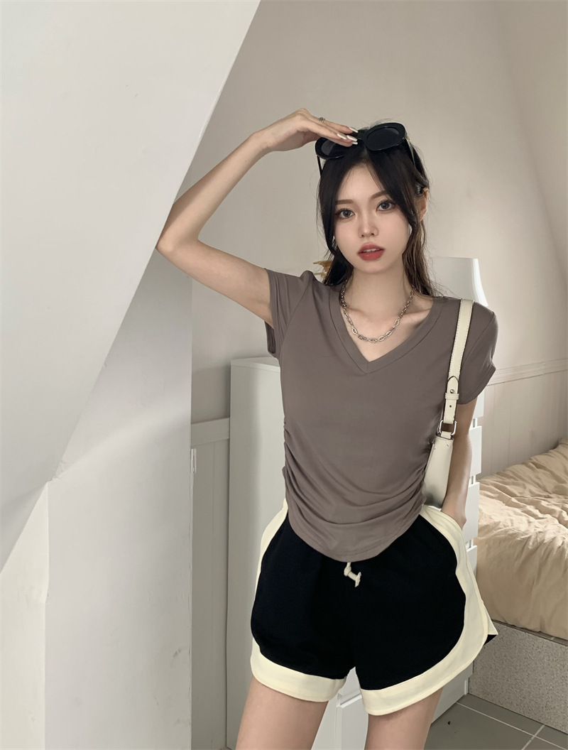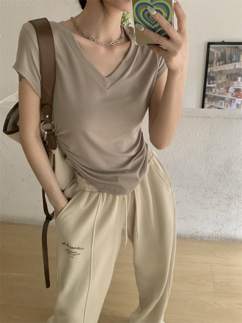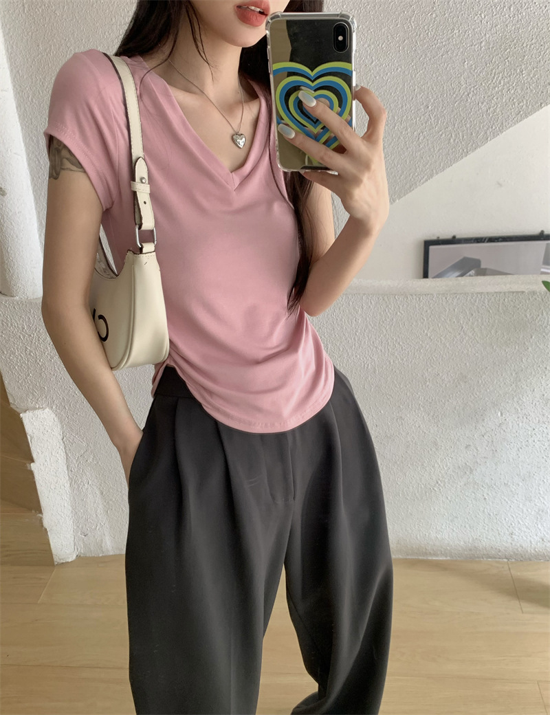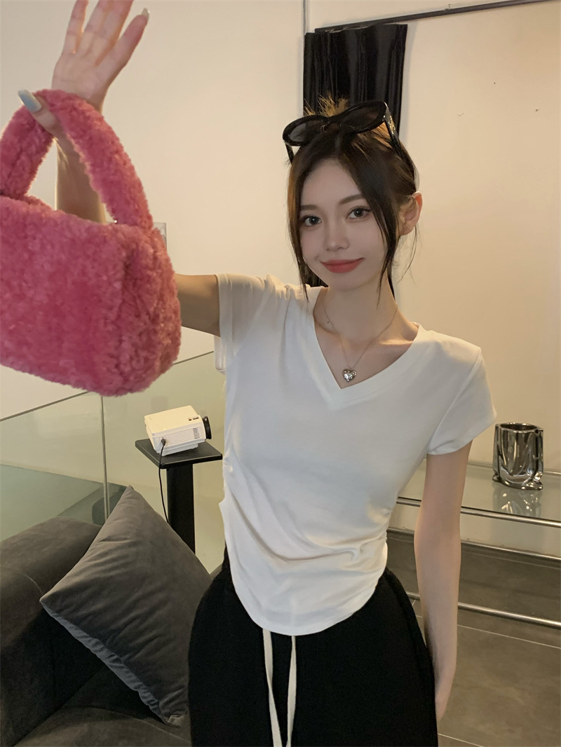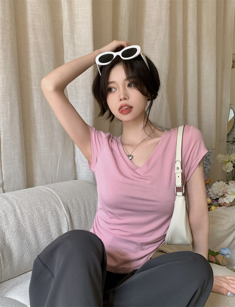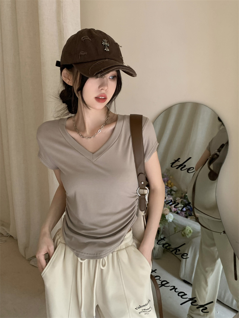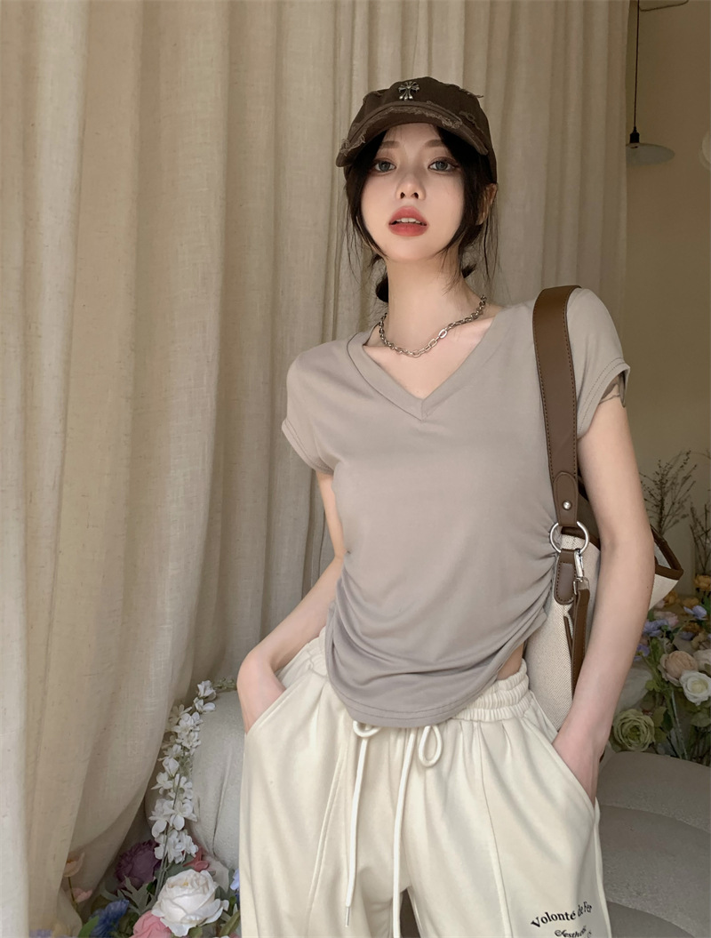 듀오 미올라 단색 슬리밍 V 넥 어깨 짧은 소매 여성의 여름 틈새 디자인 주름 슬림 한 짧은 최고 여성스토어 가기