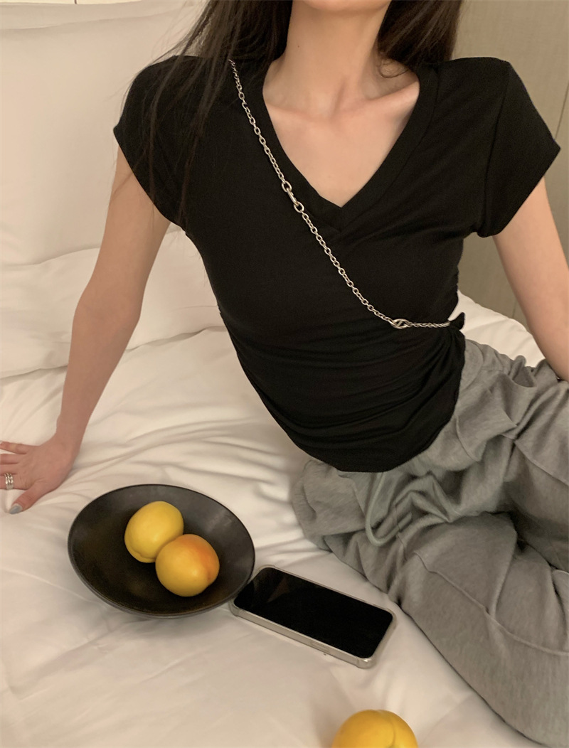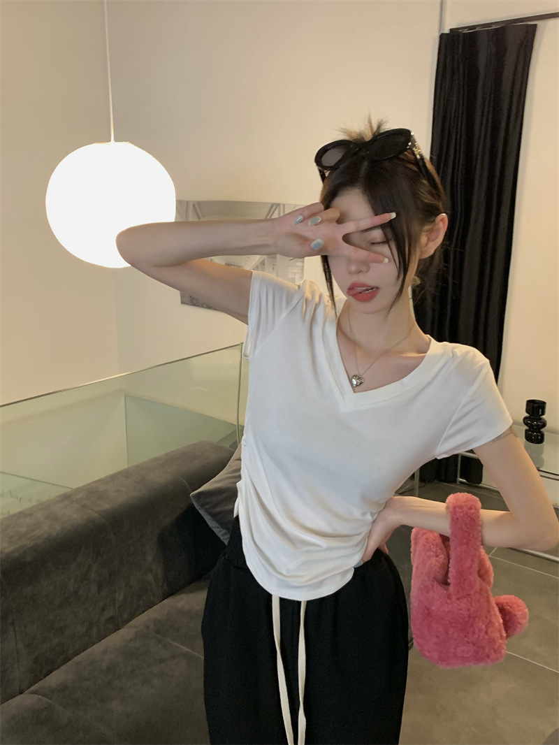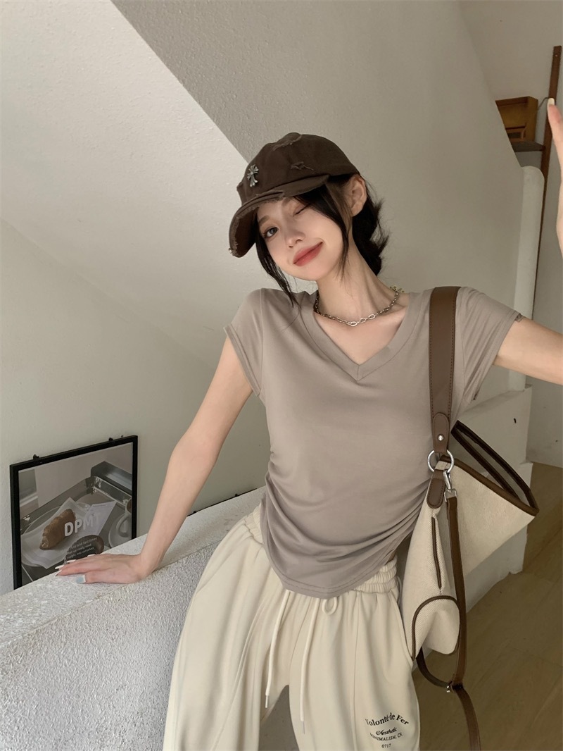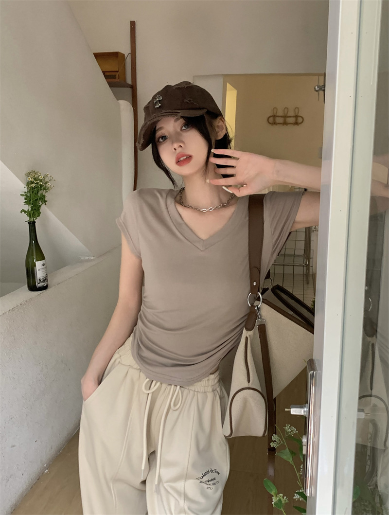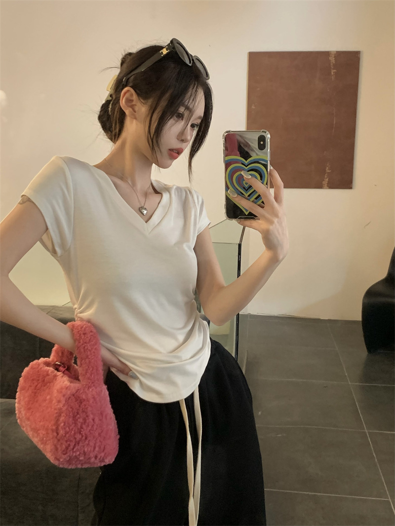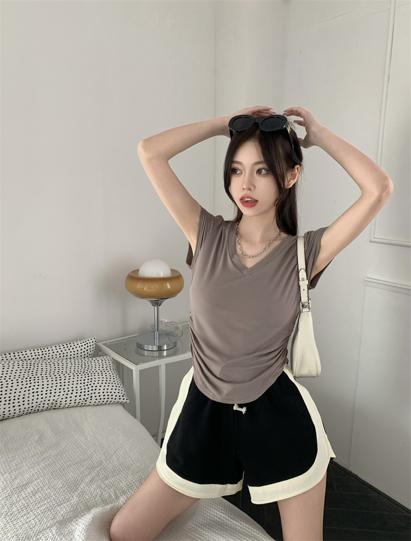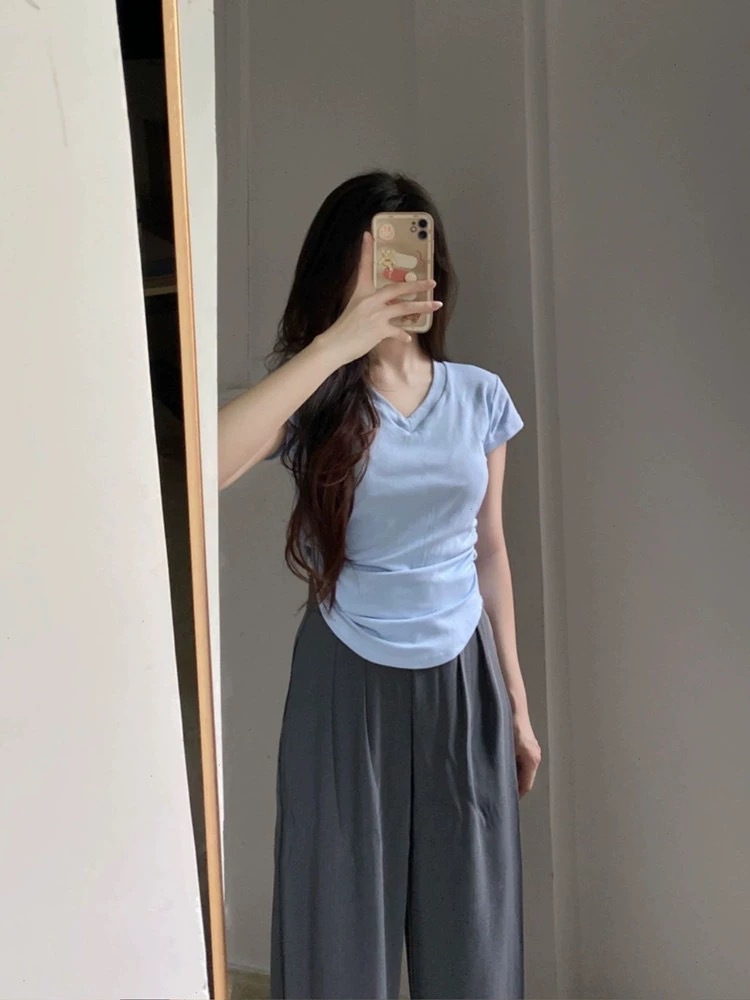 듀오 미올라 단색 슬리밍 V 넥 어깨 짧은 소매 여성의 여름 틈새 디자인 주름 슬림 한 짧은 최고 여성스토어 가기