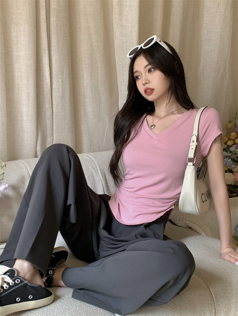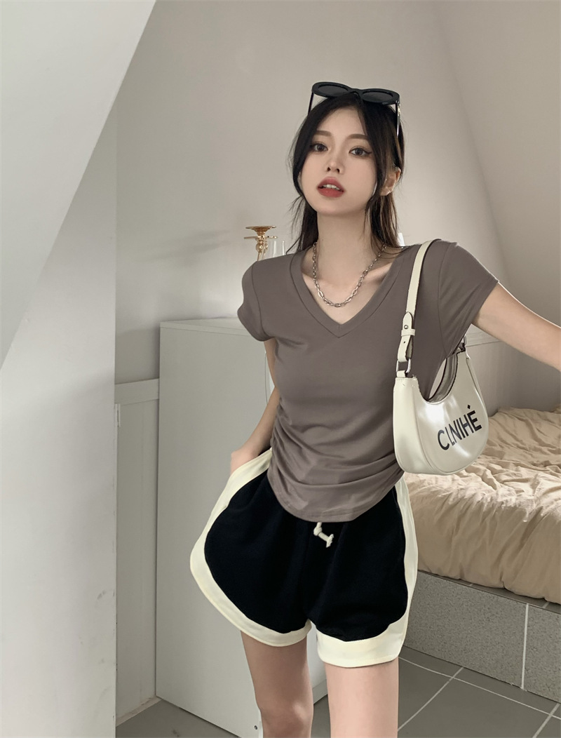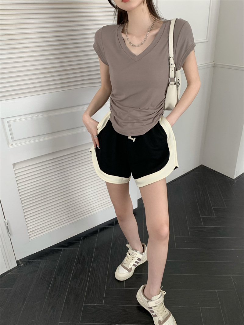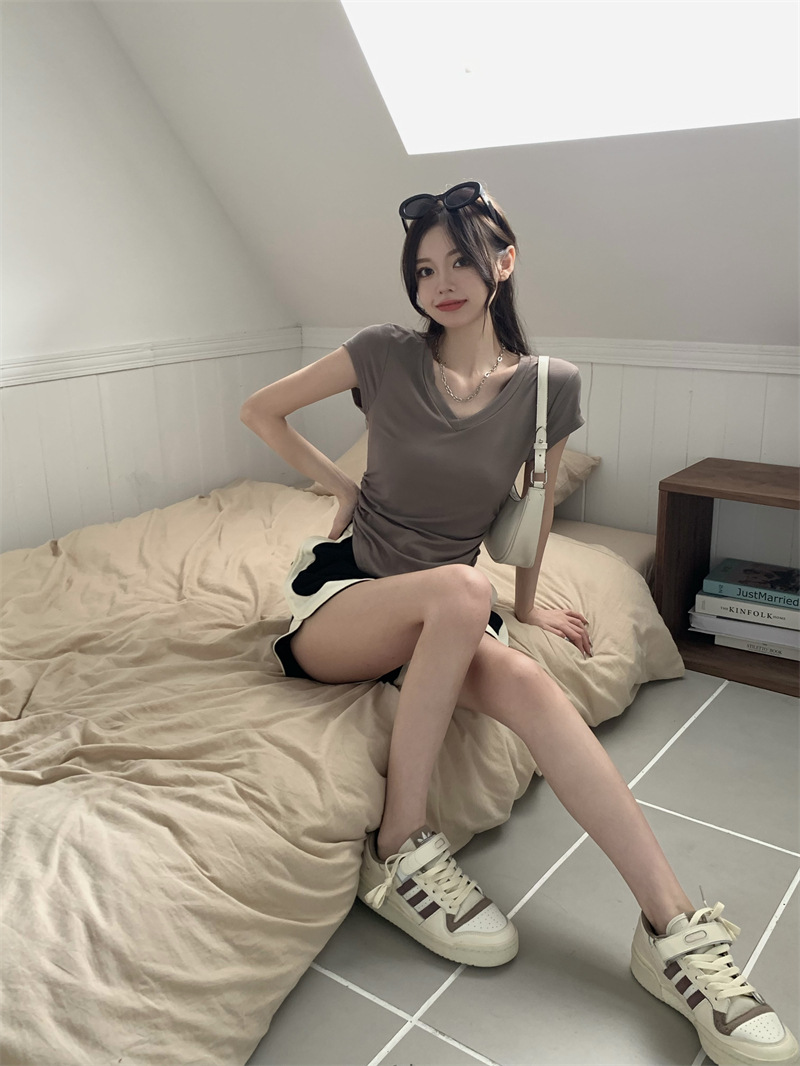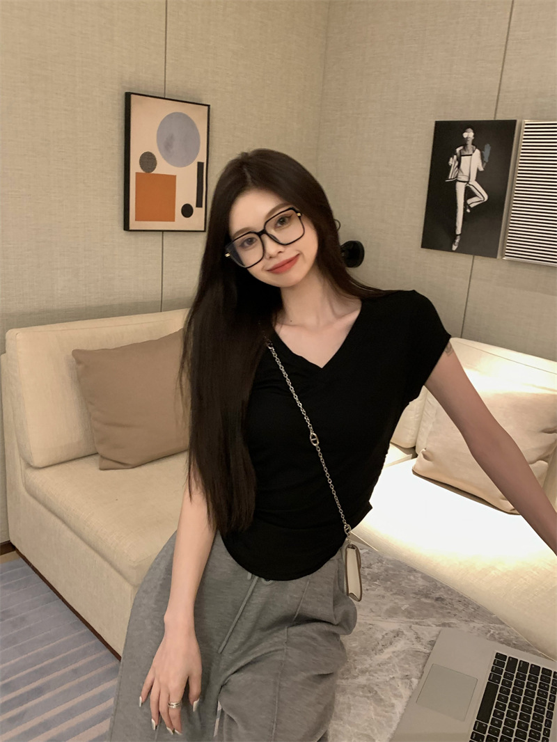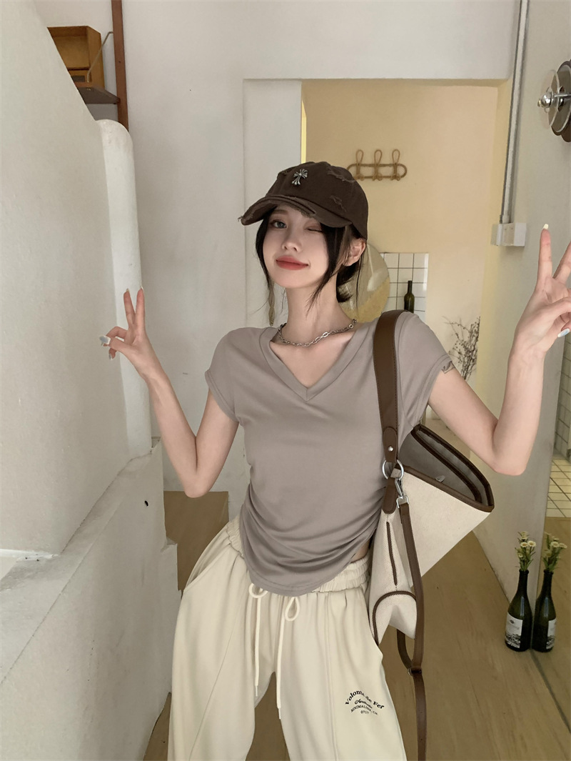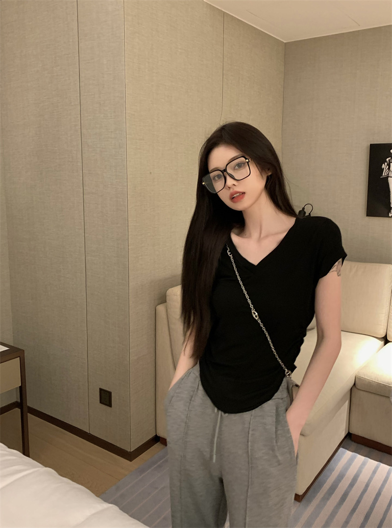 듀오 미올라 단색 슬리밍 V 넥 어깨 짧은 소매 여성의 여름 틈새 디자인 주름 슬림 한 짧은 최고 여성스토어 가기