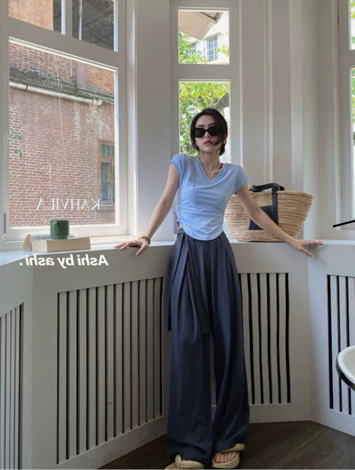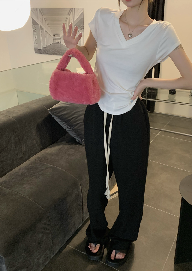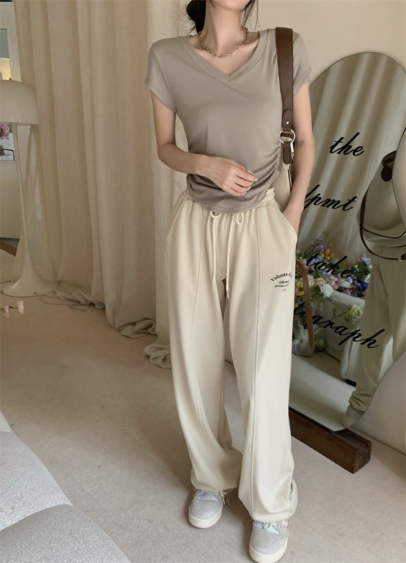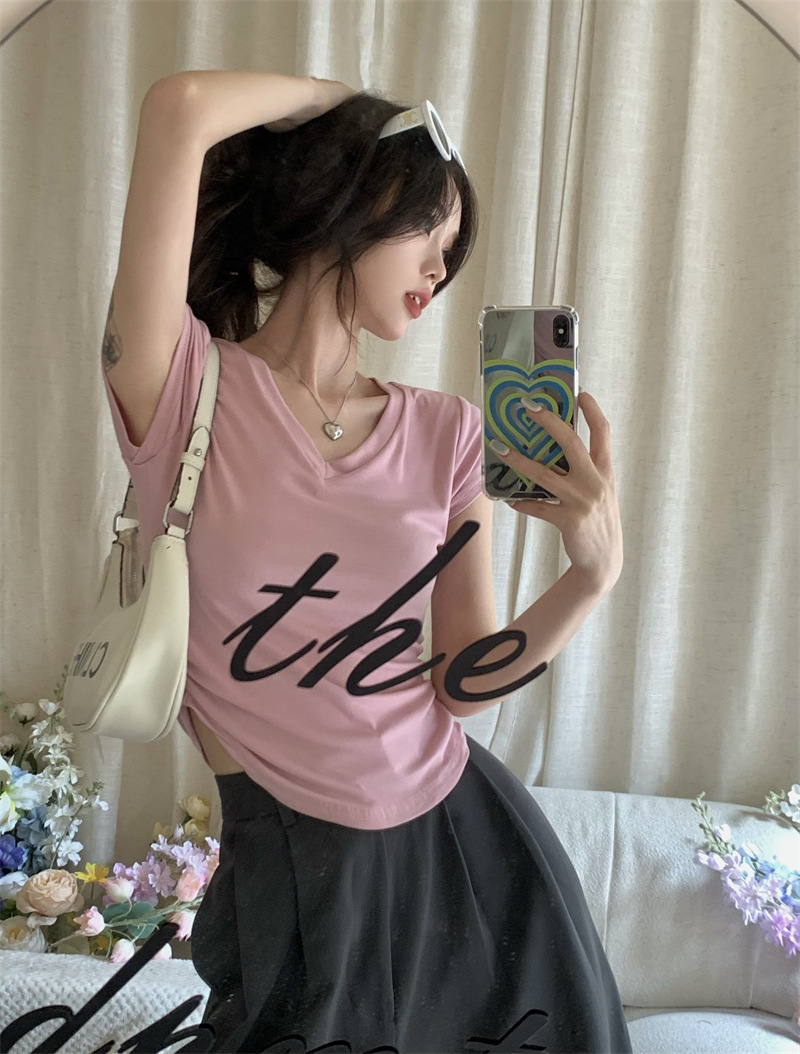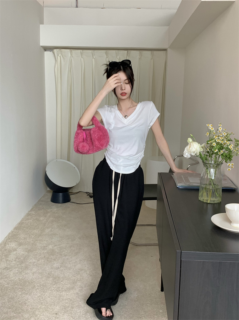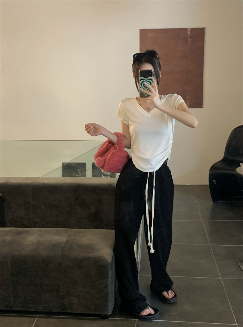듀오 미올라 단색 슬리밍 V 넥 어깨 짧은 소매 여성의 여름 틈새 디자인 주름 슬림 한 짧은 최고 여성스토어 가기