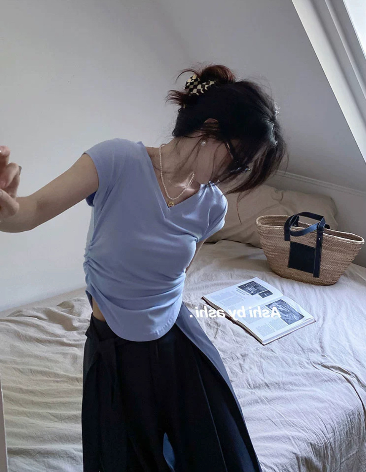듀오 미올라 단색 슬리밍 V 넥 어깨 짧은 소매 여성의 여름 틈새 디자인 주름 슬림 한 짧은 최고 여성