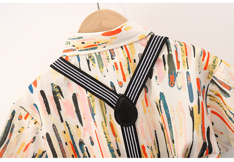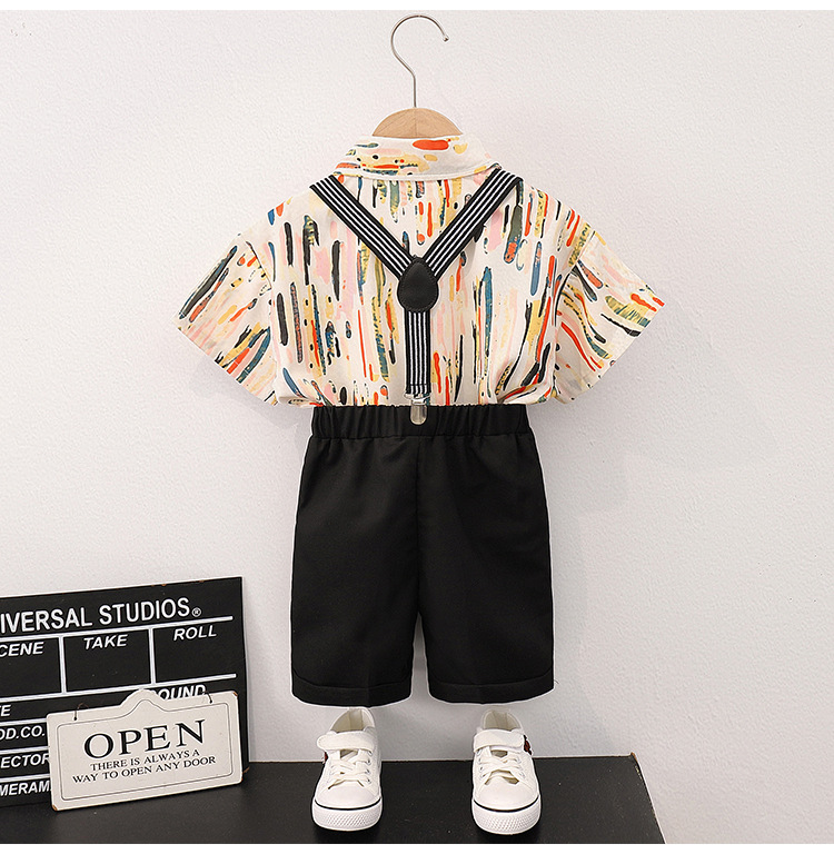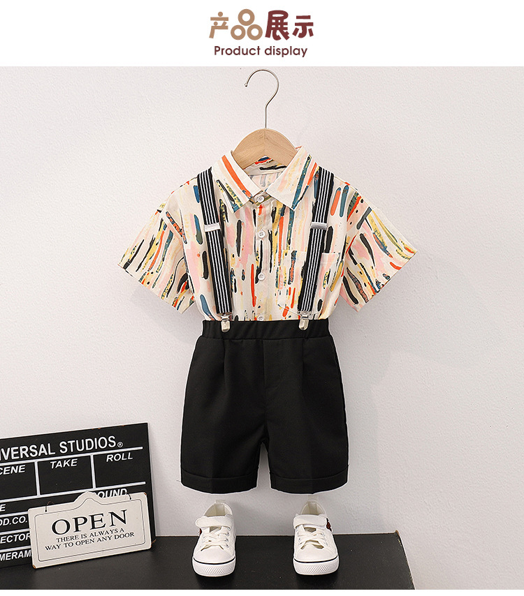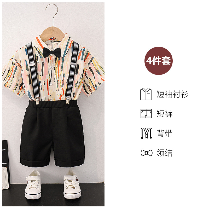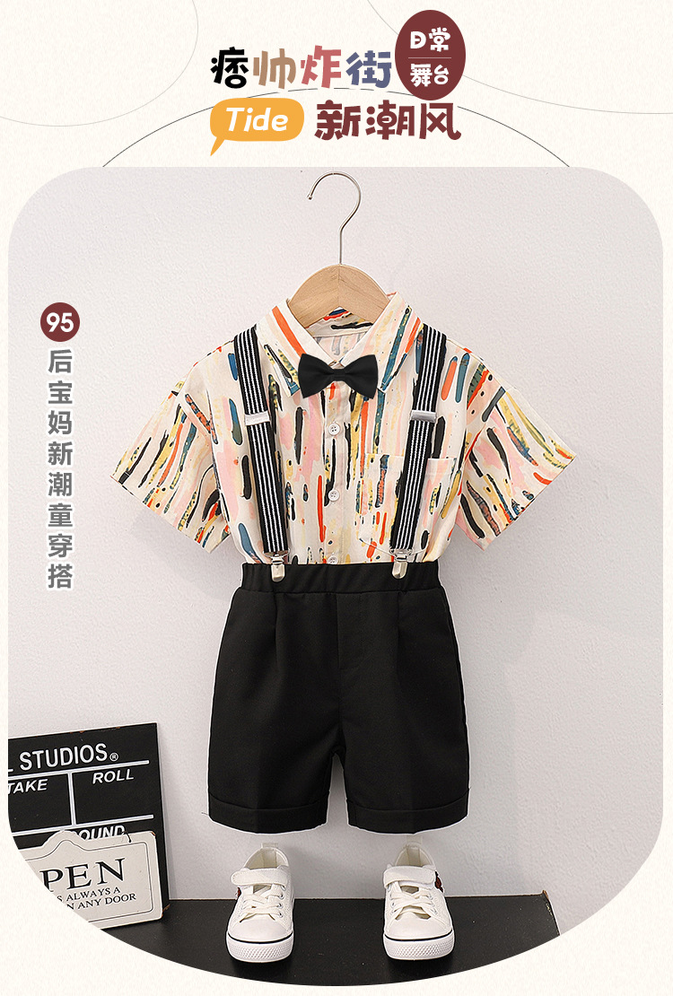 어린이 반팔 줄무늬 원피스 꽃 셔츠 여름 새로운 패션 잘 생긴 소년 홍콩 스타일 캐주얼 서스펜더 바지 세트