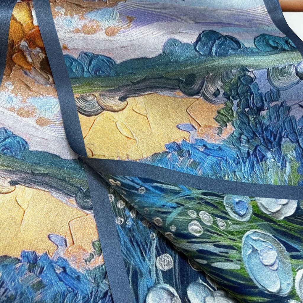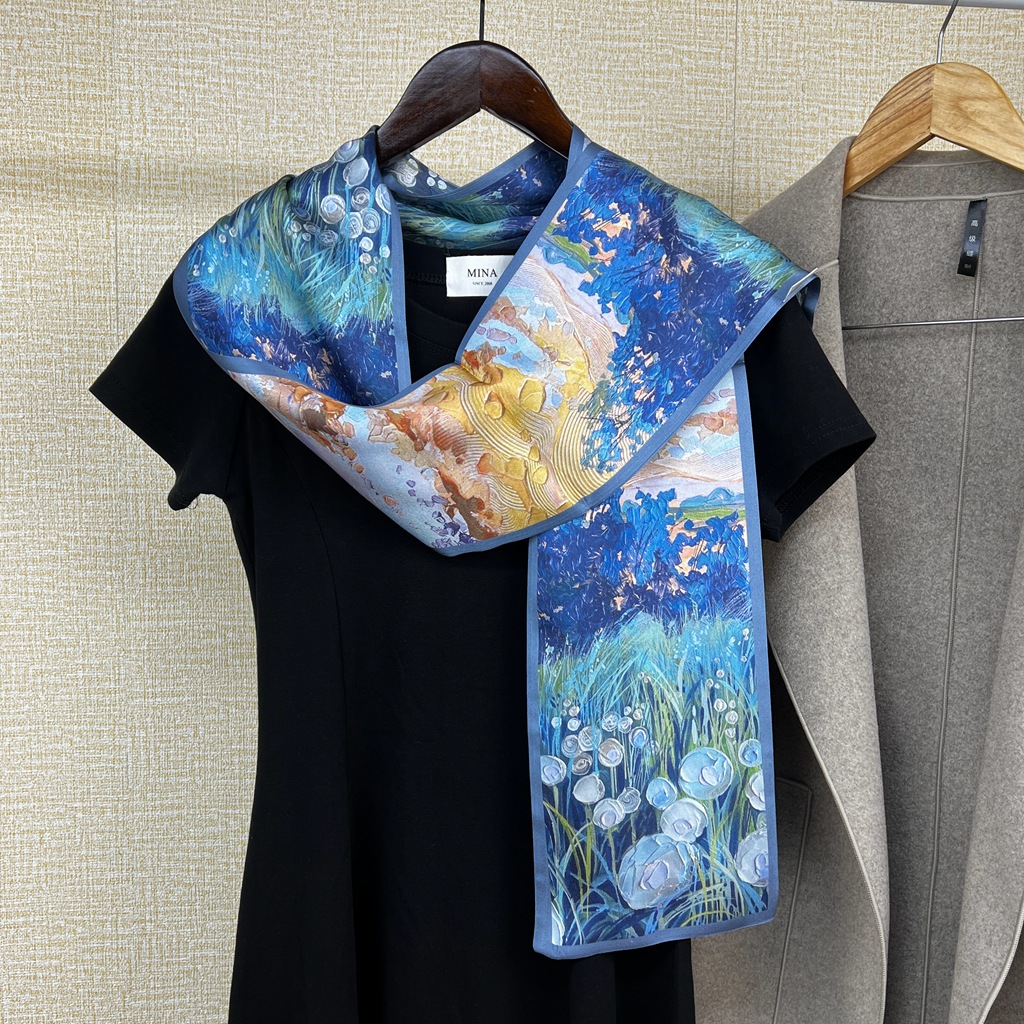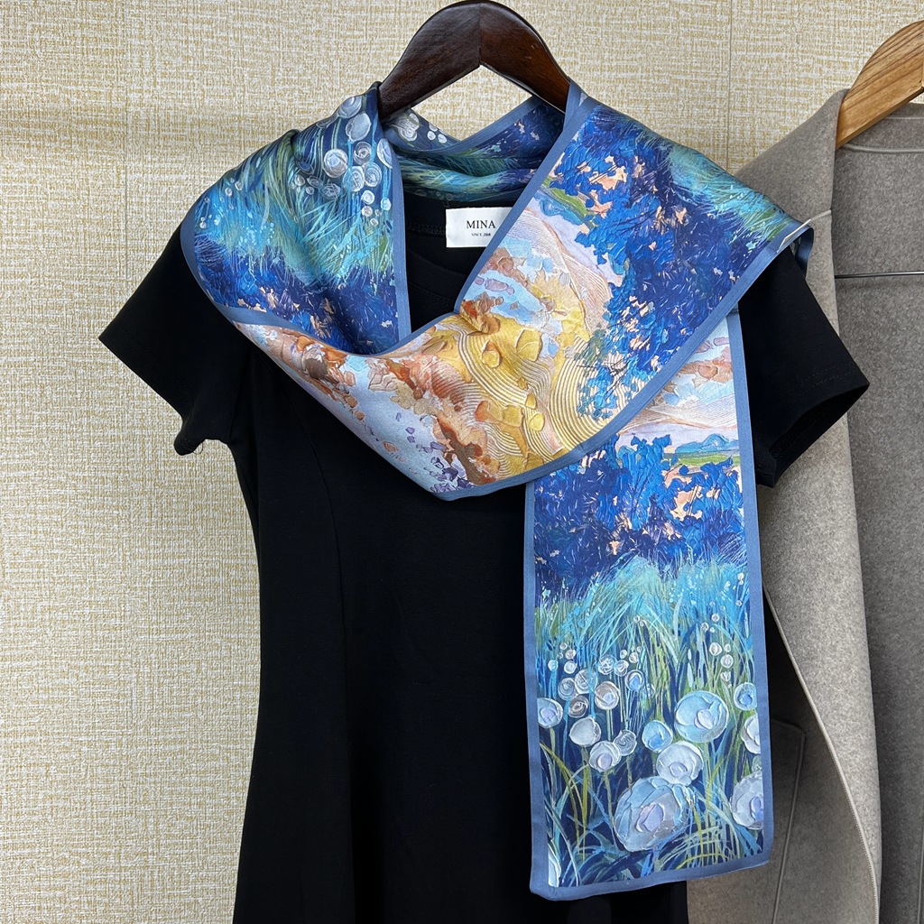 새로운 셔츠 스카프 뽕나무 실크 스카프 어머니의 날 선물 2024 유화 블루 실크 긴 스카프