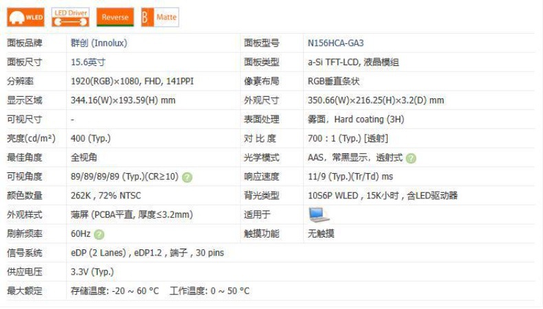 N156HCA-GA3 15.6 인치 새로운 노트북 LCD 화면 도매