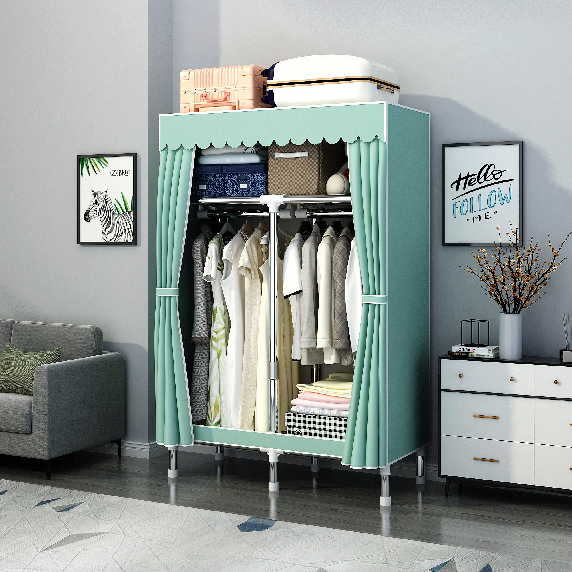 간단한 옷장 집 침실 조립 천 옷장 강철 파이프 두꺼운 강화 강하고 튼튼한 천 옷장 임대 Beiqin스토어 가기