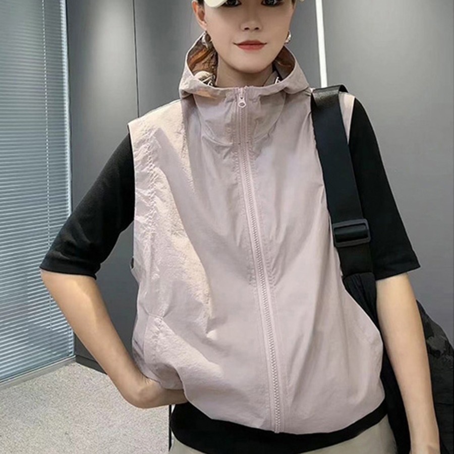 봄과 여름 2024 여성을위한 후드 재킷 조끼 민소매 코트 새로운 태양 보호 의류 통기성 다재다능한 캐주얼 후드 탑스토어 가기