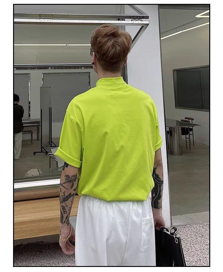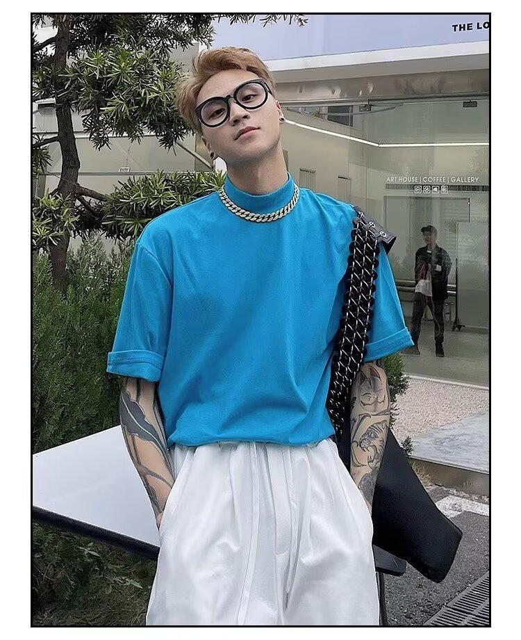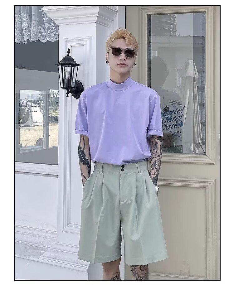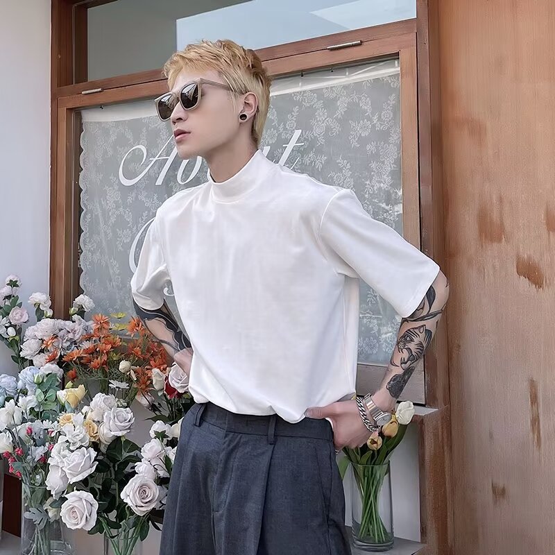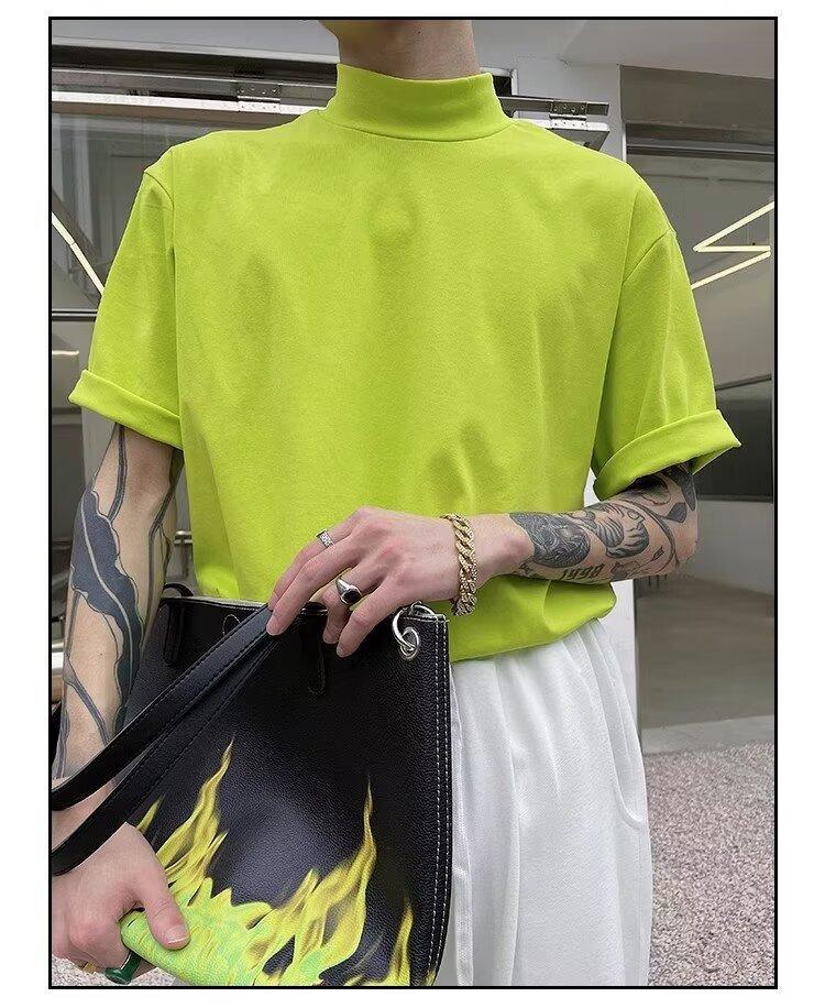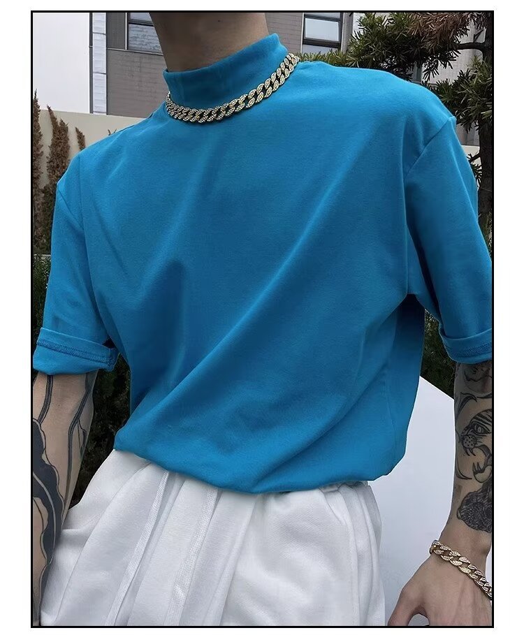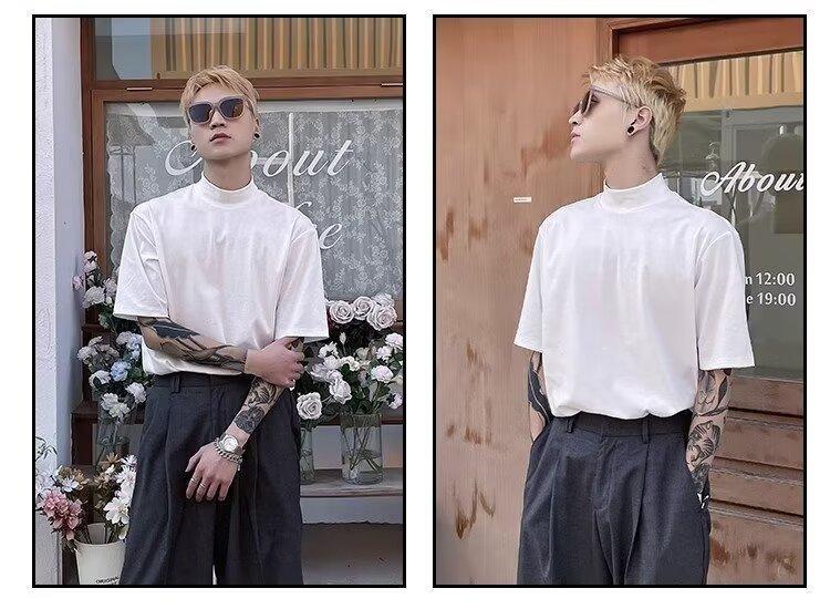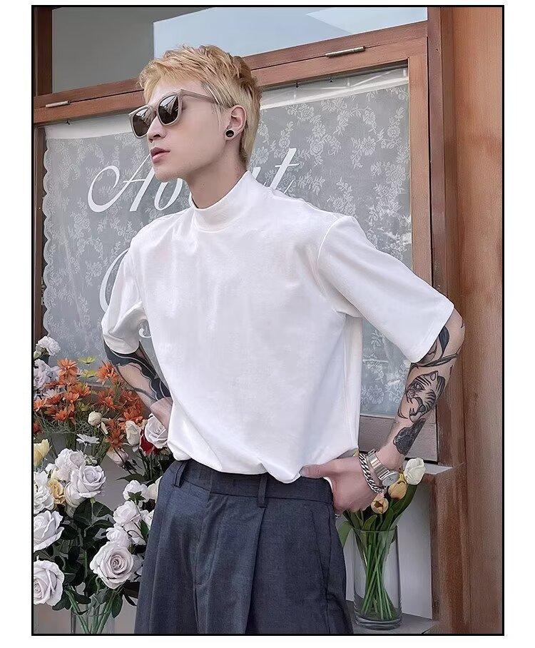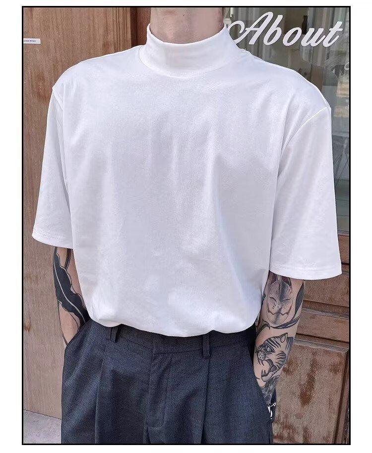 프랑스 스타일의 작은 터틀넥 티셔츠 예술적 스타일 소년 반팔 인터넷 유명인 미드 칼라 바닥 셔츠 시원한 얇은면 느낌 하프 터틀넥 티셔츠