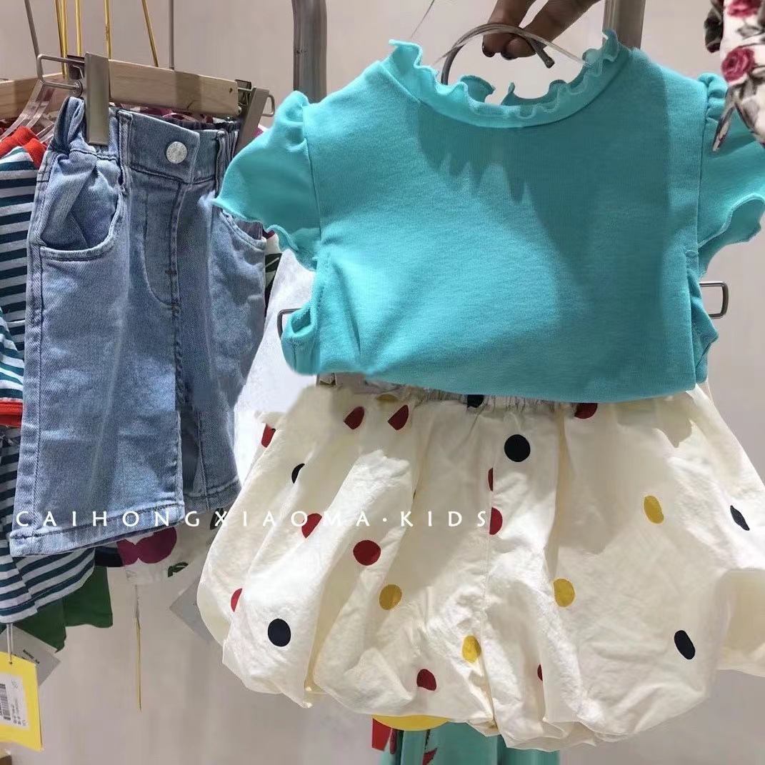소녀 여름 세트 서양식 단색 곰팡이 레이스 짧은 소매 한국식 무지개 점 꽃 괄호 바지 여름 투피스 세트스토어 가기