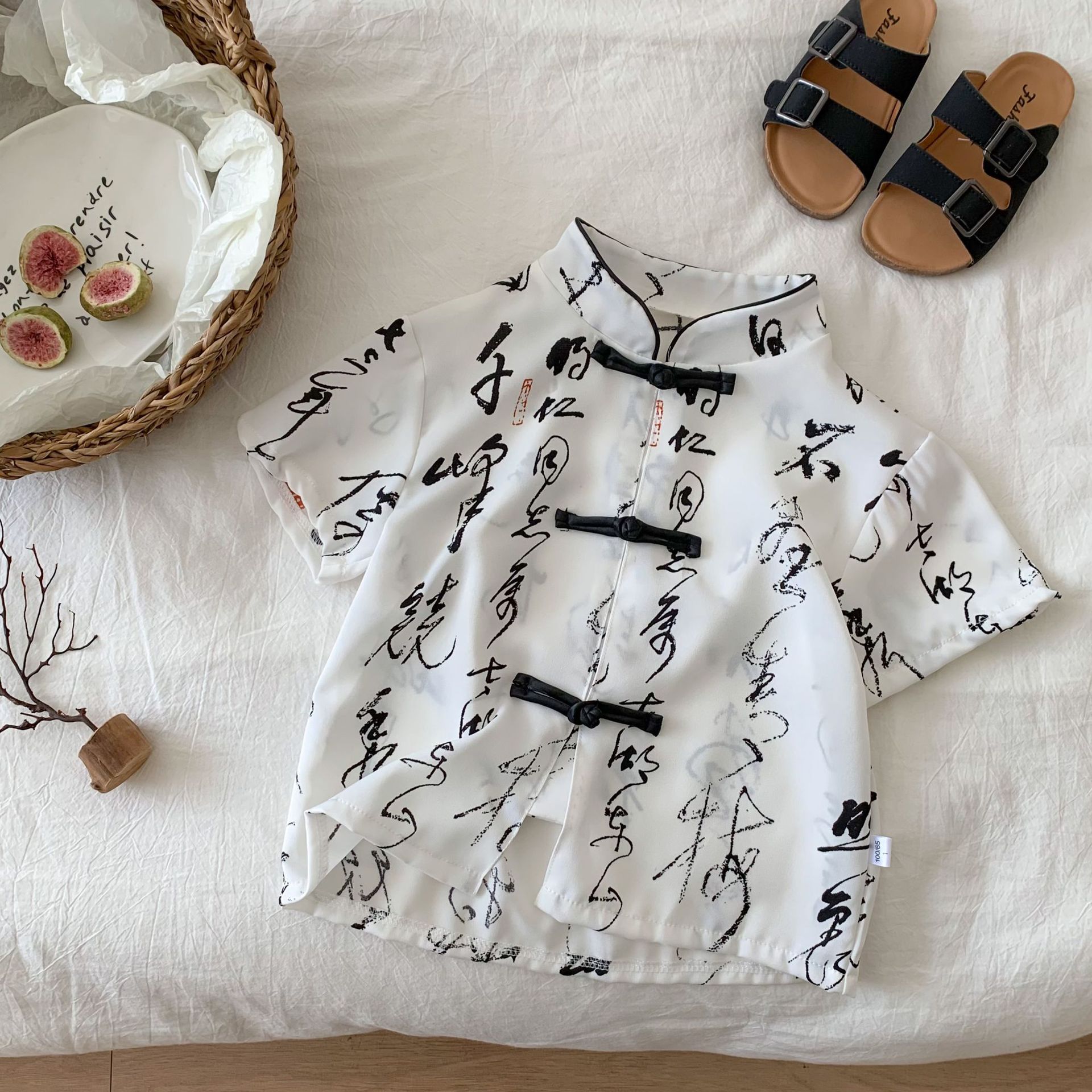 여름 어린이 티셔츠 2025 새로운 소년 셔츠 새로운 중국 스타일 Hanfu 잘 생긴 반팔 탑 아동 의류 도매