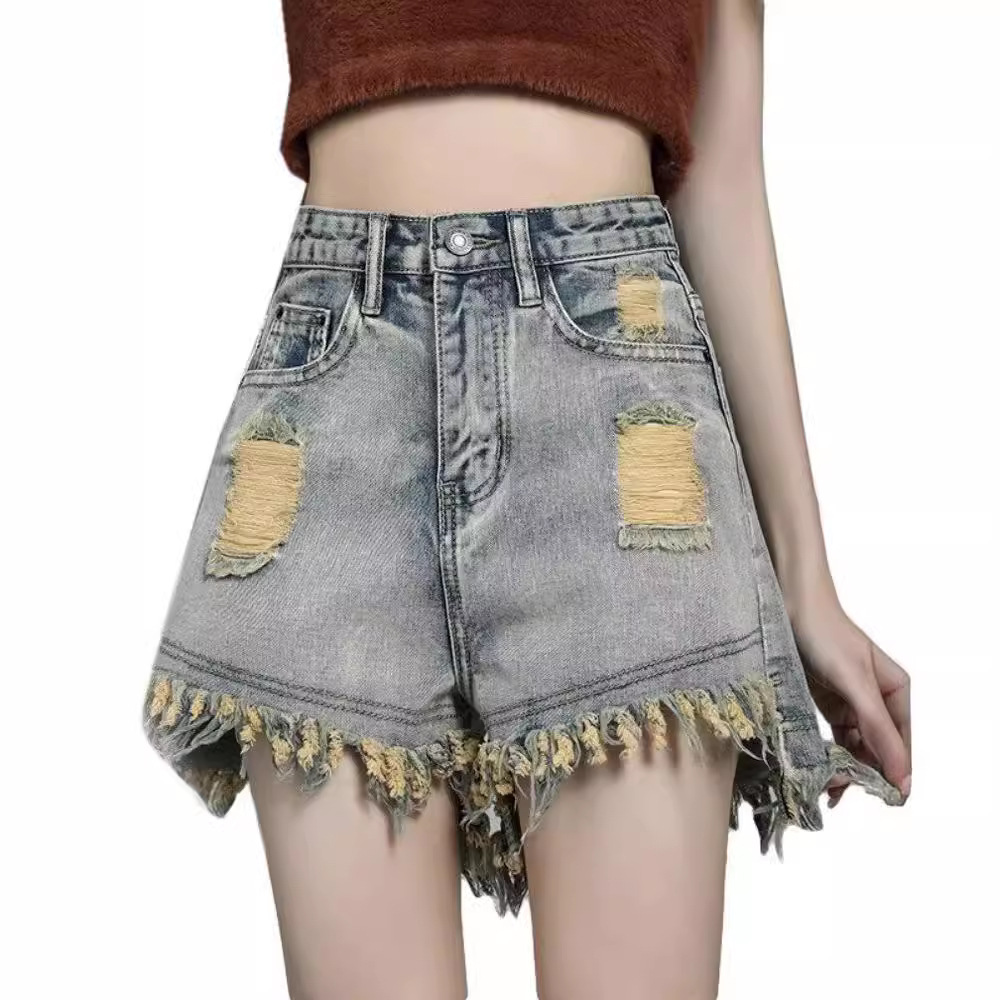 레트로 닳은 데님 반바지 여성을위한 2024 여름 새로운 높은 허리 슬리밍 단어 넓은 다리 핫팬츠 트렌디 한 플러스 사이즈스토어 가기