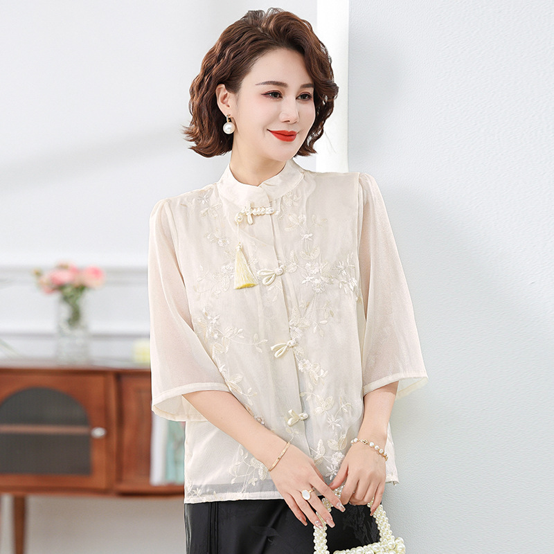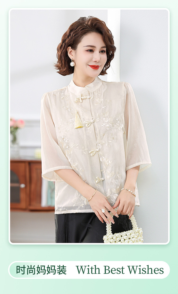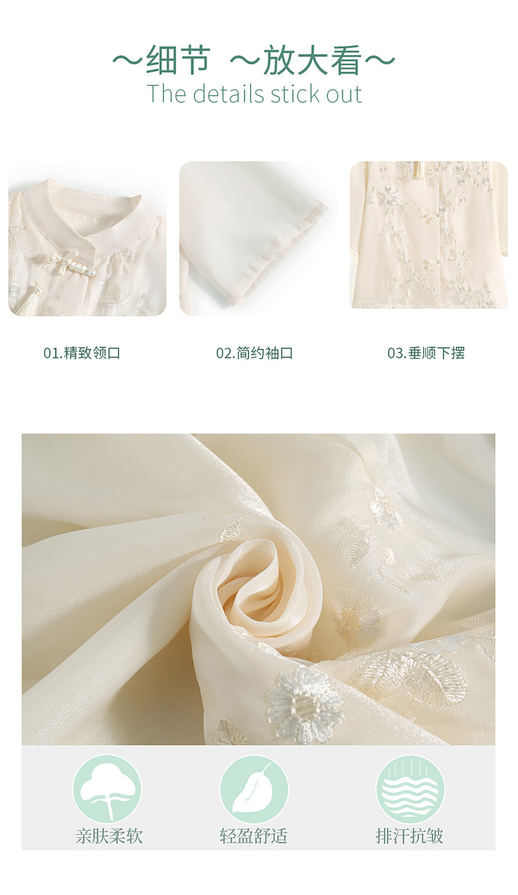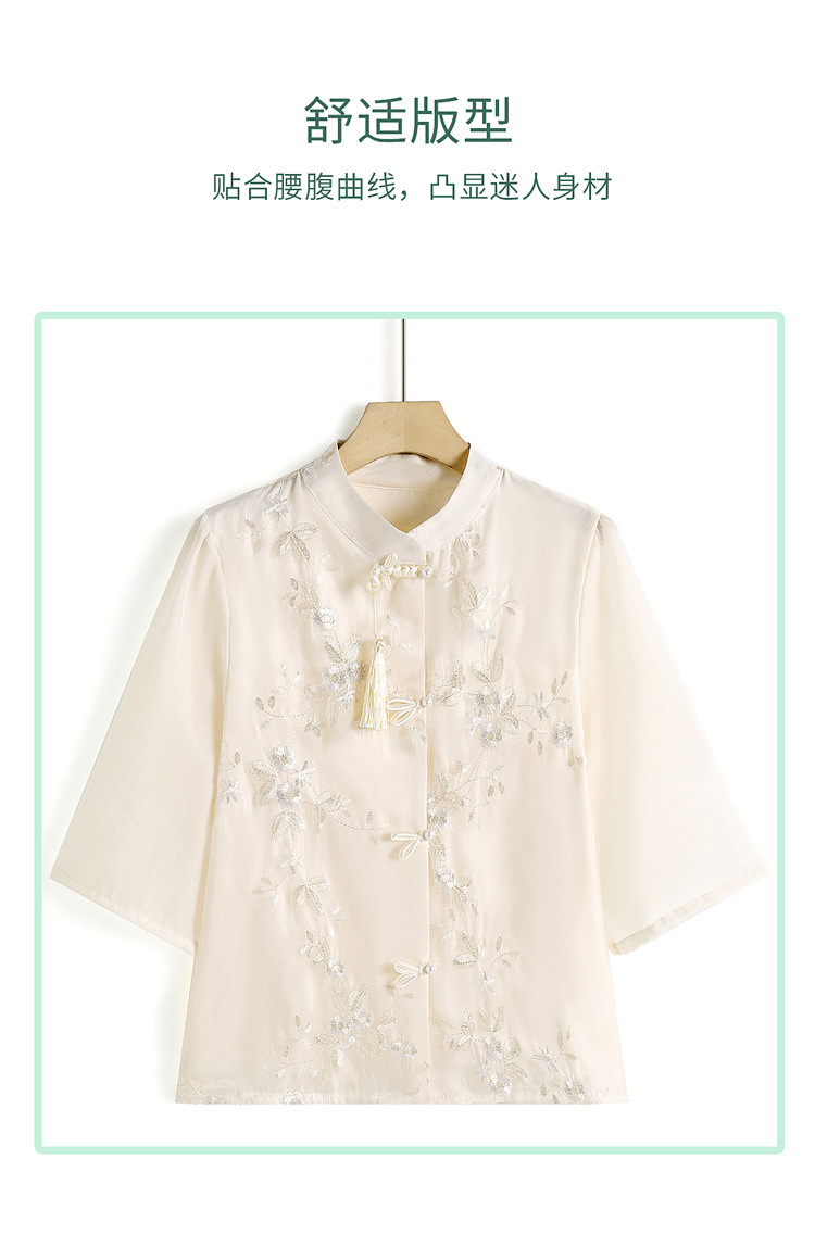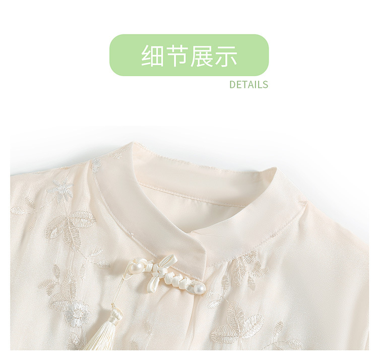 2024 봄과 여름 새로운 중국 스타일의 국가 스타일 버클 스탠드 칼라 캐주얼 쉬폰 수 놓은 셔츠와 여성을위한 스커트 투피스 세트스토어 가기