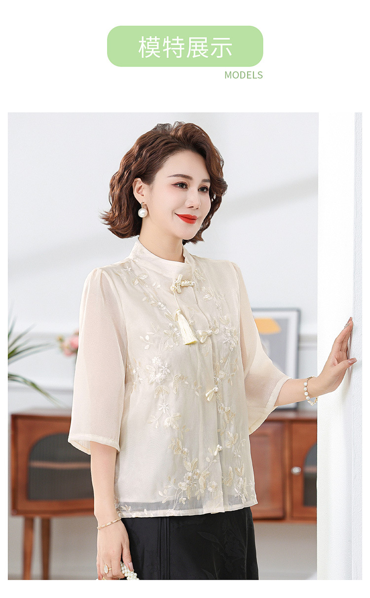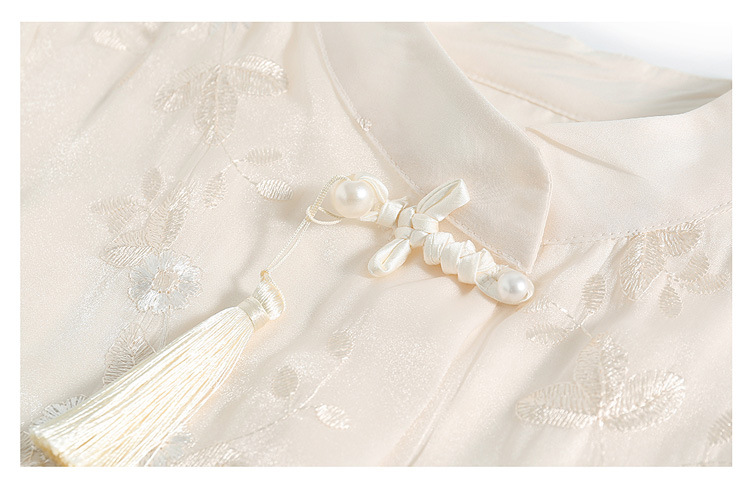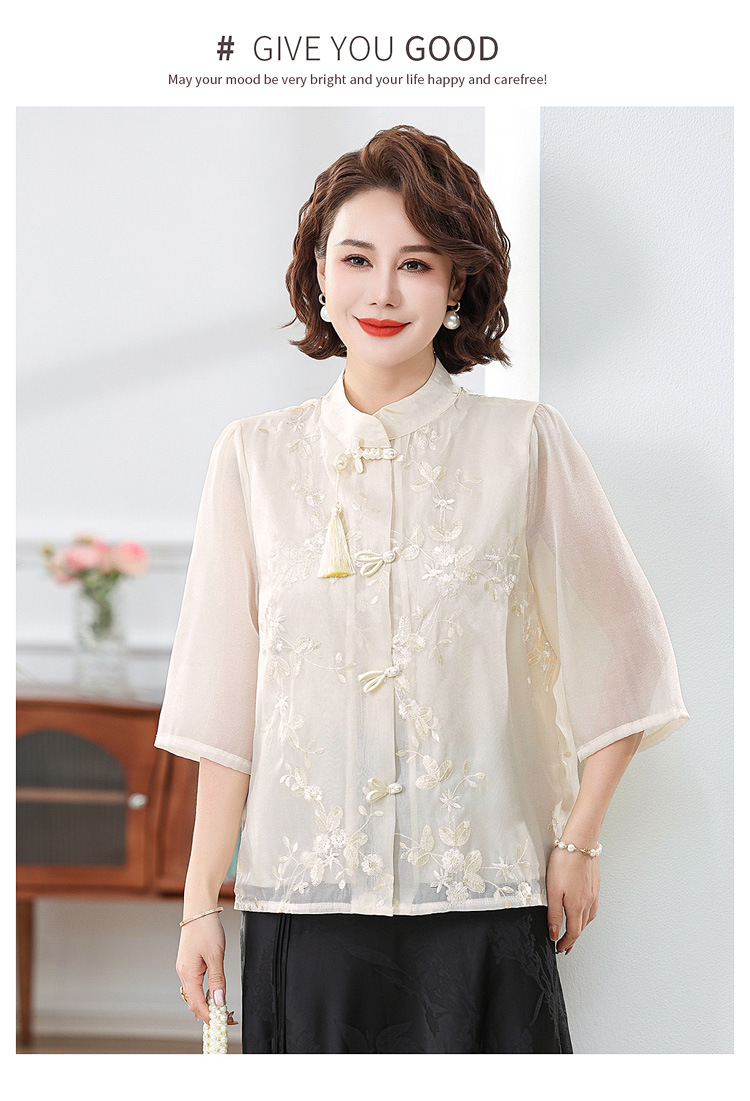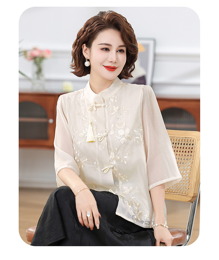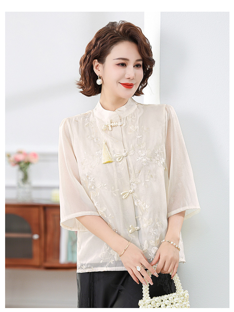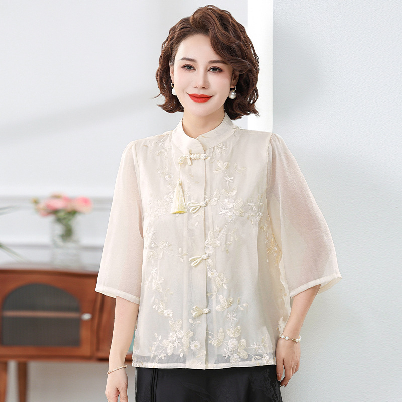 2024 봄과 여름 새로운 중국 스타일의 국가 스타일 버클 스탠드 칼라 캐주얼 쉬폰 수 놓은 셔츠와 여성을위한 스커트 투피스 세트스토어 가기