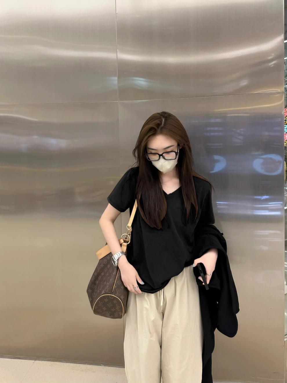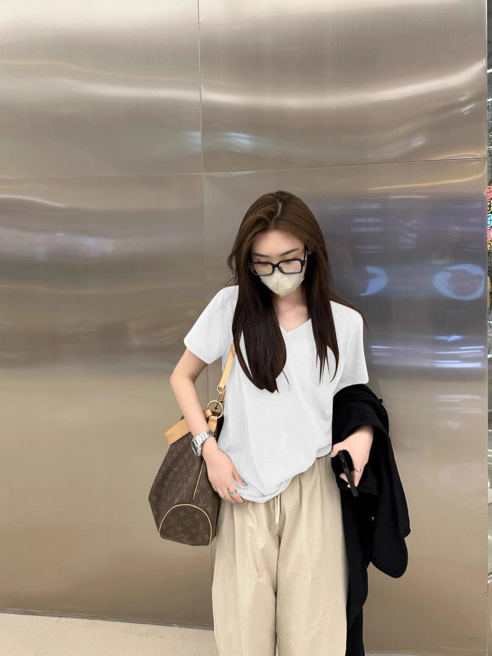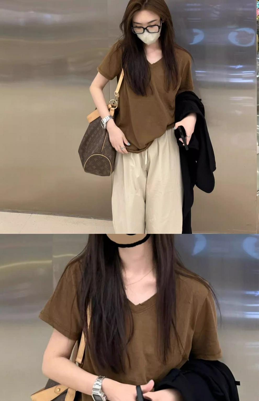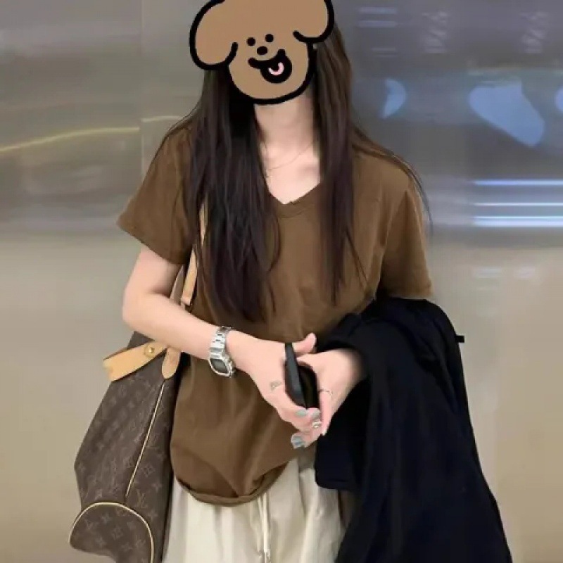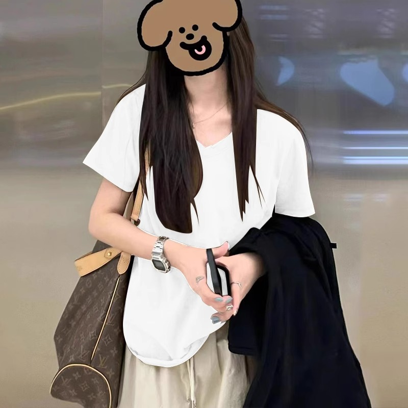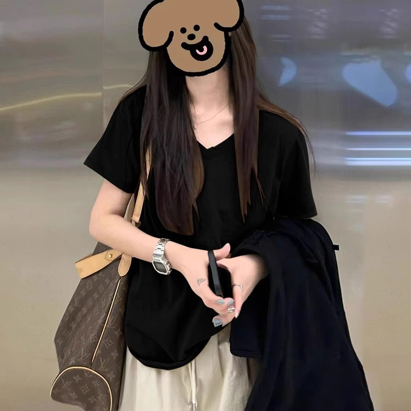 단색 티셔츠 여성의 짧은 소매 큰 목선면 V-목 바닥 낮은 칼라 내부 유행 최고 여성 달콤한 패션 올 매치스토어 가기