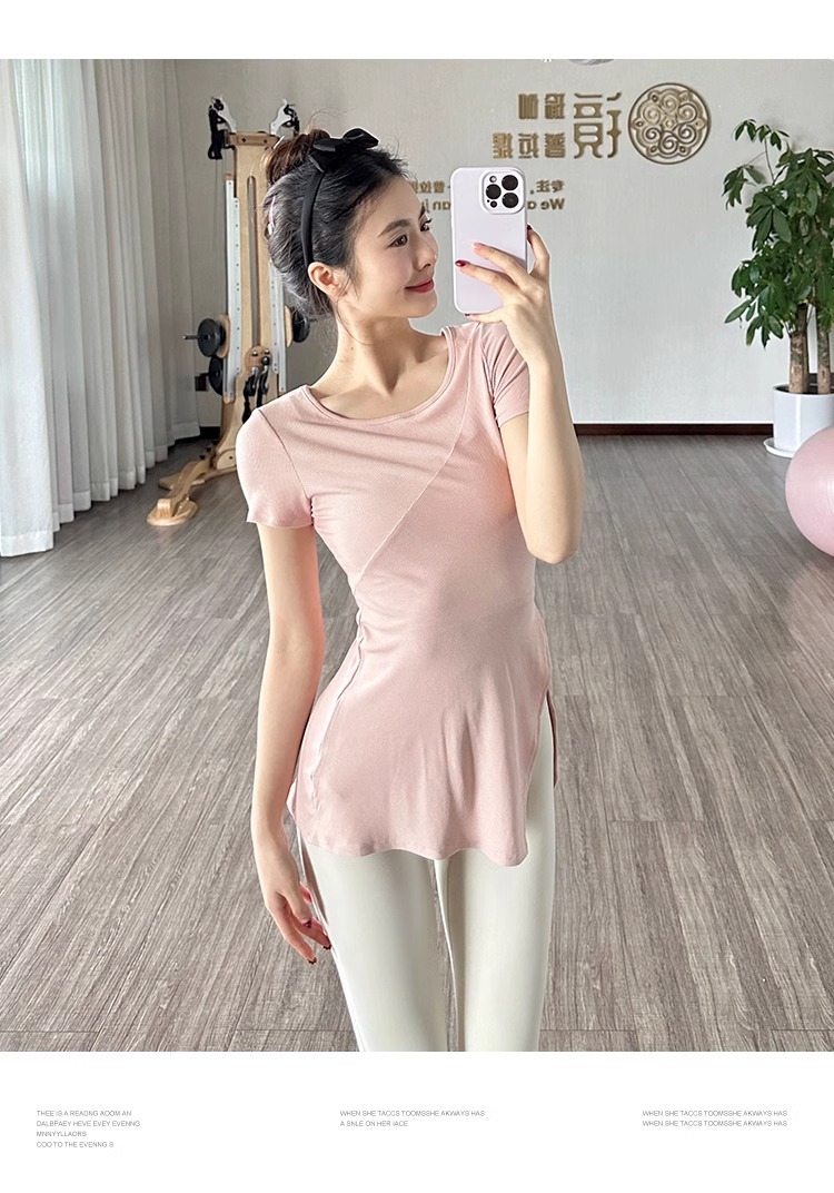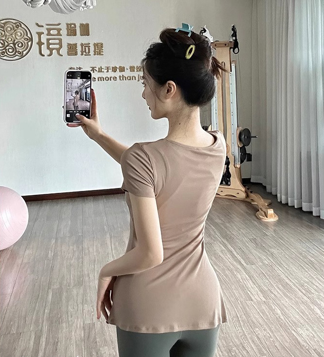 얇은 요가 옷 슬리밍 빠른 건조 탑 야외 아침 느슨한 엉덩이 커버 반팔 블라우스 여성용 티셔츠 피트니스 훈련스토어 가기
