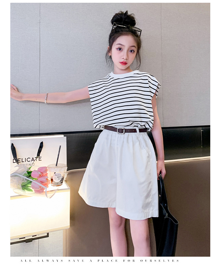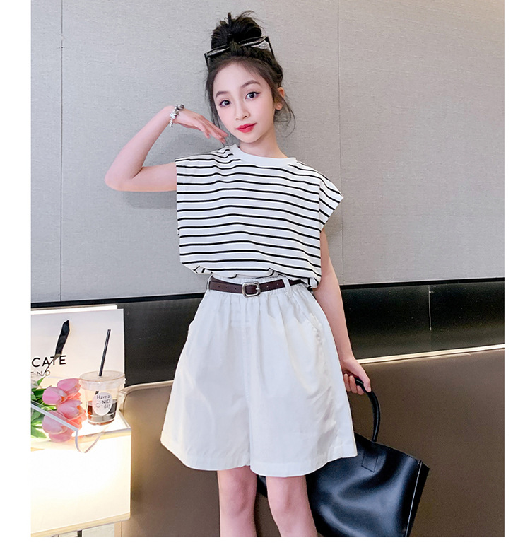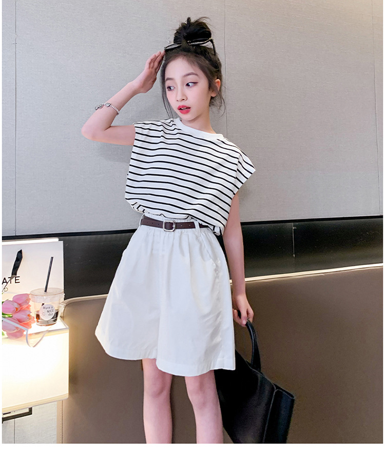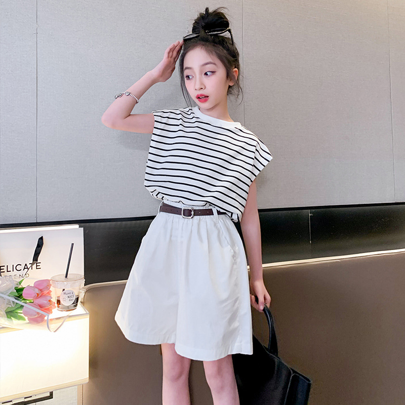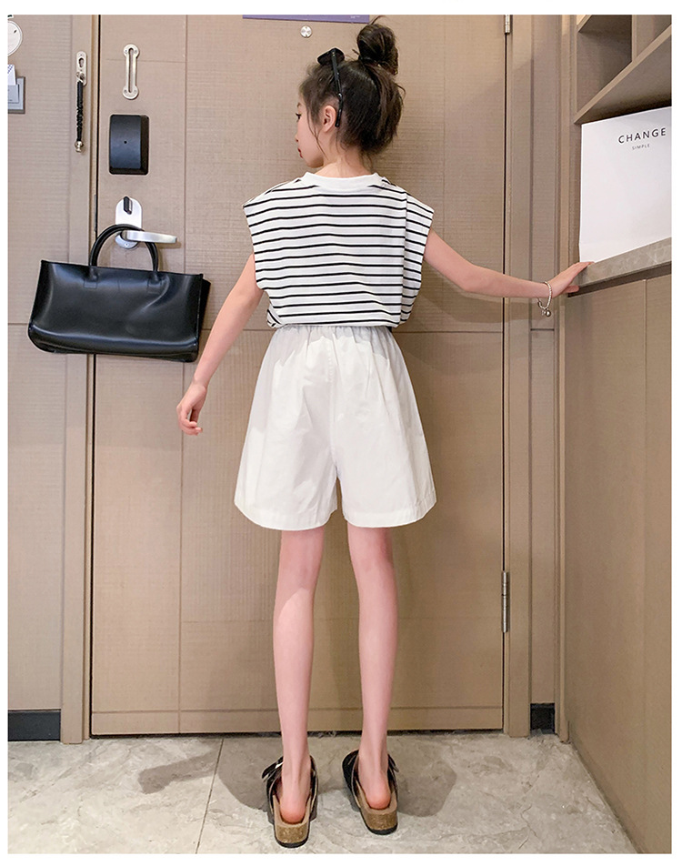 소녀 여름 착용 2024 새로운 서양식 유행 한국 스포츠 큰 어린이 여름 짧은 소매 반바지 세트 아동복