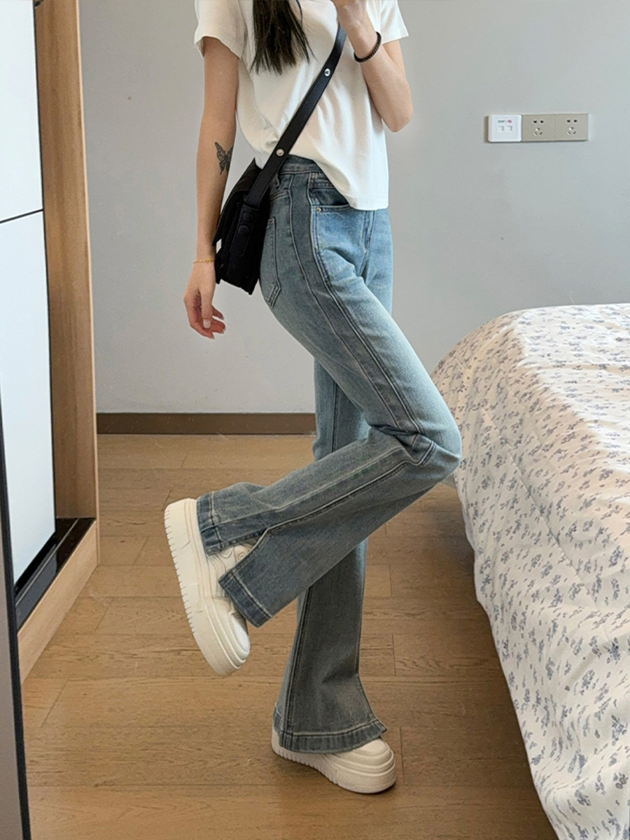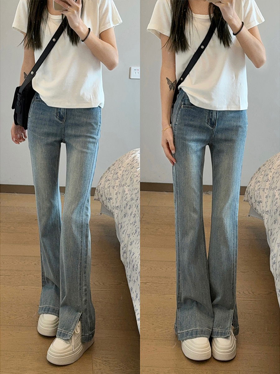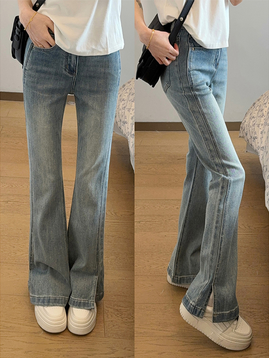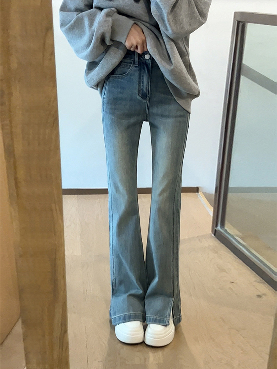 밝은 색의 높은 허리 스플릿 스키니 청바지 여성의 봄과 가을 작은 좁은 스트레이트 바지 말굽 걸레 긴 바지
