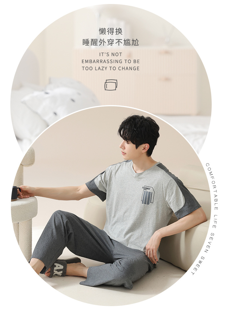 Longshijia 남성 잠옷 코튼 여름 반팔 바지 컬러 매칭 세트 한국식 코튼 홈웨어 밖에서 입을 수 있습니다.