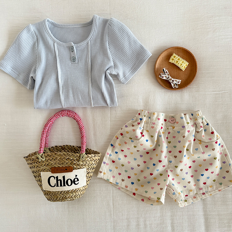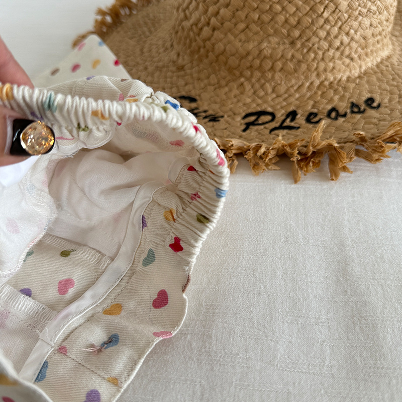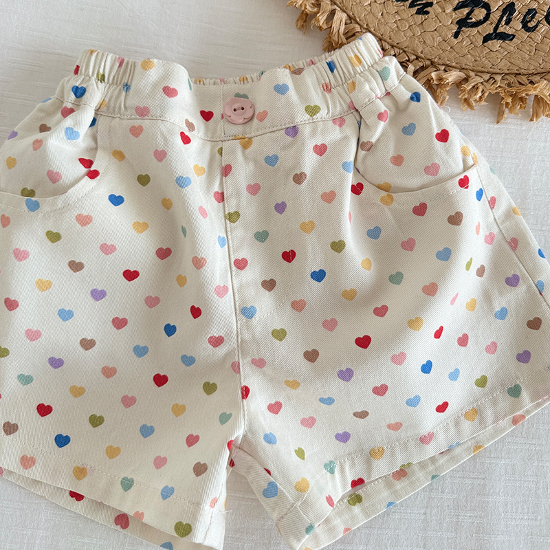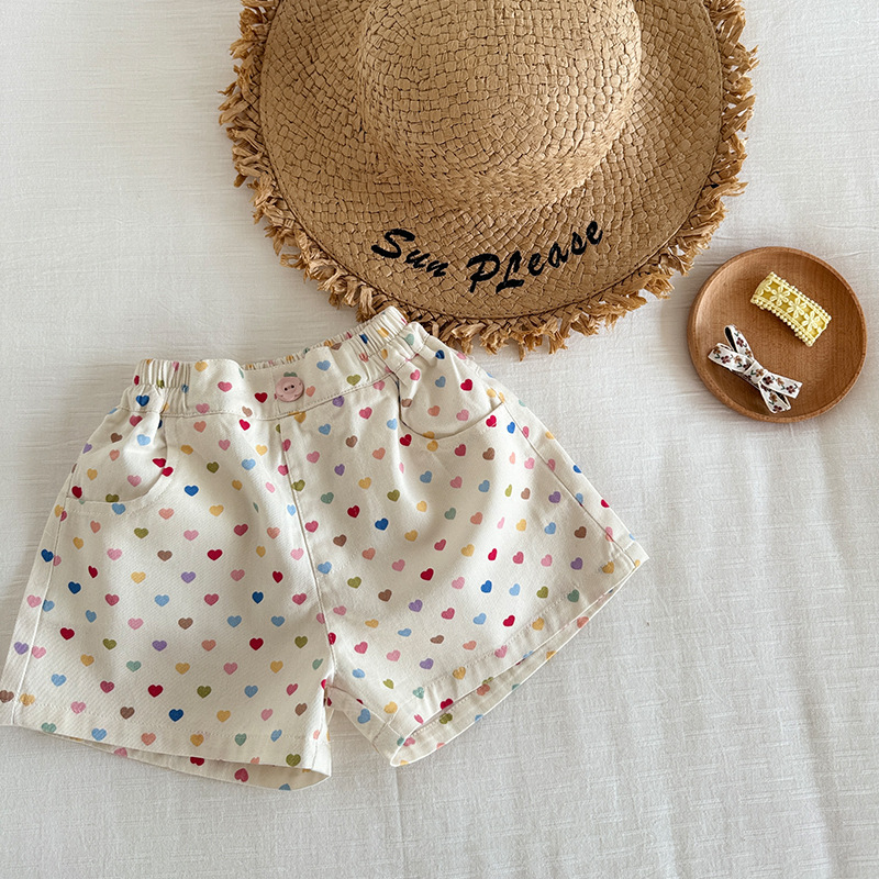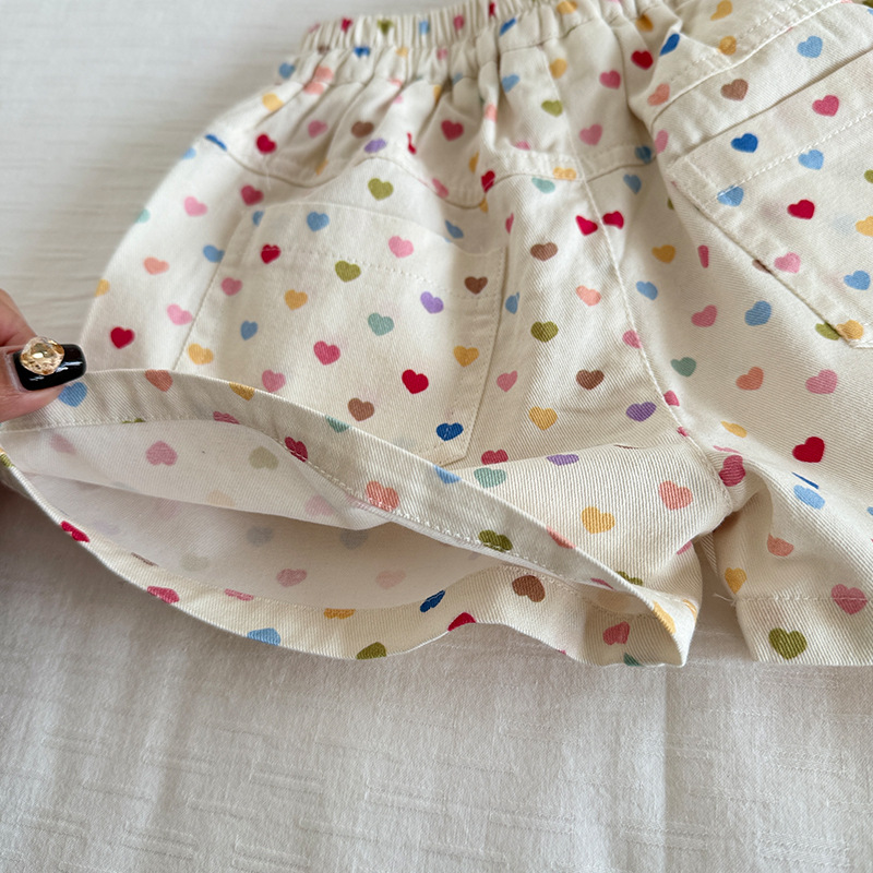 2025 새로운 여름 스타일 어린이와 소녀 한국 스타일 목가적 인 소녀 다채로운 사랑 인쇄 능직 반바지스토어 가기