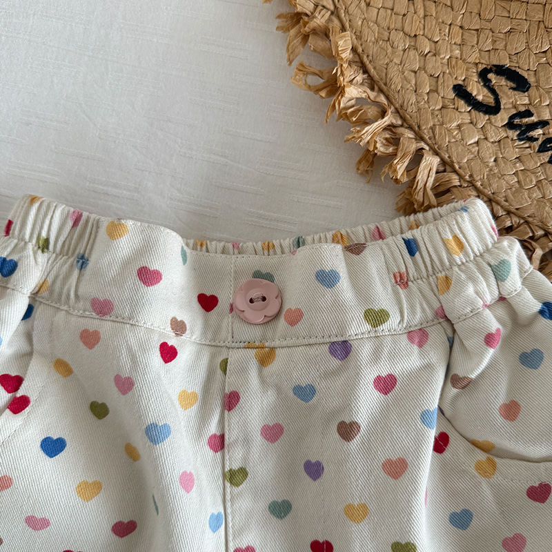 2025 새로운 여름 스타일 어린이와 소녀 한국 스타일 목가적 인 소녀 다채로운 사랑 인쇄 능직 반바지