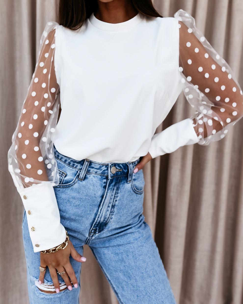 유럽과 미국의 Amazon 독립 스테이션 2024 봄 여름 신작 여성 긴팔 탑 메쉬 레이스 스플 라이스 쉬폰 셔츠스토어 가기