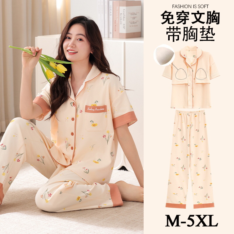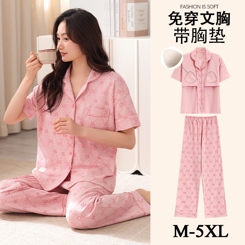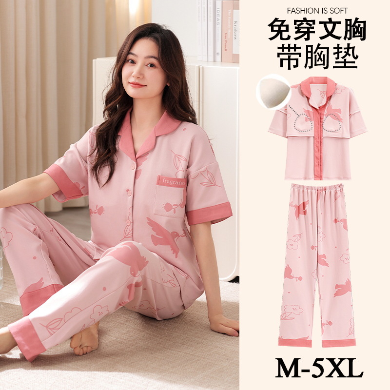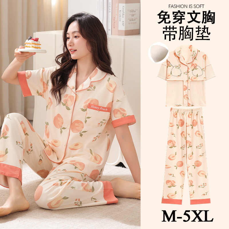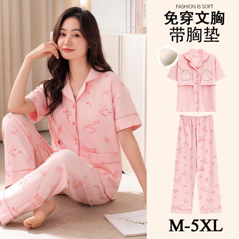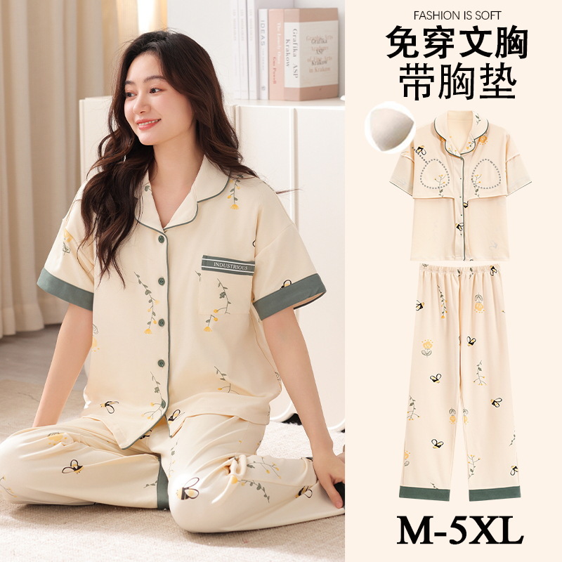 가슴 패드가 달린 여성용 잠옷 여름면 반팔 바지 카디건 세트 초대형 지방 mm200kg 220kg 5XL스토어 가기