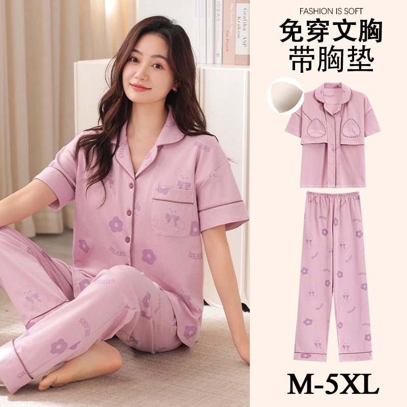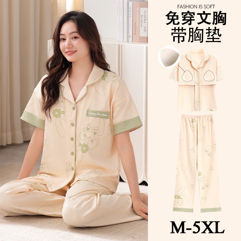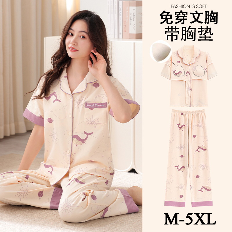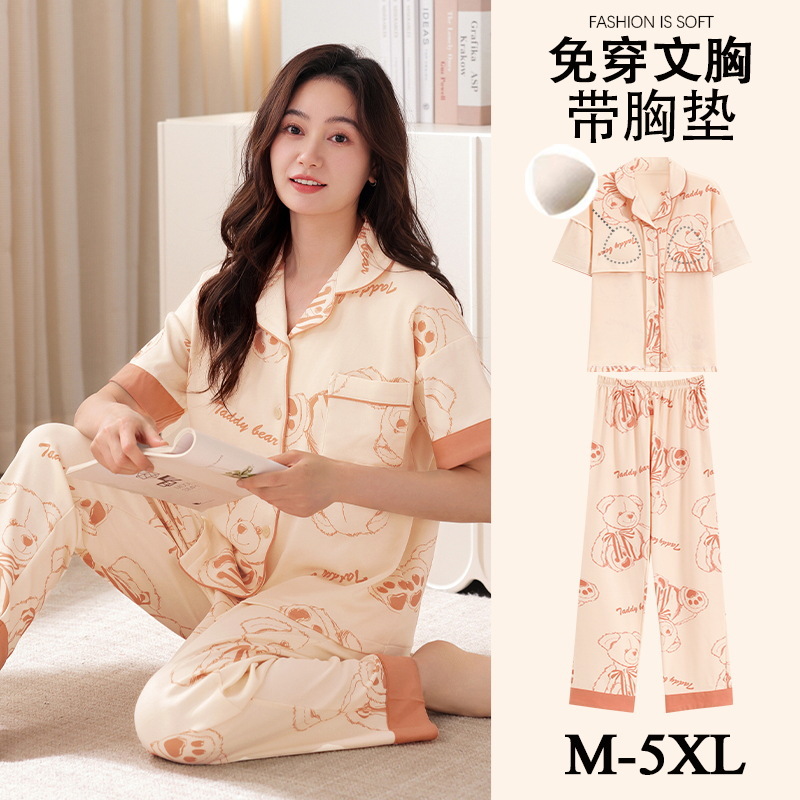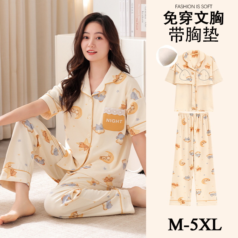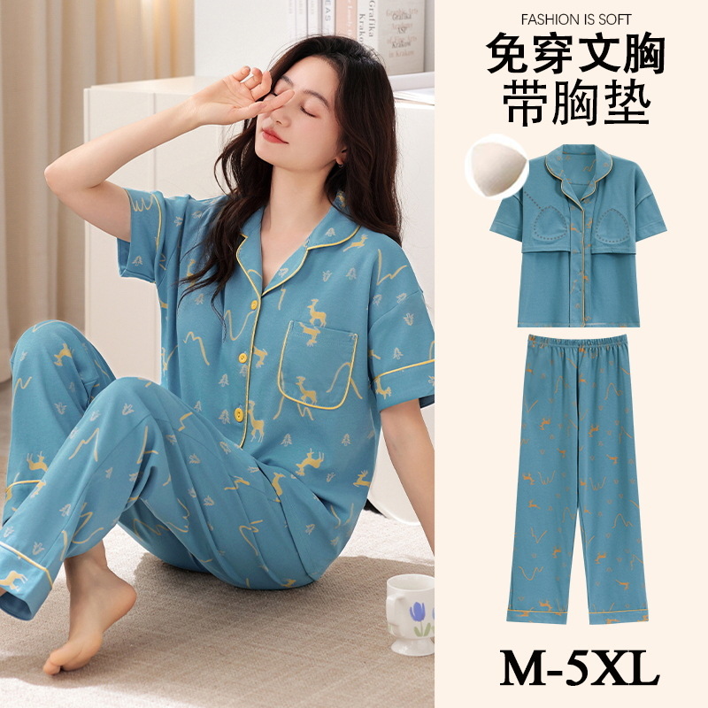 가슴 패드가 달린 여성용 잠옷 여름면 반팔 바지 카디건 세트 초대형 지방 mm200kg 220kg 5XL스토어 가기