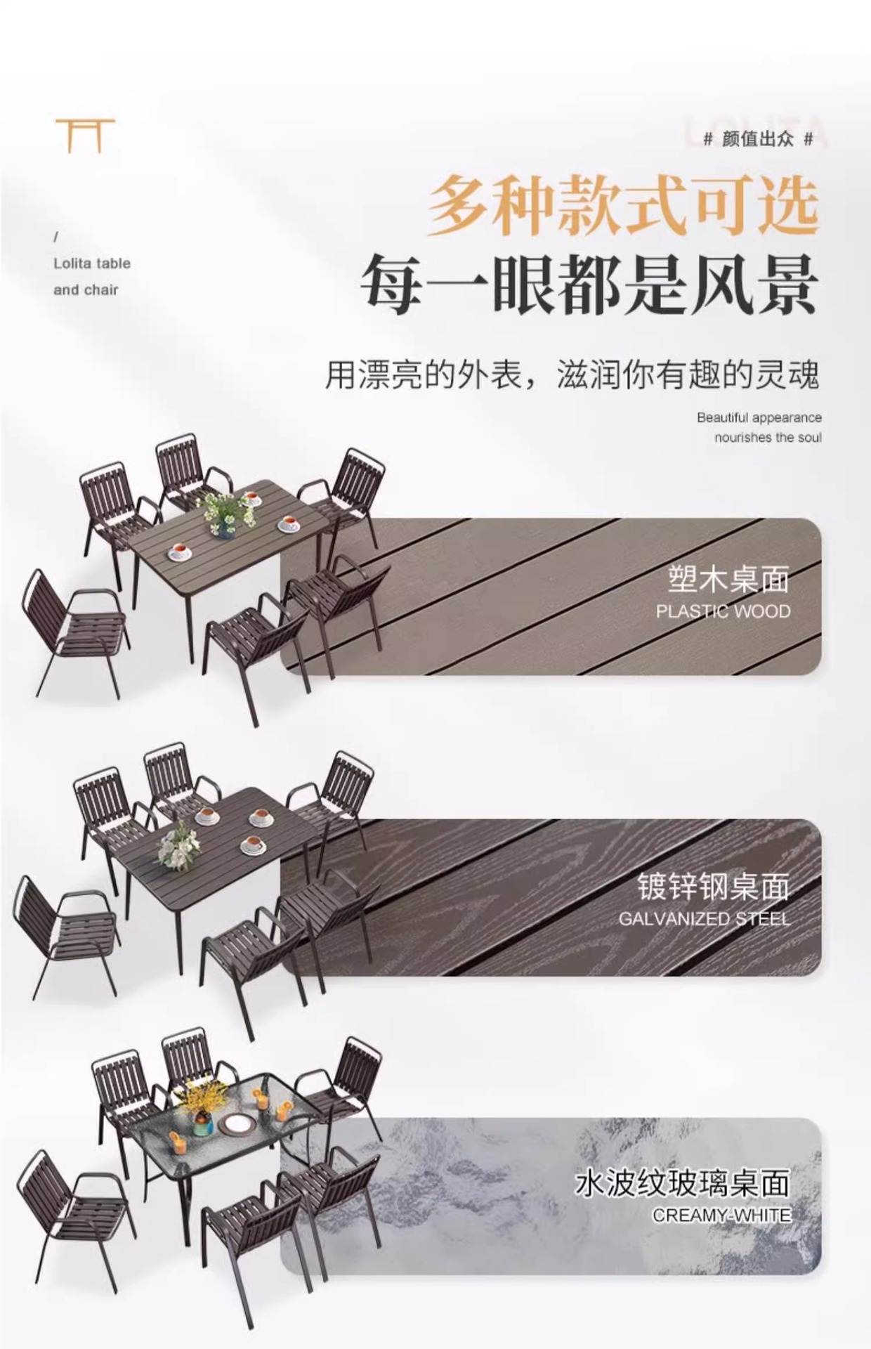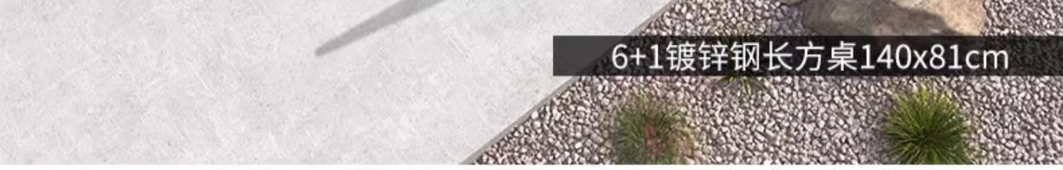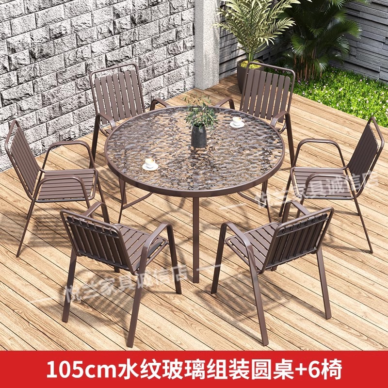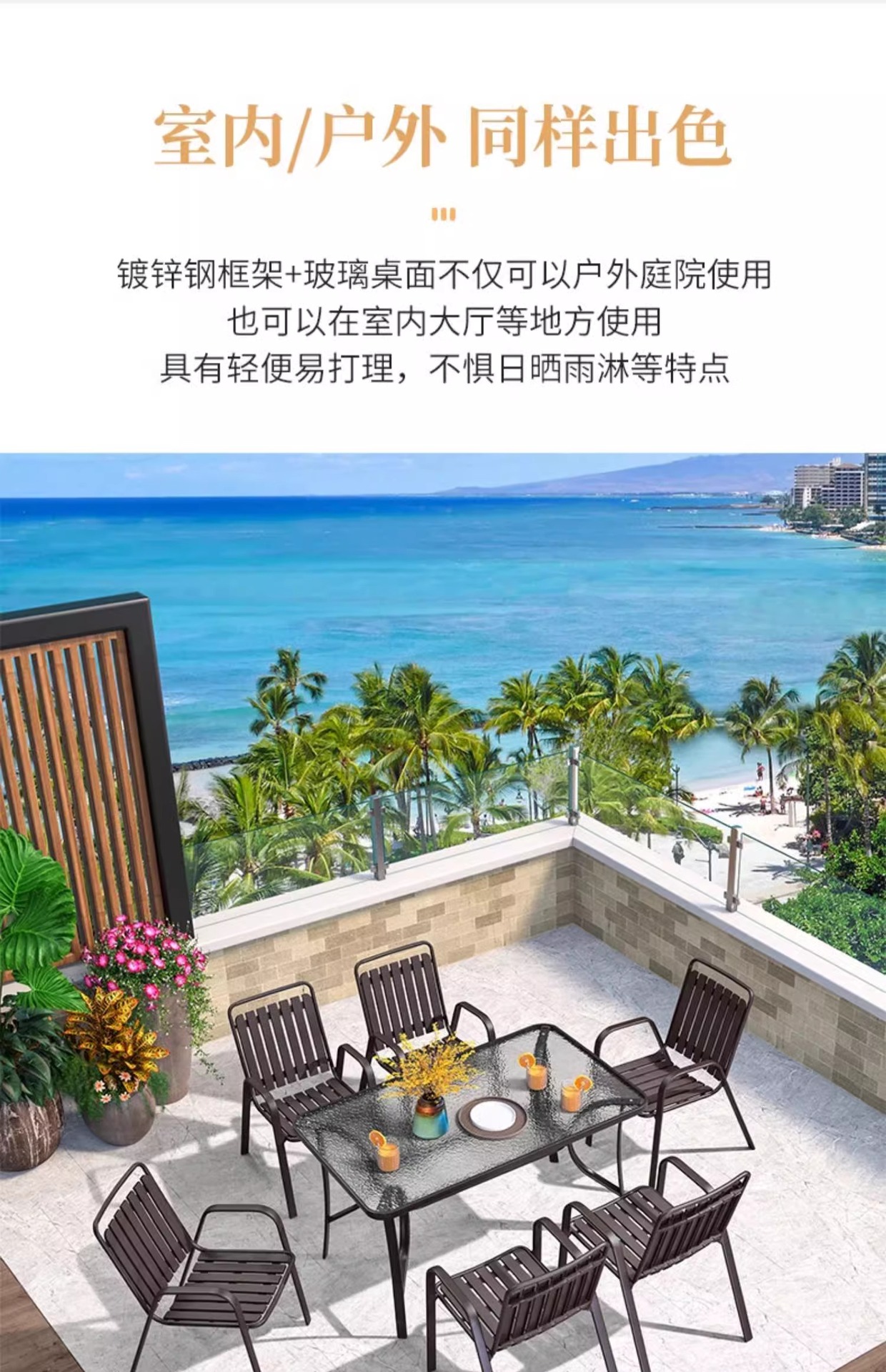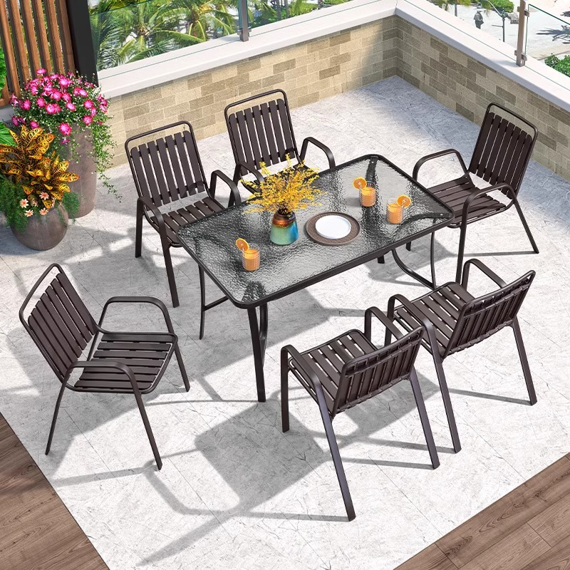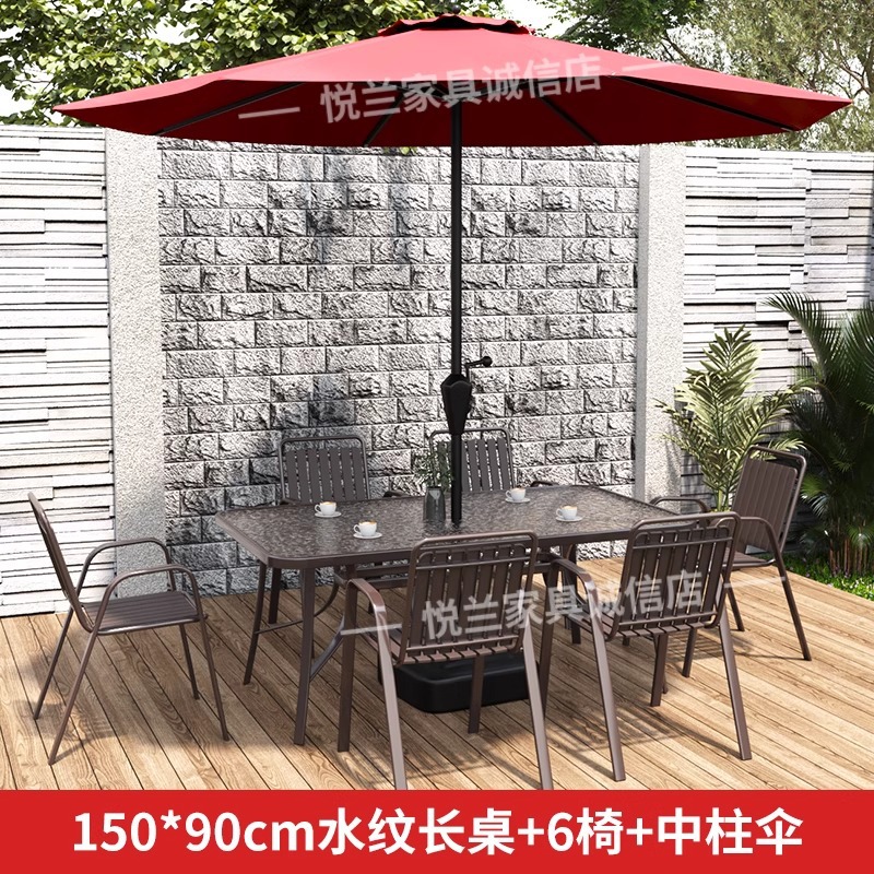 • 150*90cm 강화유리 조립식 긴 테이블 + 수직 의자 6개 + 빨간색 단일 상단 중앙 기둥 우산