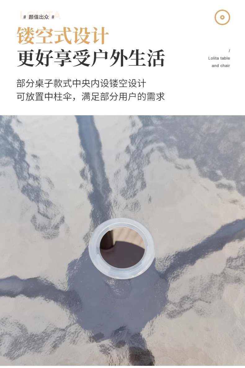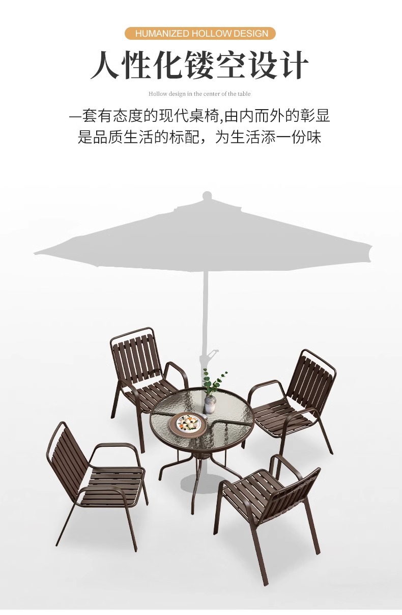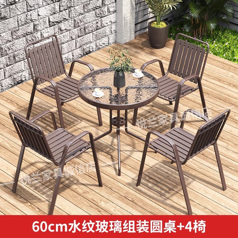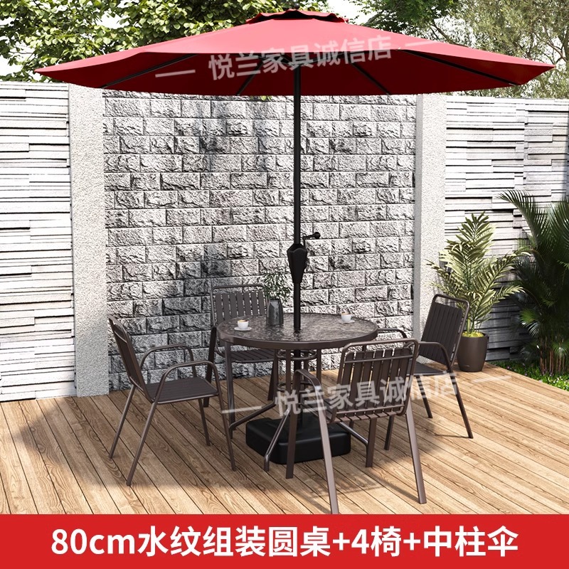• 80cm 강화유리 조립 원형 테이블 + 수직 의자 4개 + 빨간색 단일 상단 중앙 기둥 우산