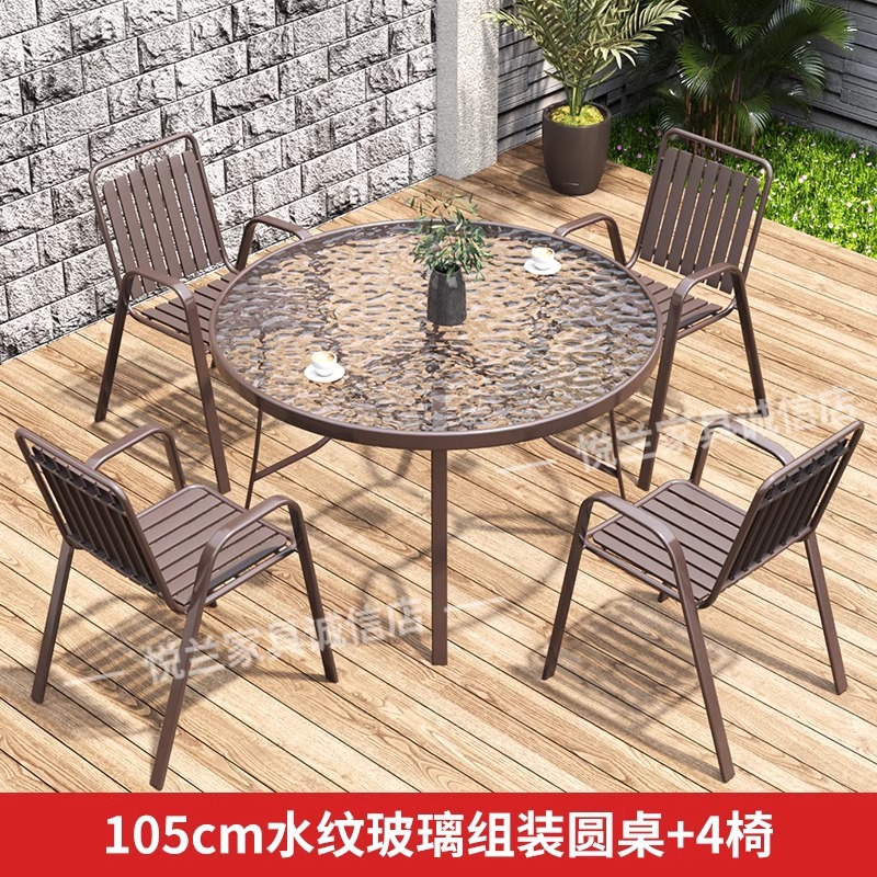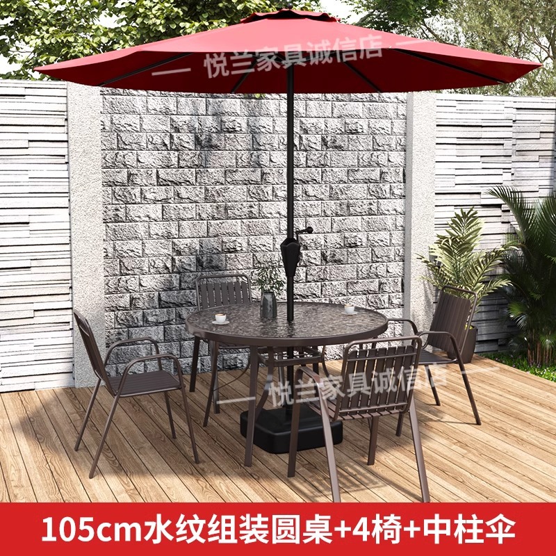 • 106cm 강화유리 조립 원형 테이블 + 수직 의자 4개 + 빨간색 단일 상단 중앙 기둥 우산