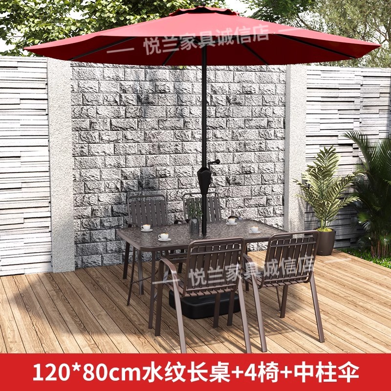 • 120*80cm 강화유리 조립식 긴 테이블 + 수직 의자 4개 + 빨간색 단일 상단 중앙 기둥 우산