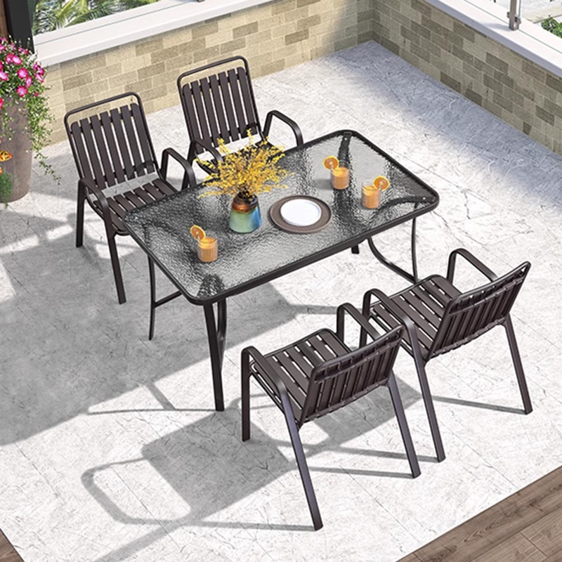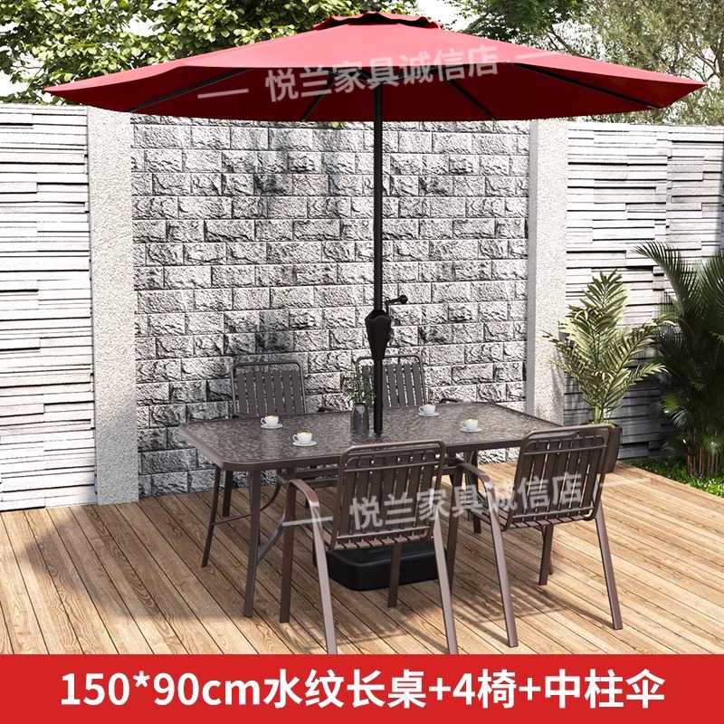 • 150*90cm 강화유리 조립식 긴 테이블 + 수직 의자 4개 + 빨간색 단일 상단 중앙 기둥 우산