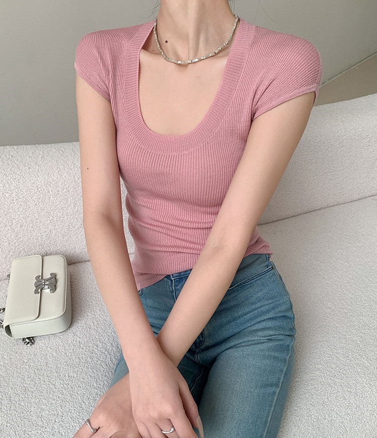 JWUNIQUE 핑크 여성을위한 U-넥 반팔 스웨터 여름 2024 새로운 슬림 핏 슬리밍 셔츠 탑
