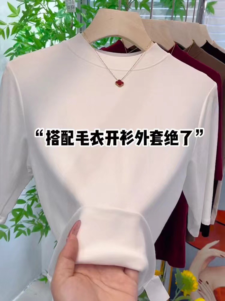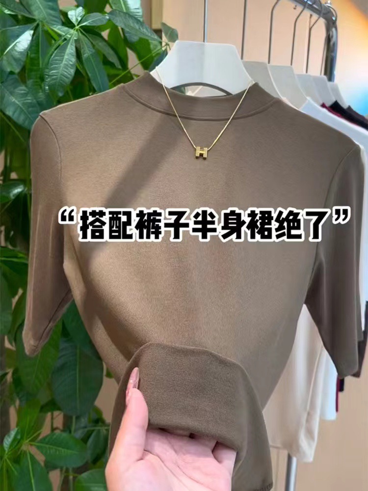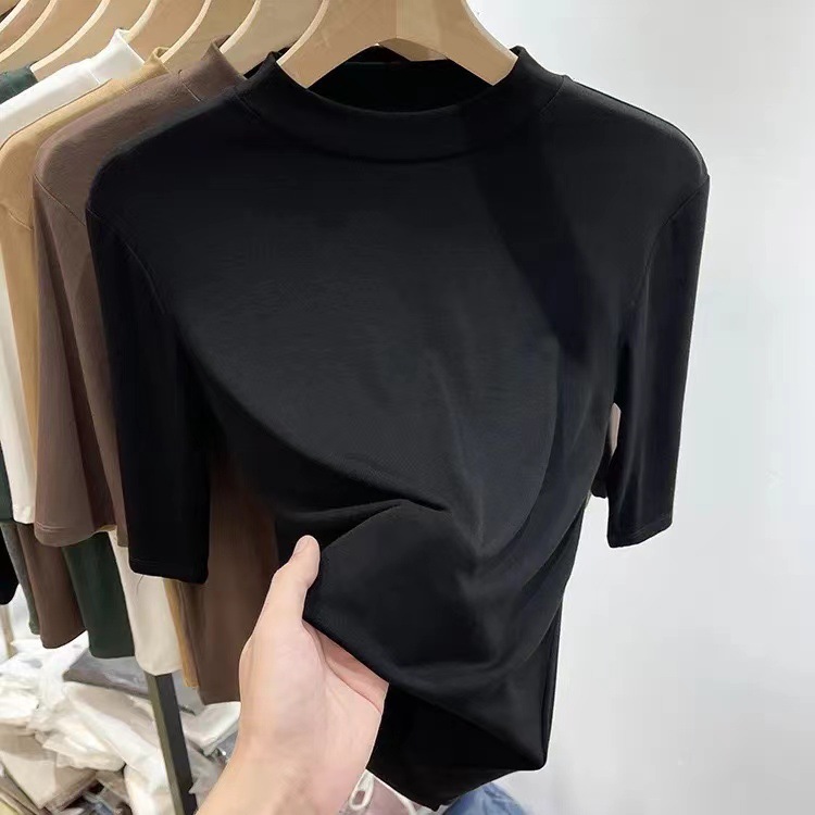 2024 새로운 모달면 하프 소매 여성의 단색 패션 올 매치 T 슬리밍 바닥 셔츠 봄과 여름 미드 칼라 탑