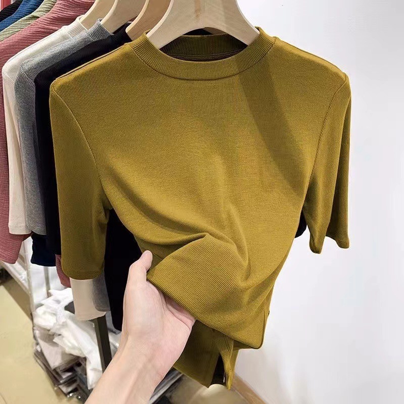 2024 새로운 모달면 하프 소매 여성의 단색 패션 올 매치 T 슬리밍 바닥 셔츠 봄과 여름 미드 칼라 탑스토어 가기