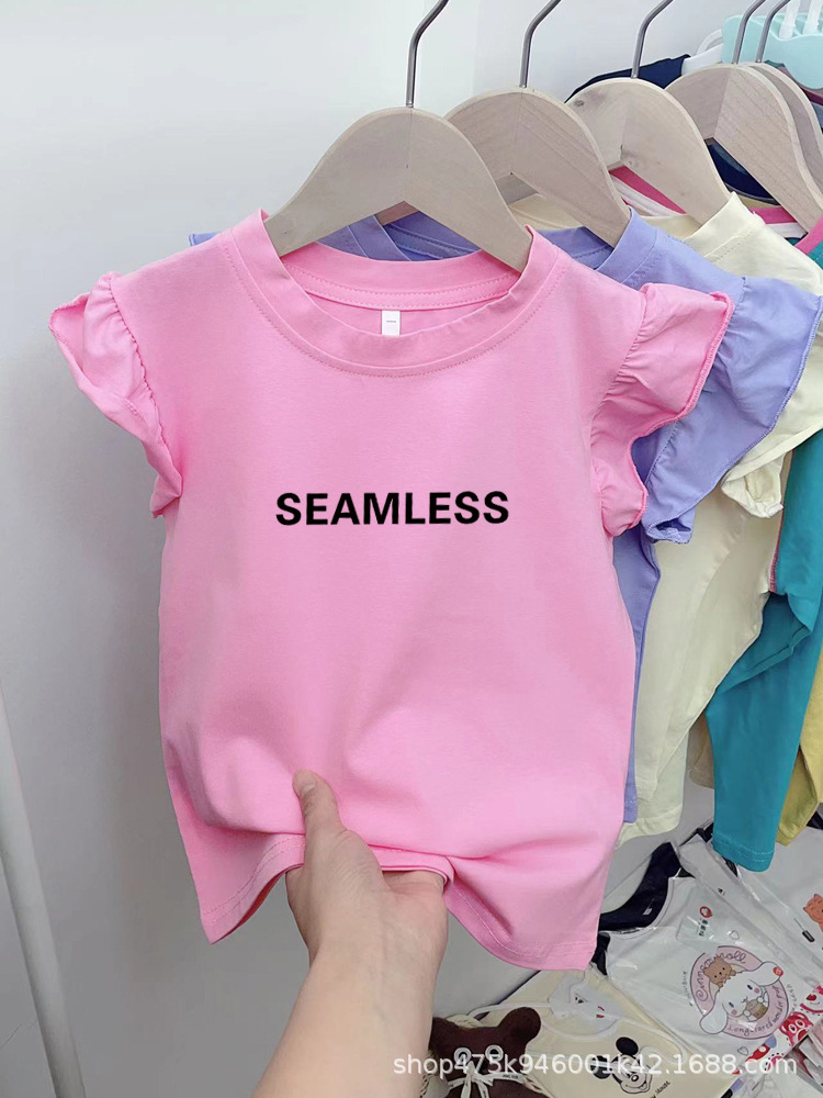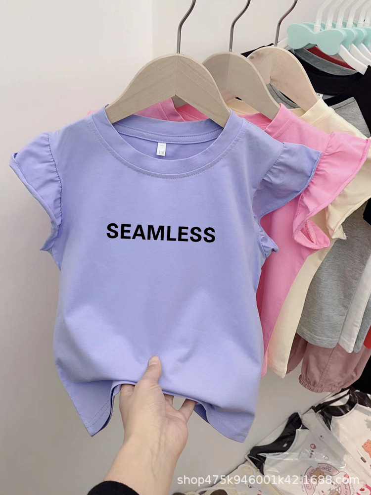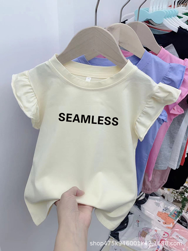 도매 어린이 편지 인쇄면 반팔 티셔츠 한국 스타일 여름 소녀의 세련된 연꽃 잎 작은 비행 소매 탑
