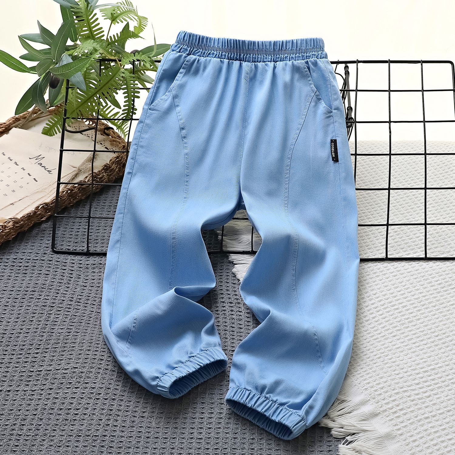 어린이용 여름 데님 모기 방지 바지, 능직 텐셀 스트레치 바지, 중대형 어린이를 위한 여름 속건성 플랫 와이드 팬츠스토어 가기