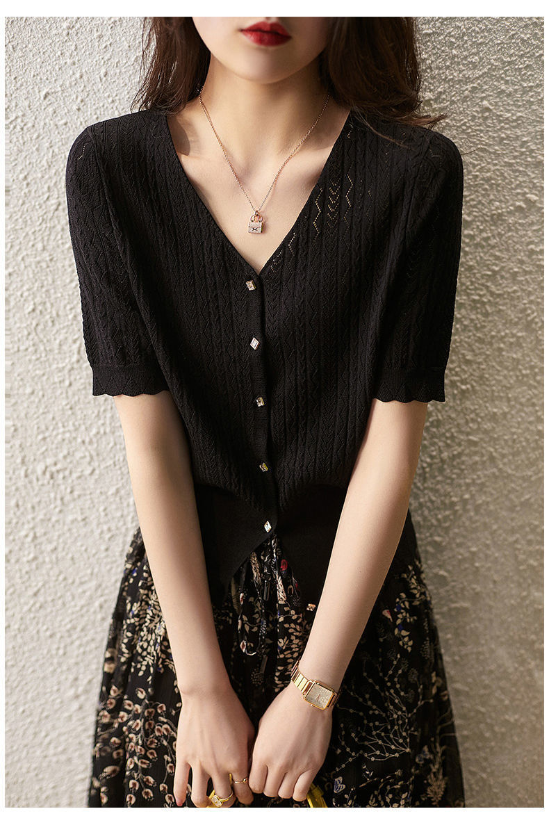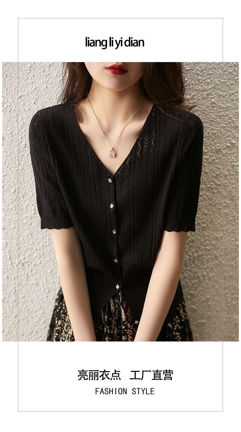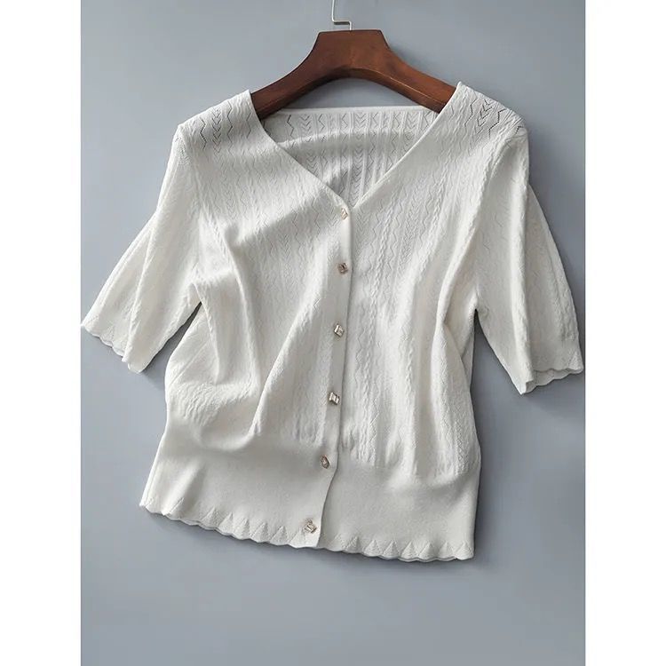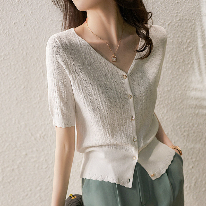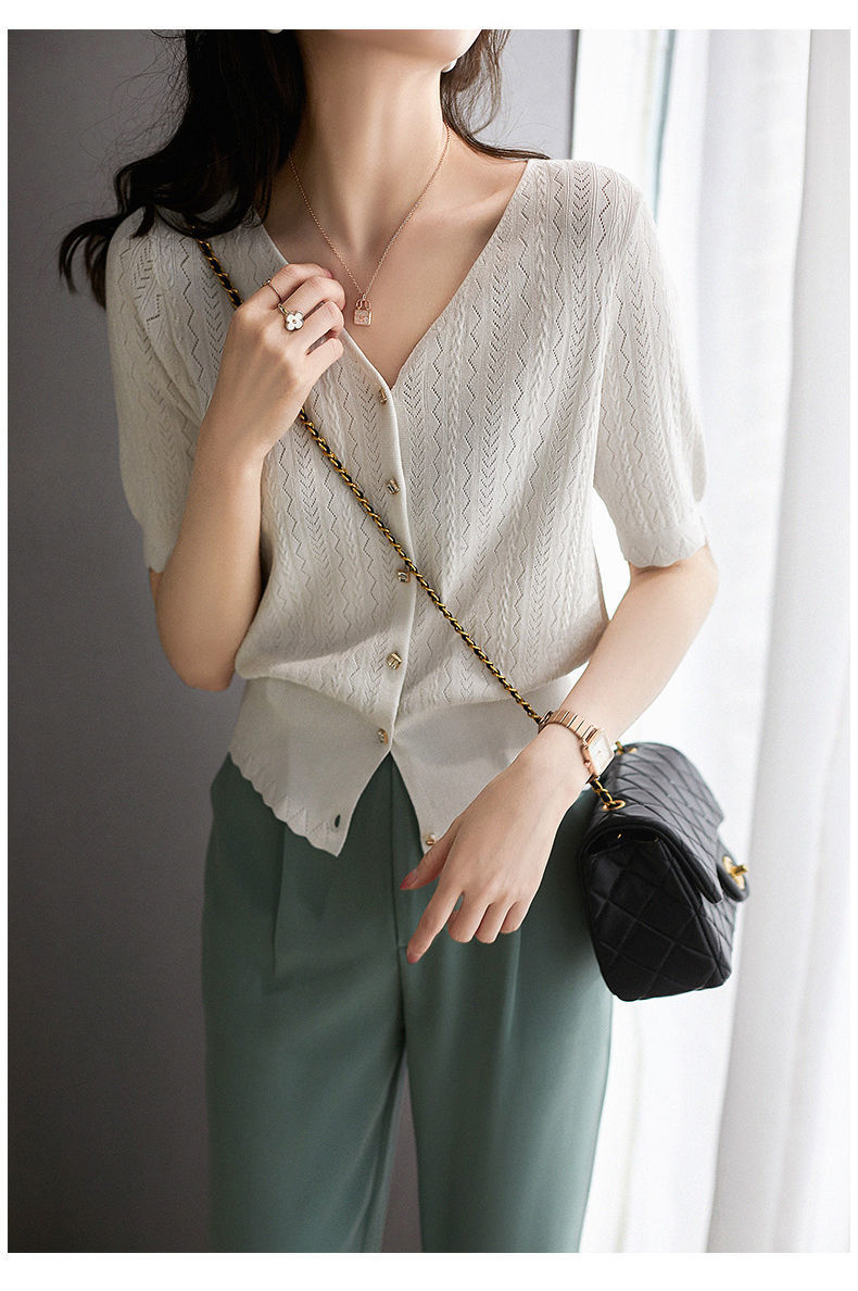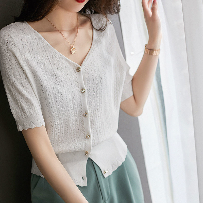 V 넥 카디건 여성의 새로운 디자인 감각 틈새 스웨터 단색 패션 에어컨 셔츠 한국식 중공 아이스 실크 탑