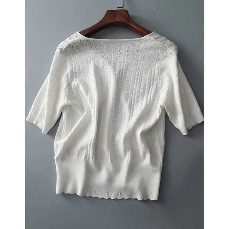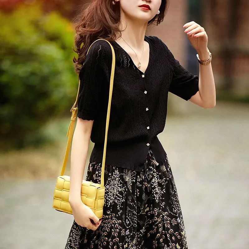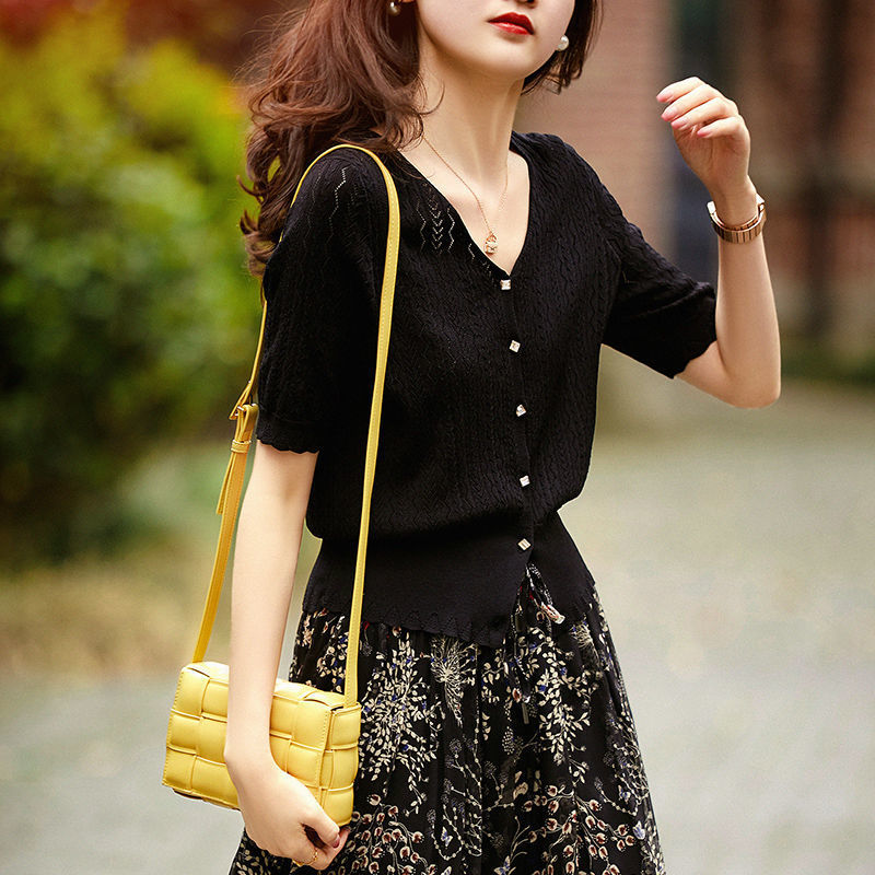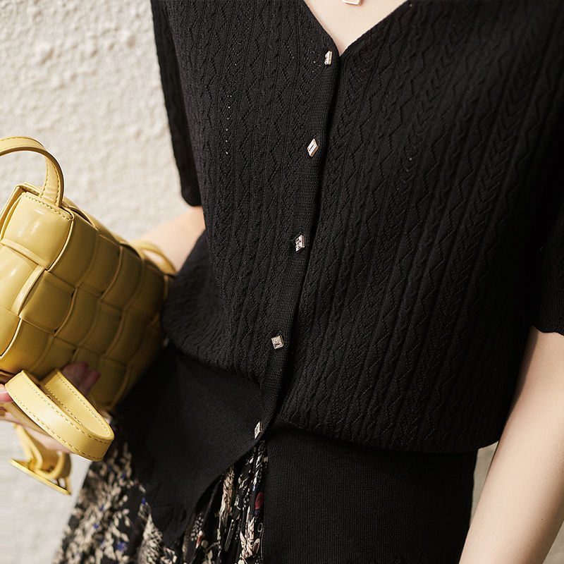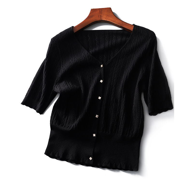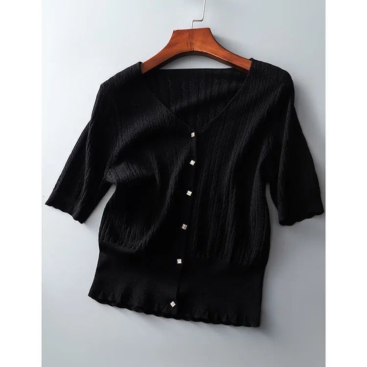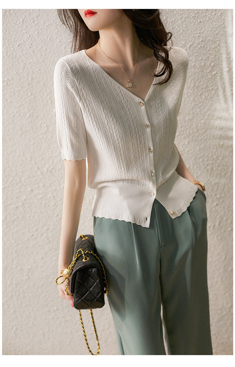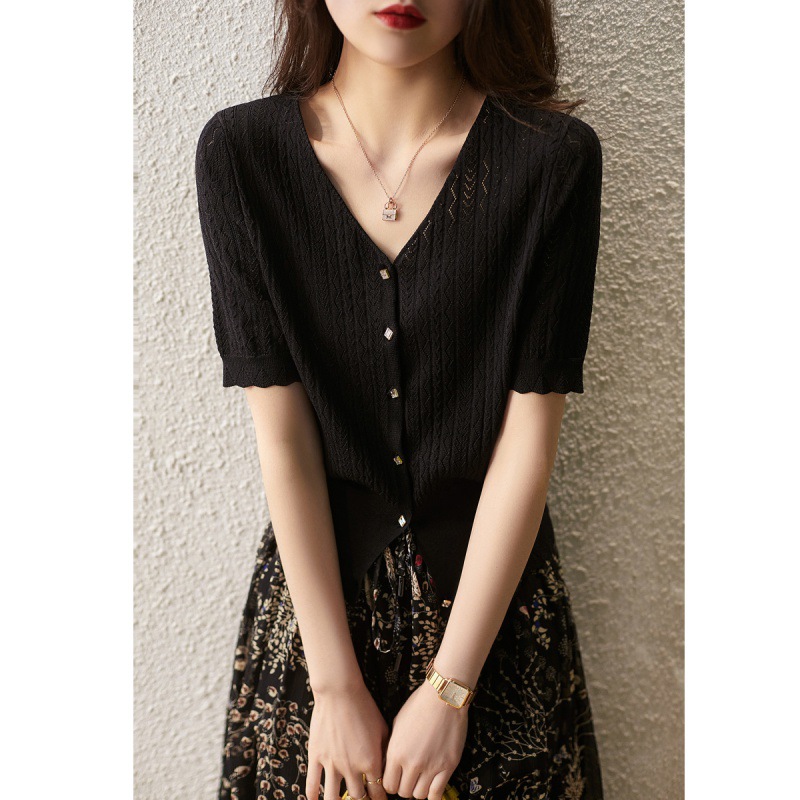 V 넥 카디건 여성의 새로운 디자인 감각 틈새 스웨터 단색 패션 에어컨 셔츠 한국식 중공 아이스 실크 탑