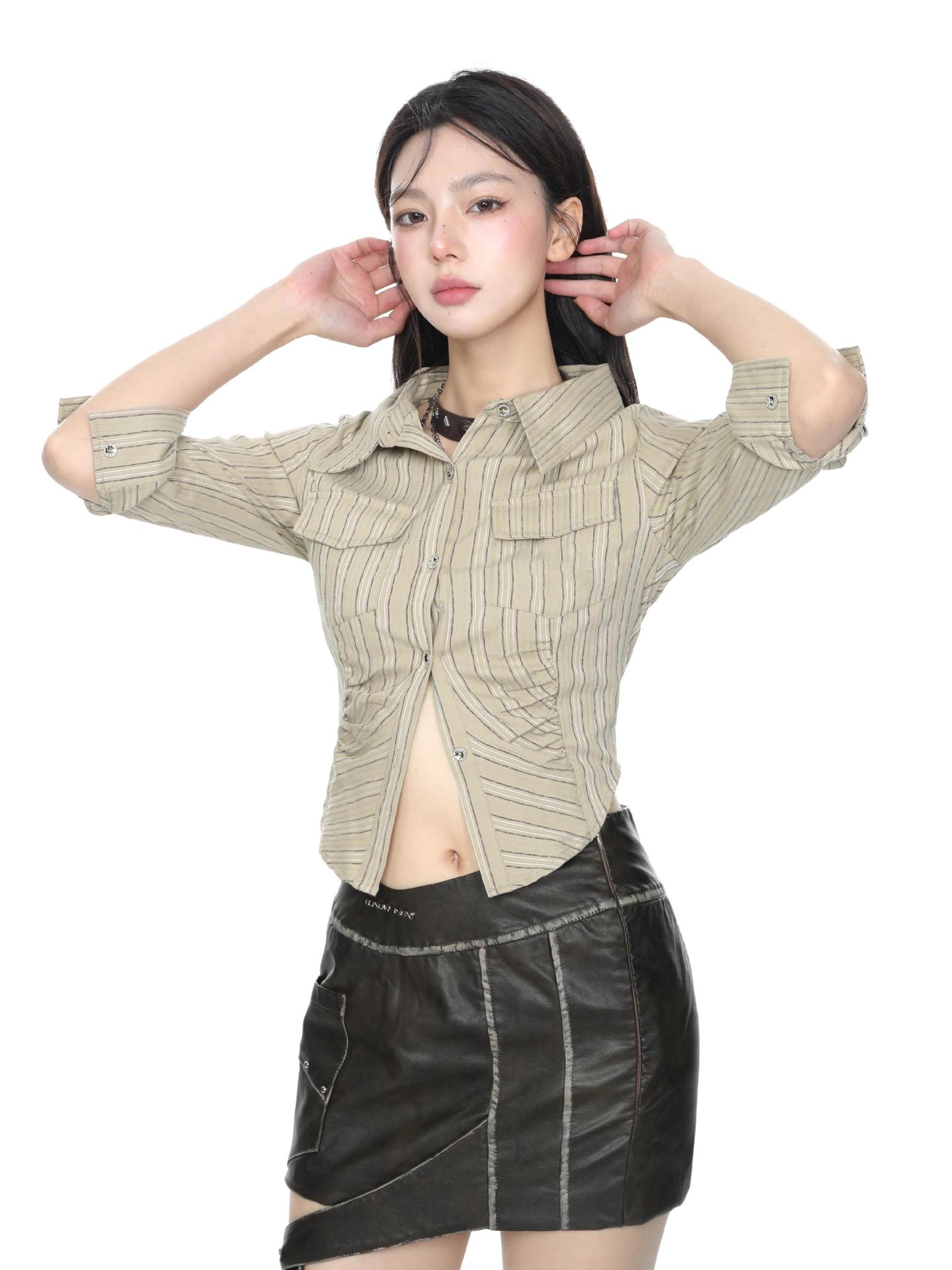미국 스타일의 이른 봄 줄무늬 셔츠 여성의 봄과 여름 슬림 핏 허리 주름 셔츠 탑스토어 가기