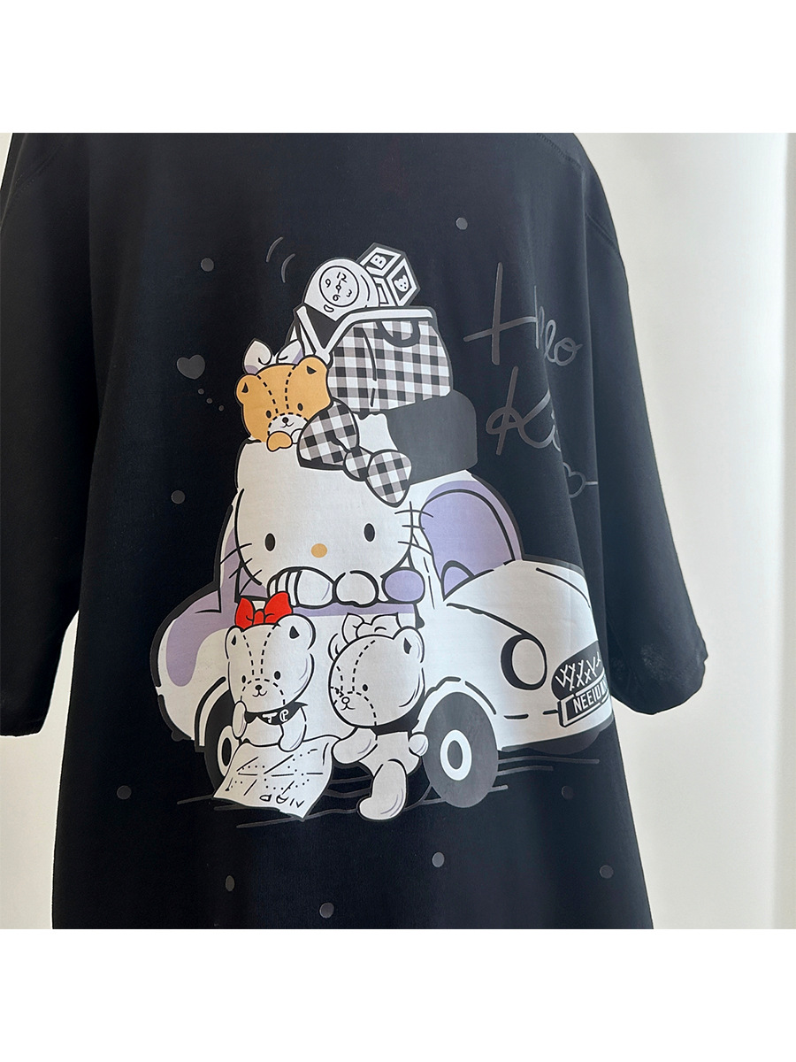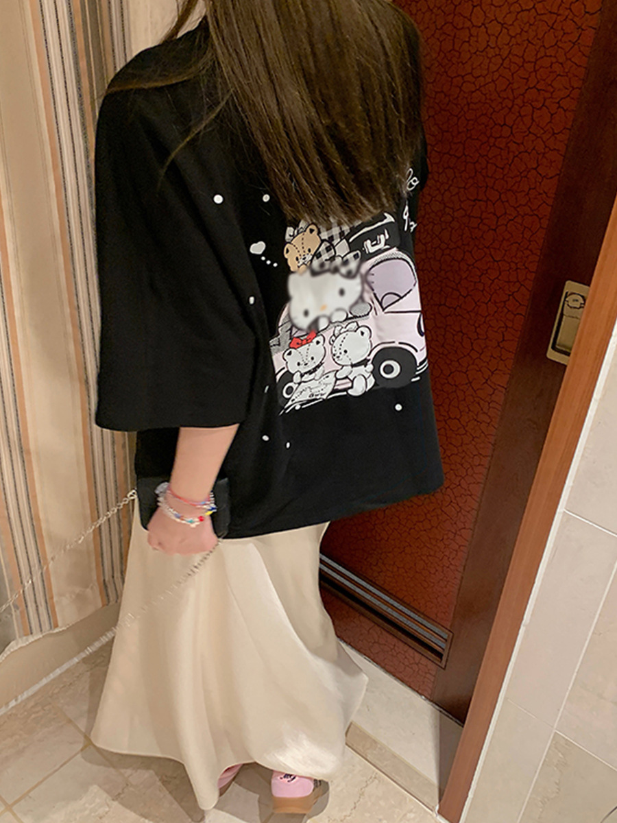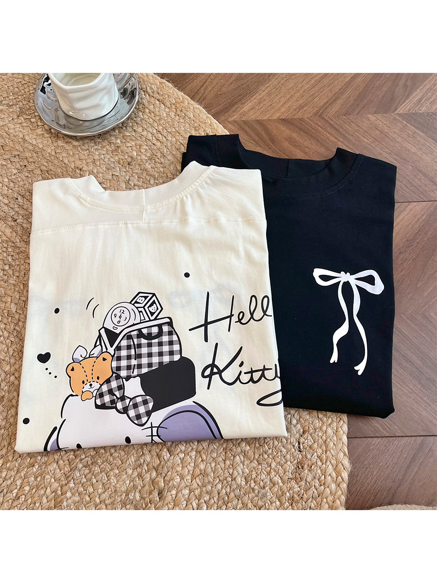 Aaaaxbb 귀여운 키티 코튼 티셔츠 오버 사이즈 귀여운 프린트 루즈 라운드 넥 올 매치 쇼트 슬리브 여성스토어 가기